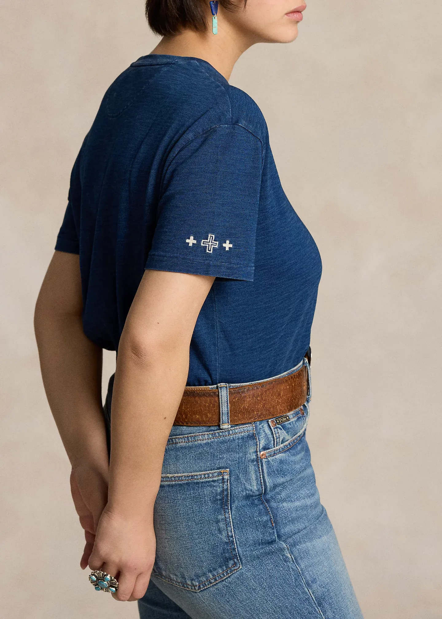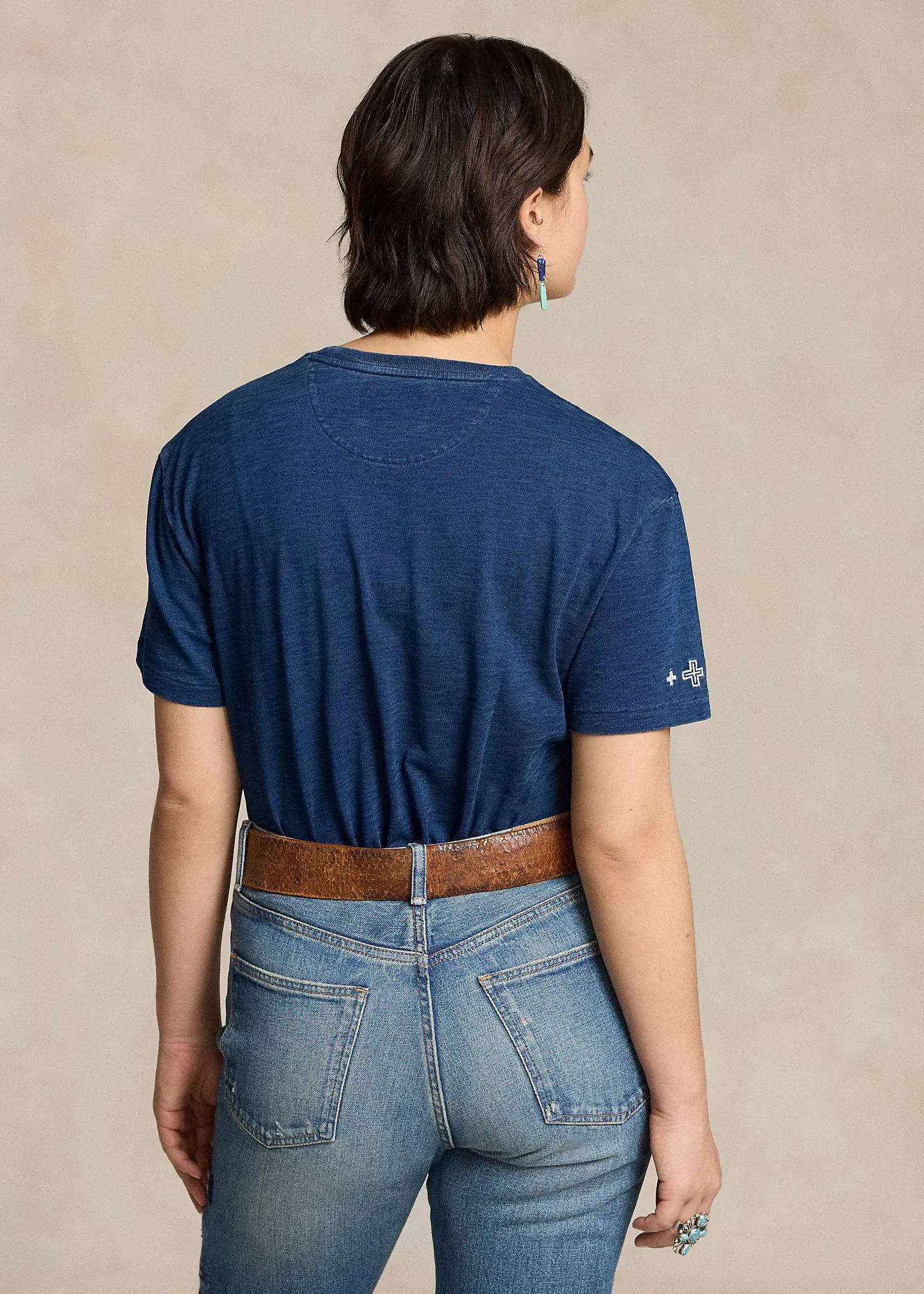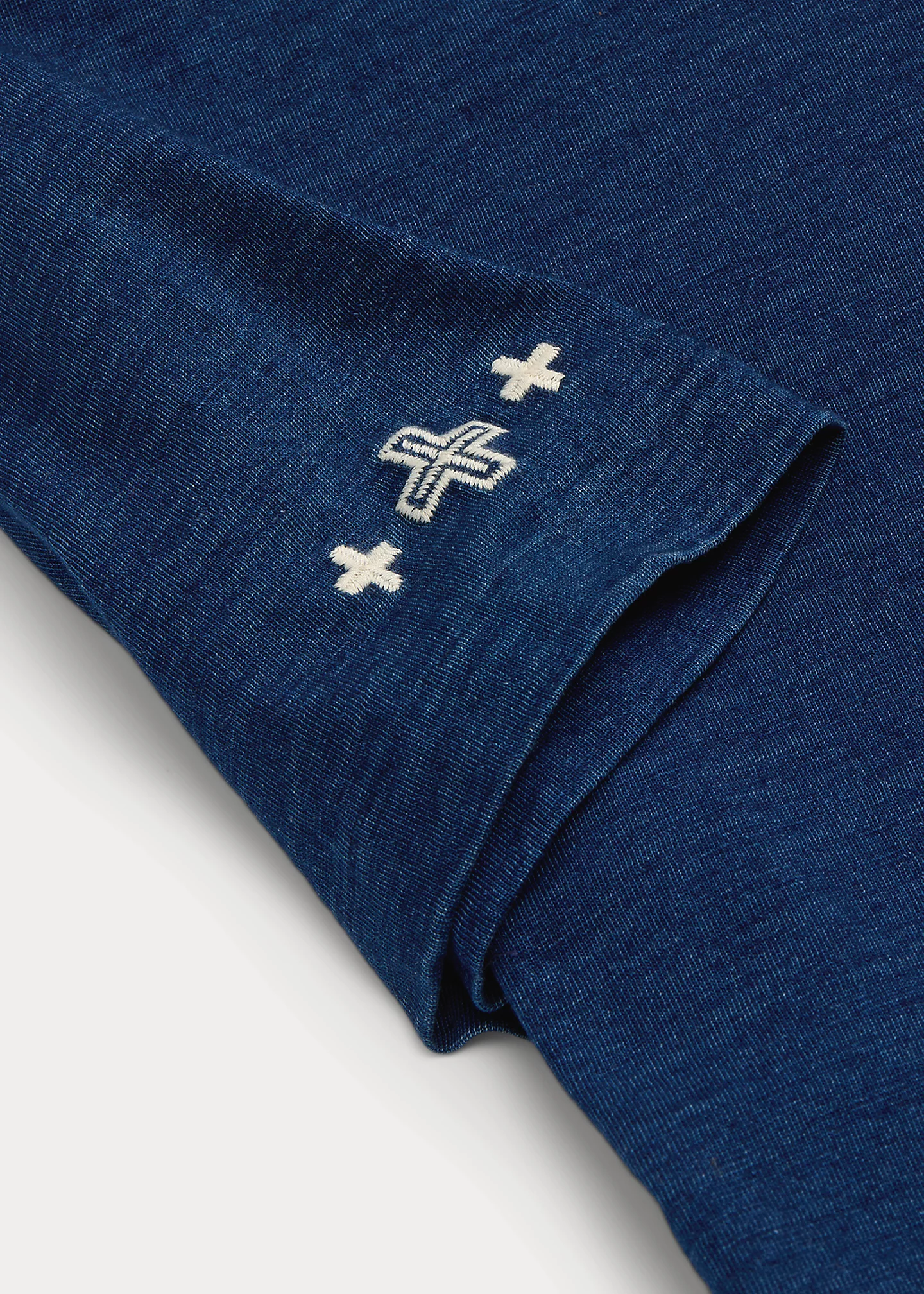 - Crewneck with custom wedge weave–patterned trim at the interior. Short sleeves. Four-directional crosses embroidered at the right sleeve.