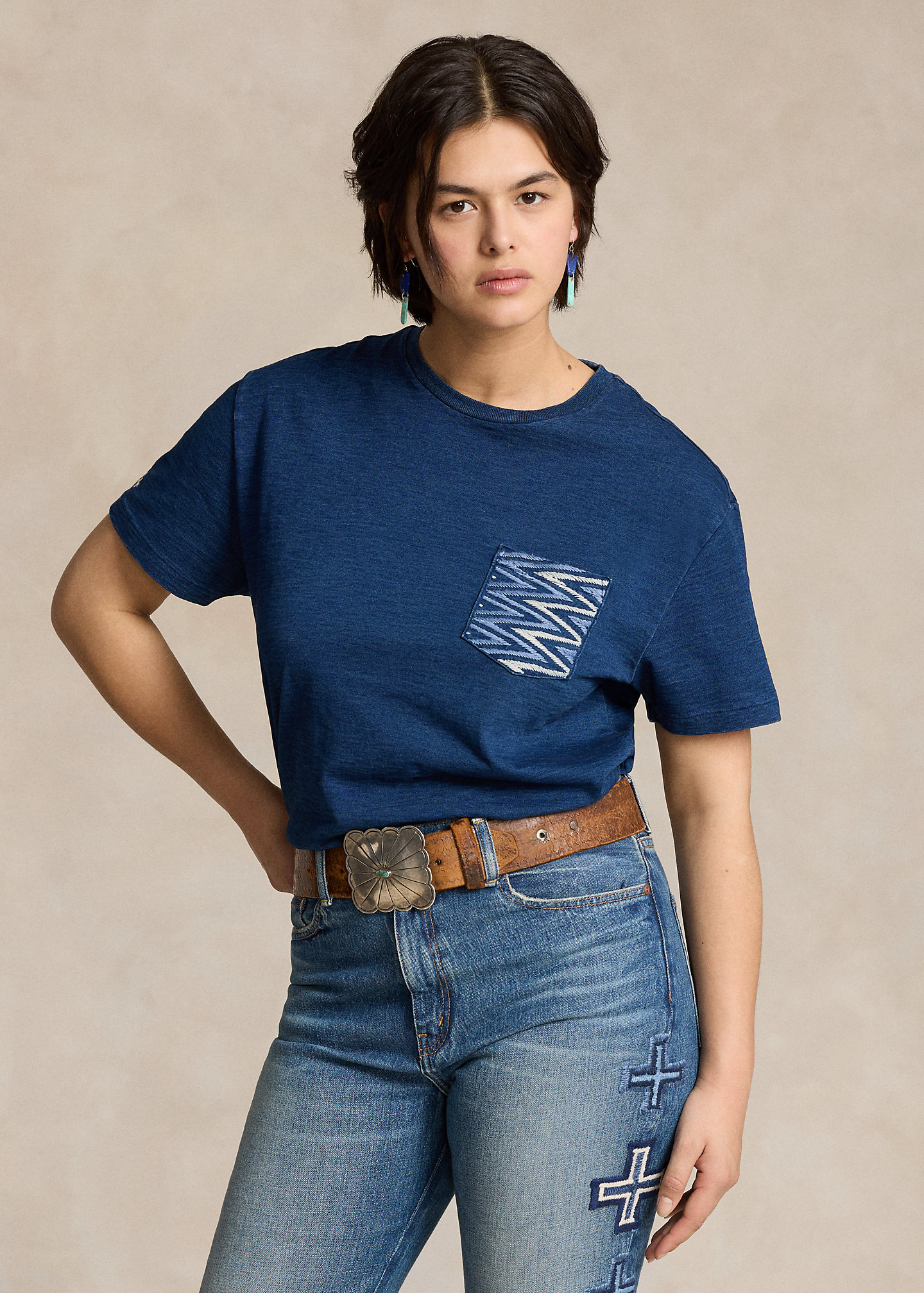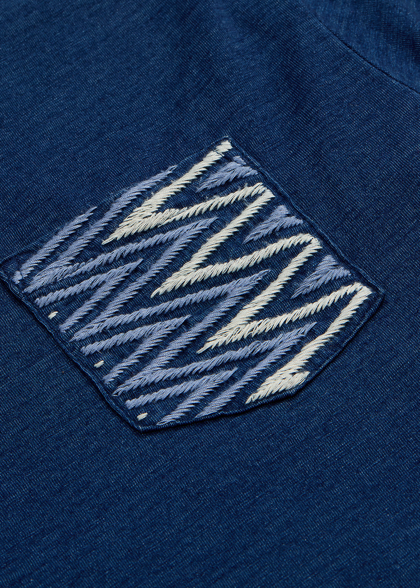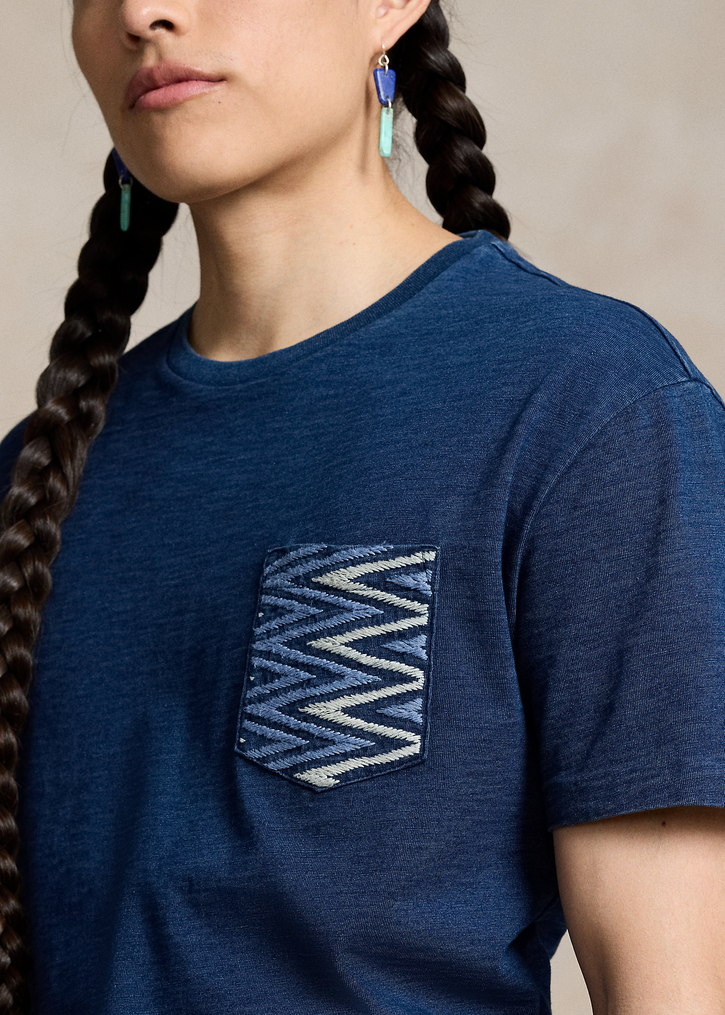 - Crewneck with custom wedge weave–patterned trim at the interior. Short sleeves. Four-directional crosses embroidered at the right sleeve.