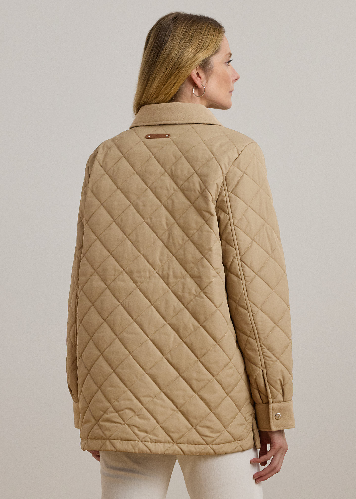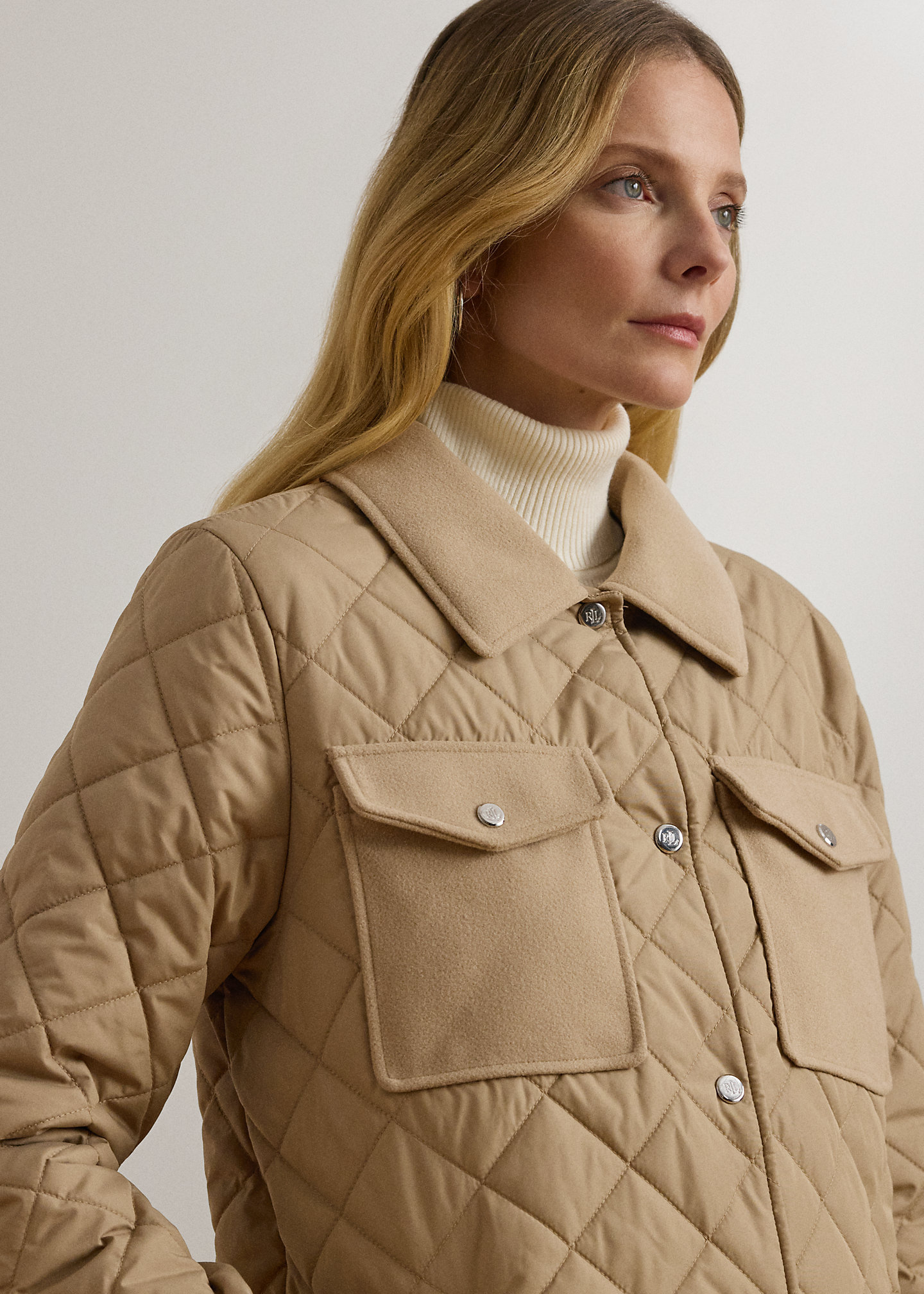 - Faux-wool spread collar. Snapped placket. “LRL”-engraved metal snaps.