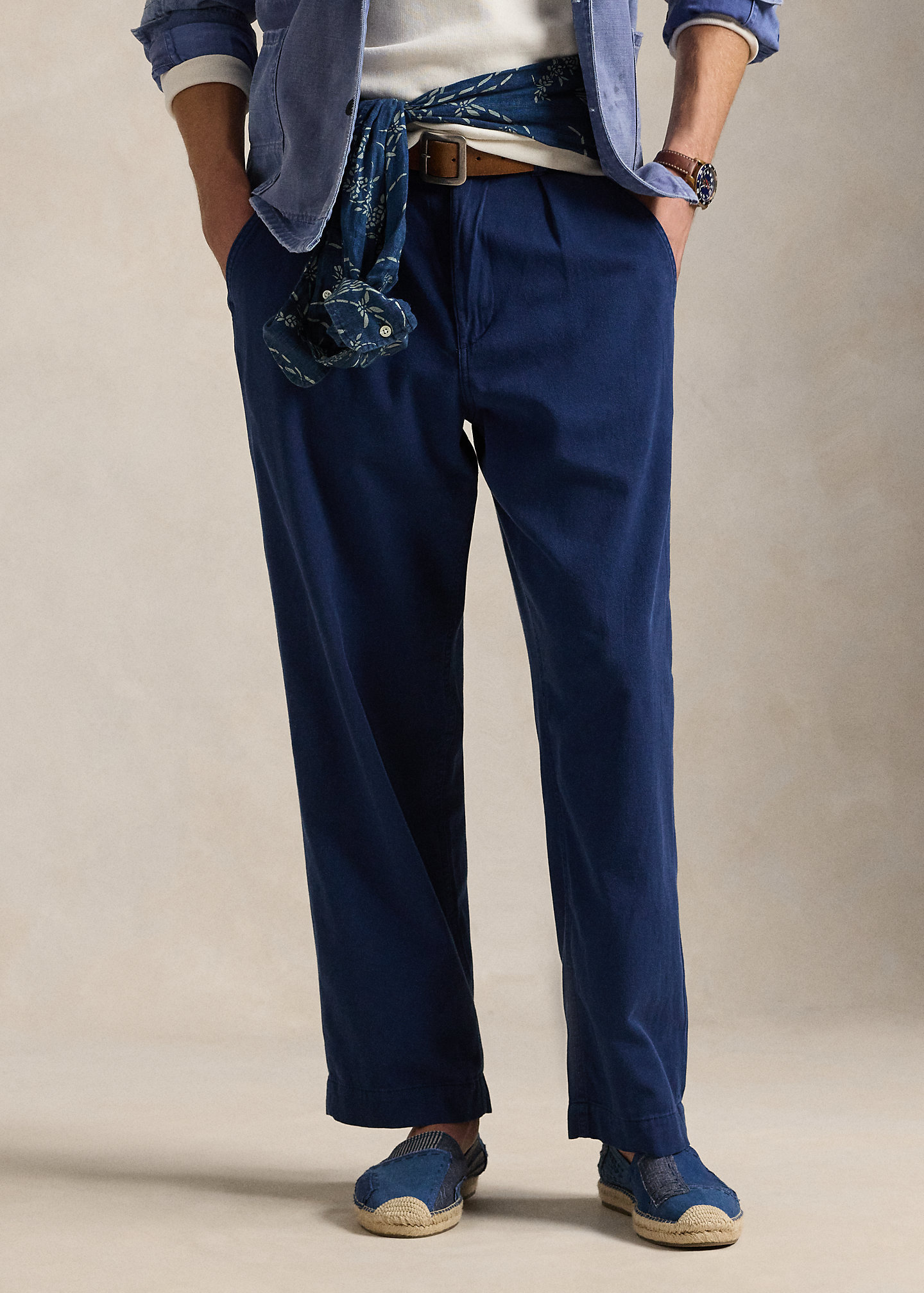 - Relaxed Fit Pleated: sits at the waist. Relaxed through the leg.
