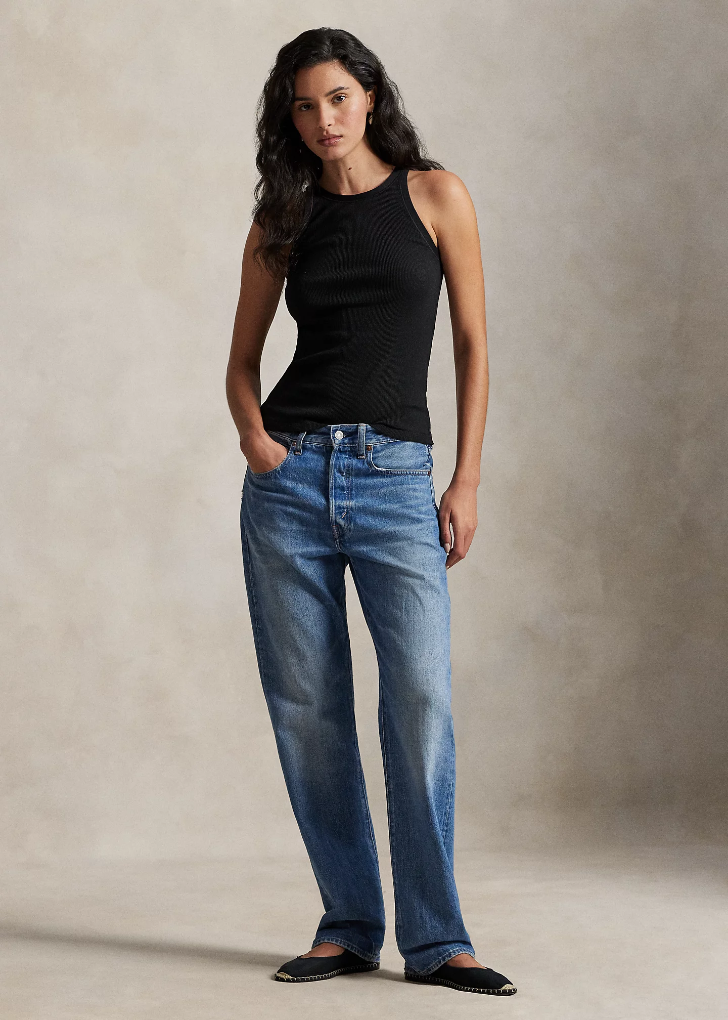 - Slim, straight fit. Intended to hit at the hip.