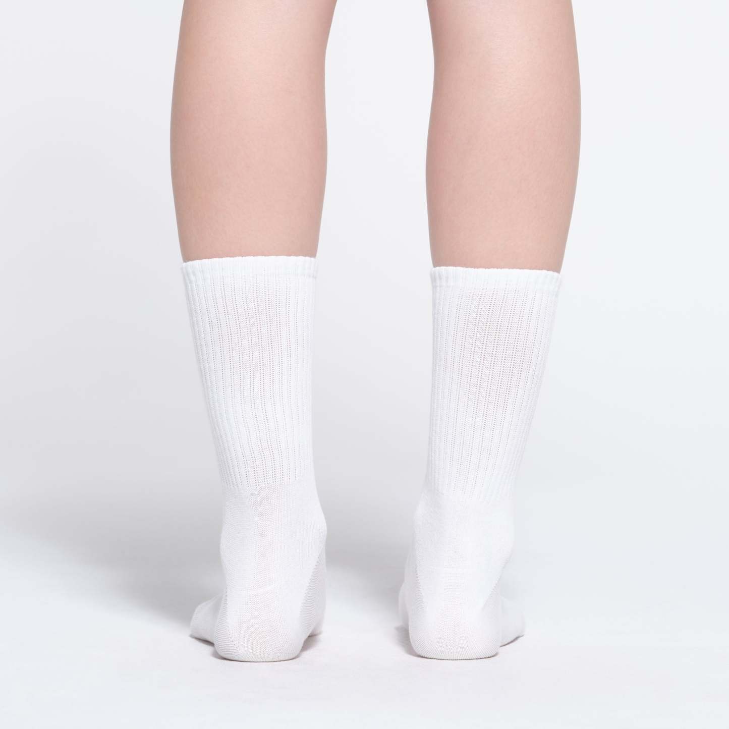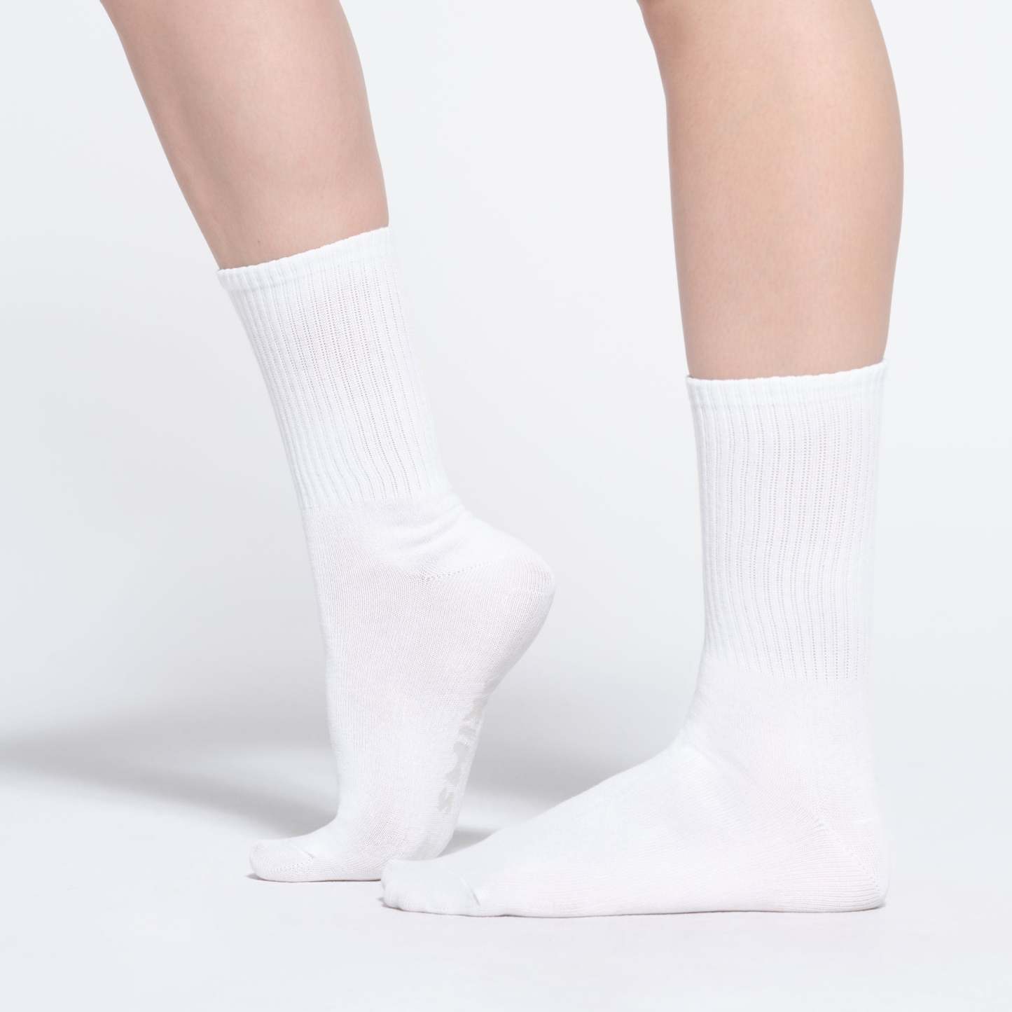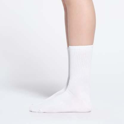 - Hits at lower-calf, Mid-weight cotton-elastic blend, Seamed toe, Ribbed knit cuff, Cushioned soles, Knitted SKIMS logo at bottom of foot, Perfect comfort in flat shoes or trainers