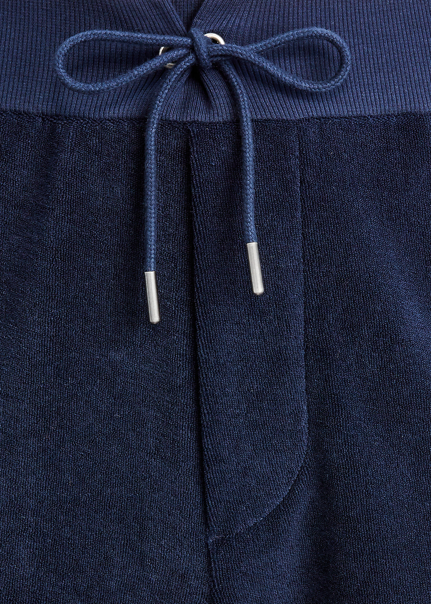 Ribbed drawstring waistband. Sewn fly.