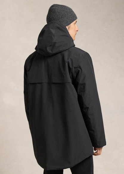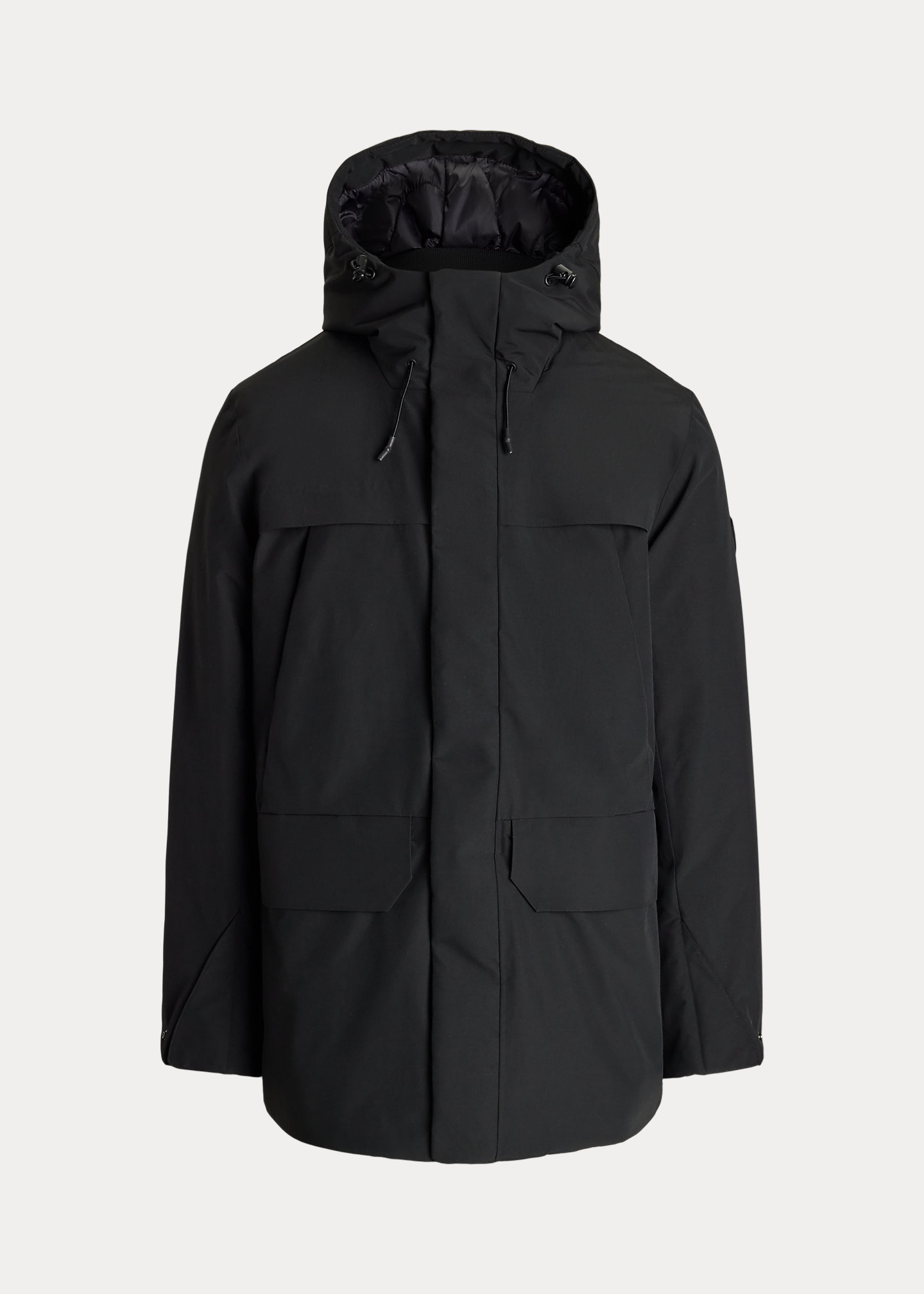 - Drawcord hood. Interior ribbed mockneck. Two-way full-zip front. Snapped storm placket.