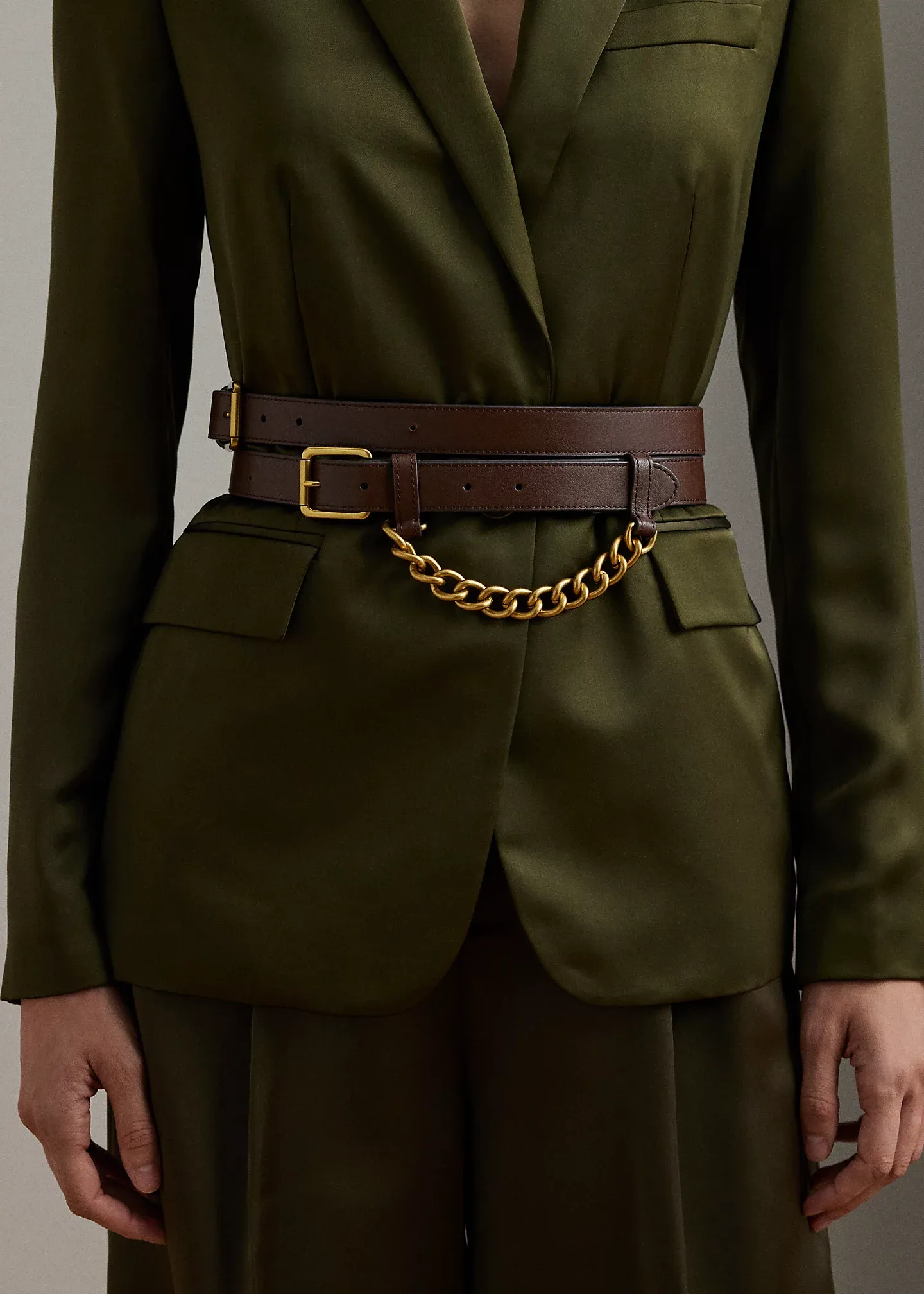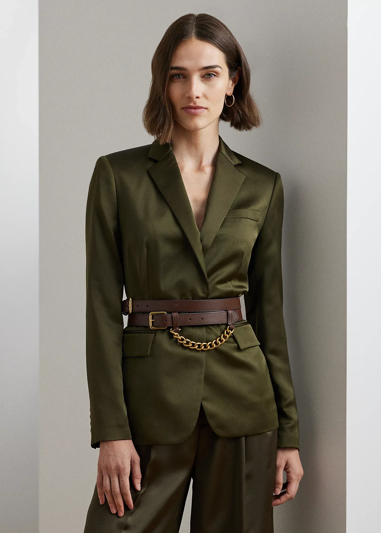 - Notch lapels. Single-button silhouette. “Lauren Ralph Lauren”–engraved corozo button.