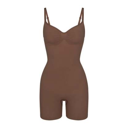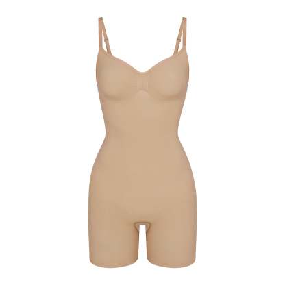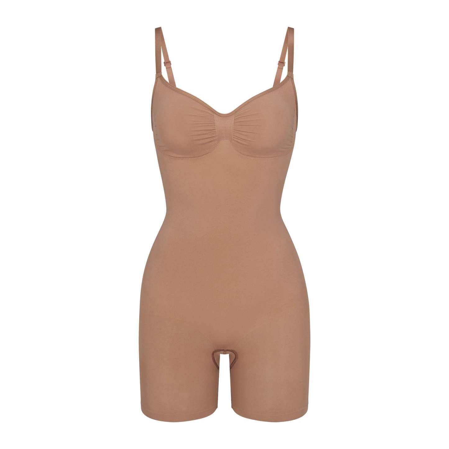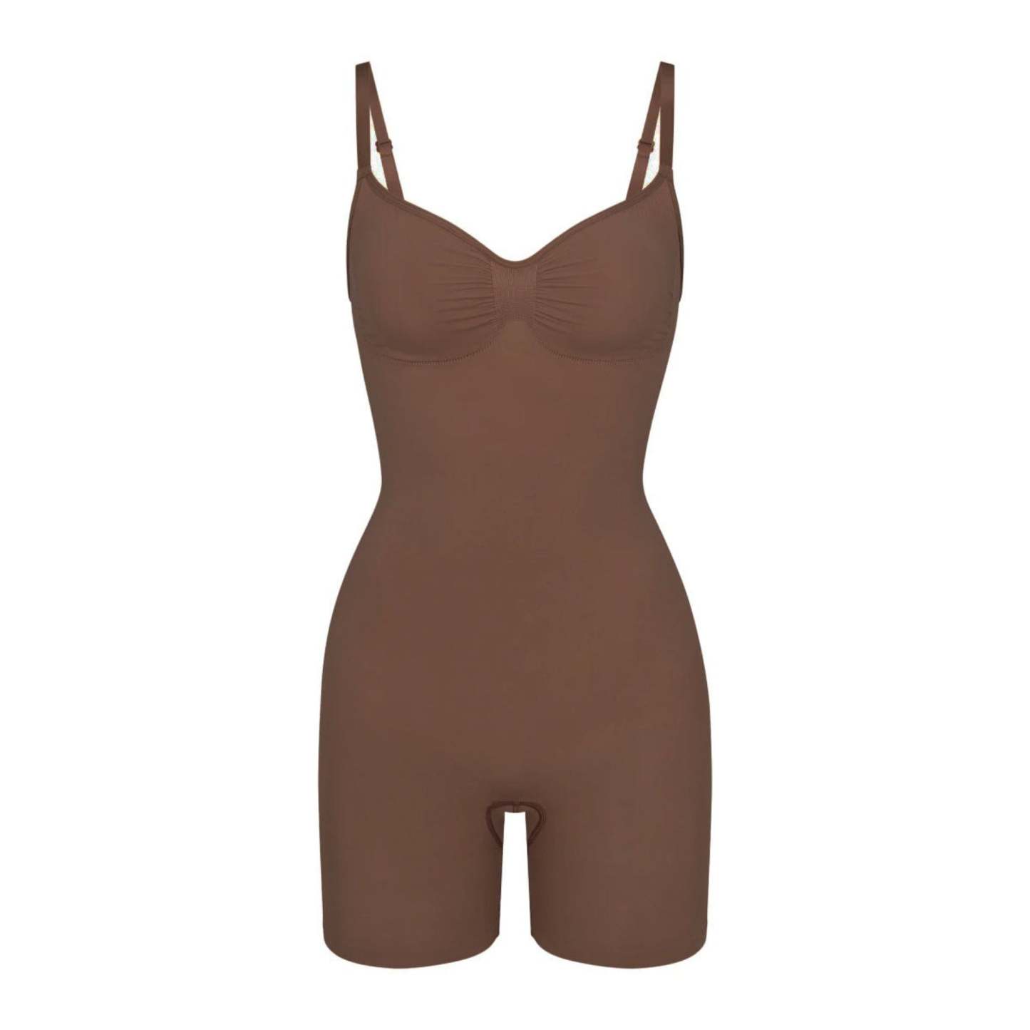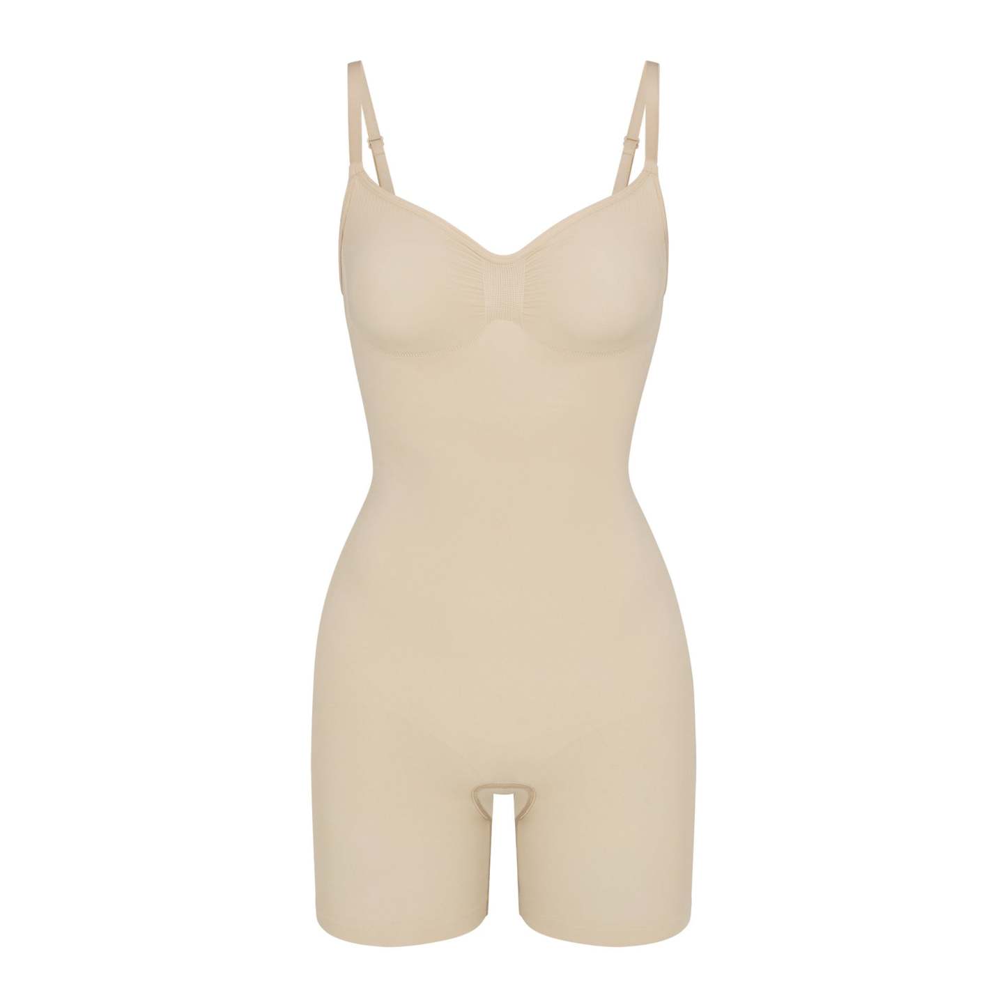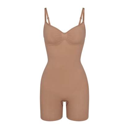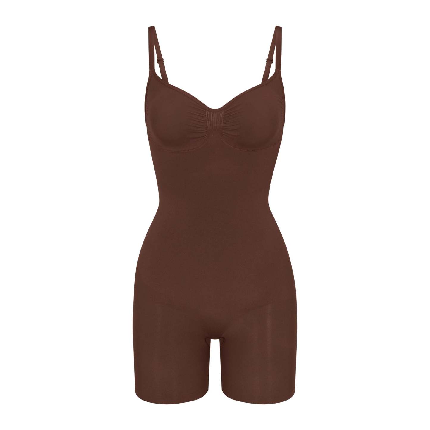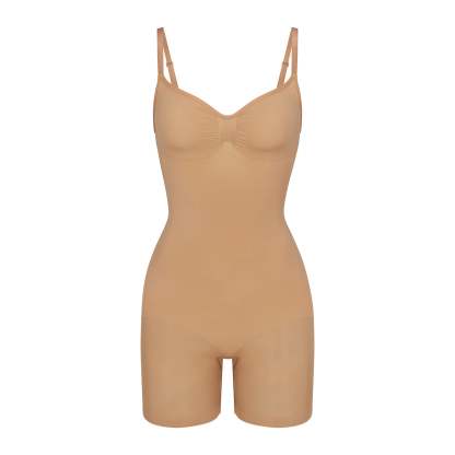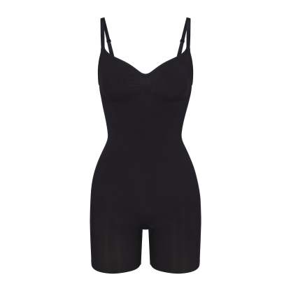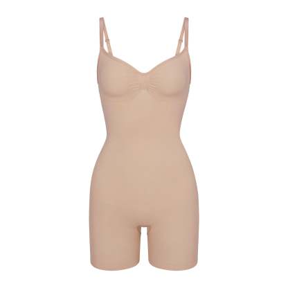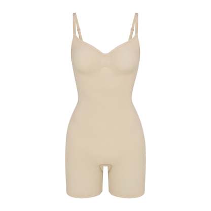 The sculpting bodysuit all over your feed, updated for an even better fit. Wear this mid thigh bodysuit for strong compression and targeted control along the waist, tummy, and legs, plus butt-enhancing pockets for a lifted look. Features front pique stitching along the front and sides for a defined and supported bust, adjustable straps, a wide crotch for added coverage, and an open gusset. Fits true to size. Also available in petite sizes.