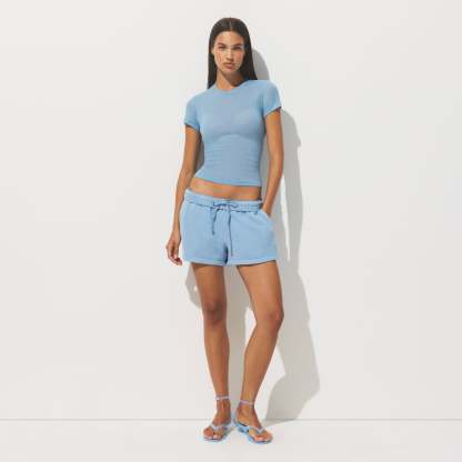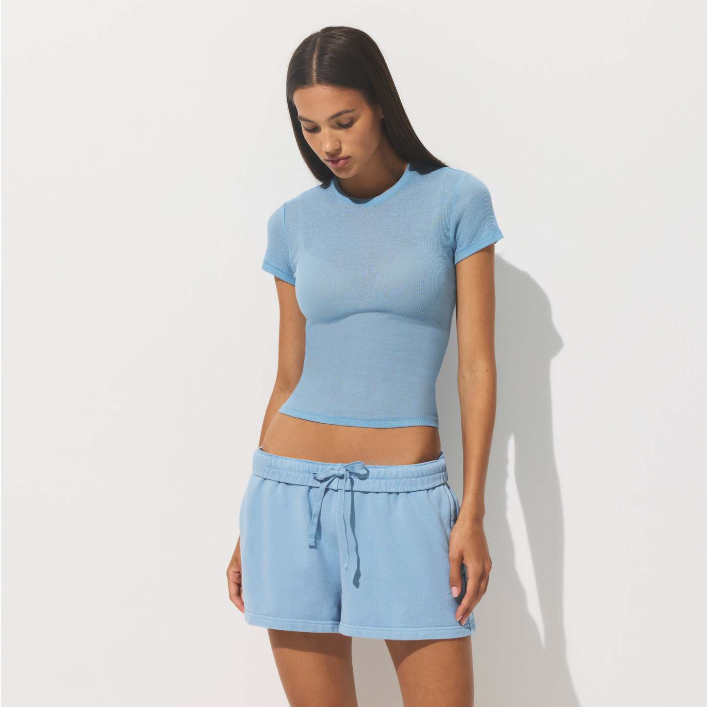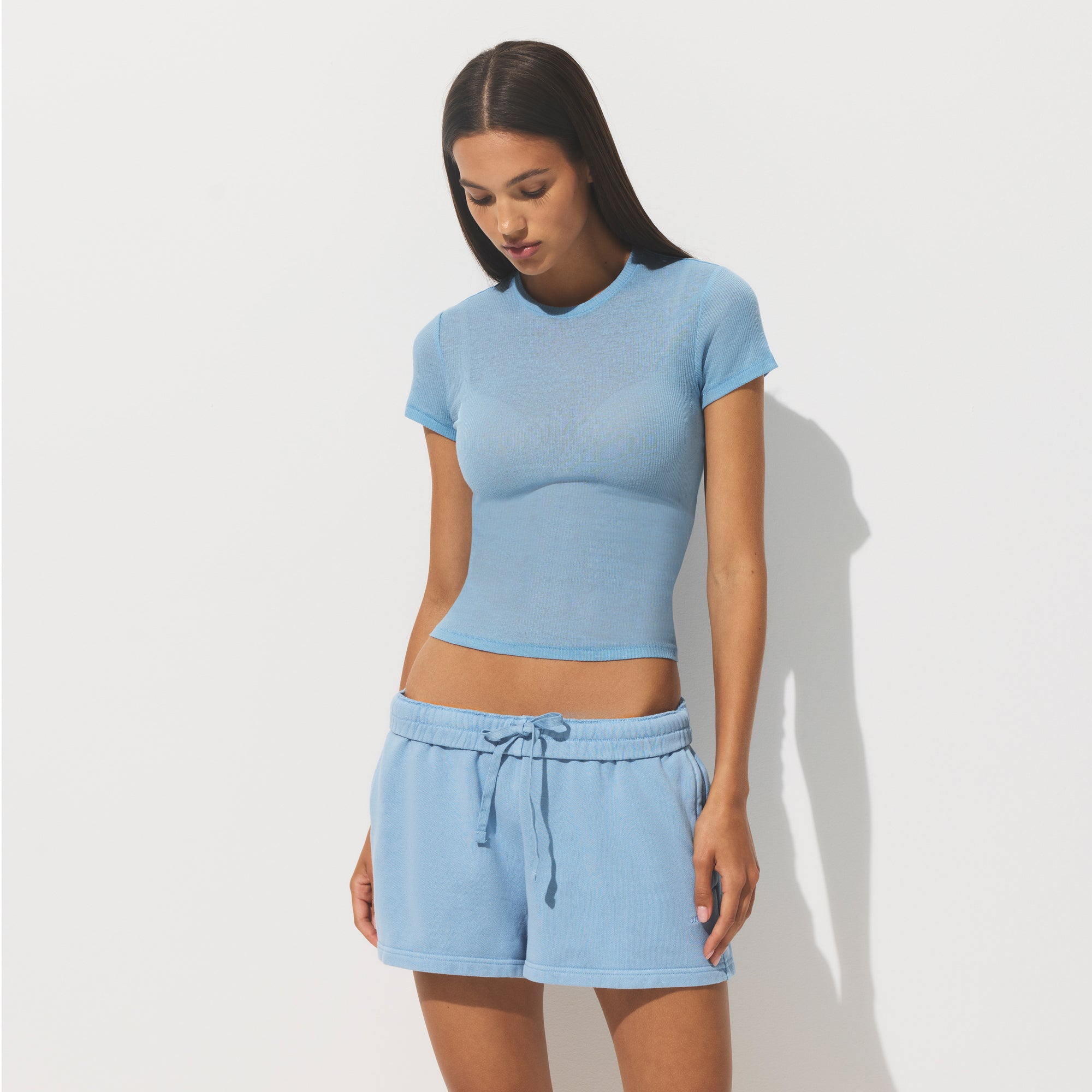 - High crew neckline, Short sleeves, Fits tight to body, Standard length