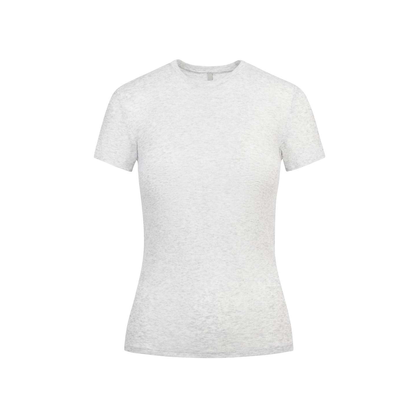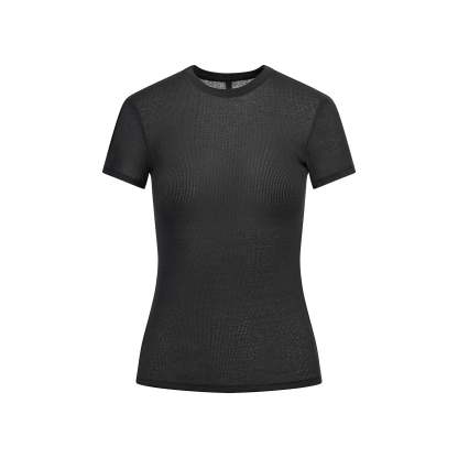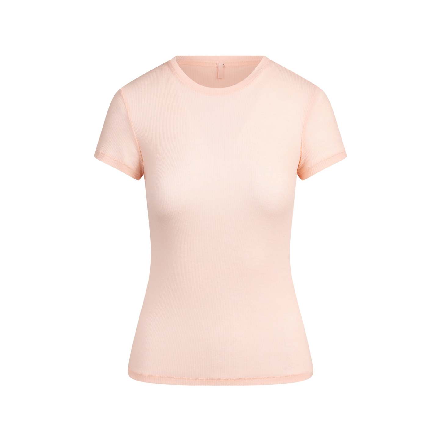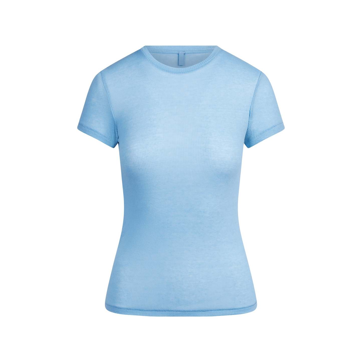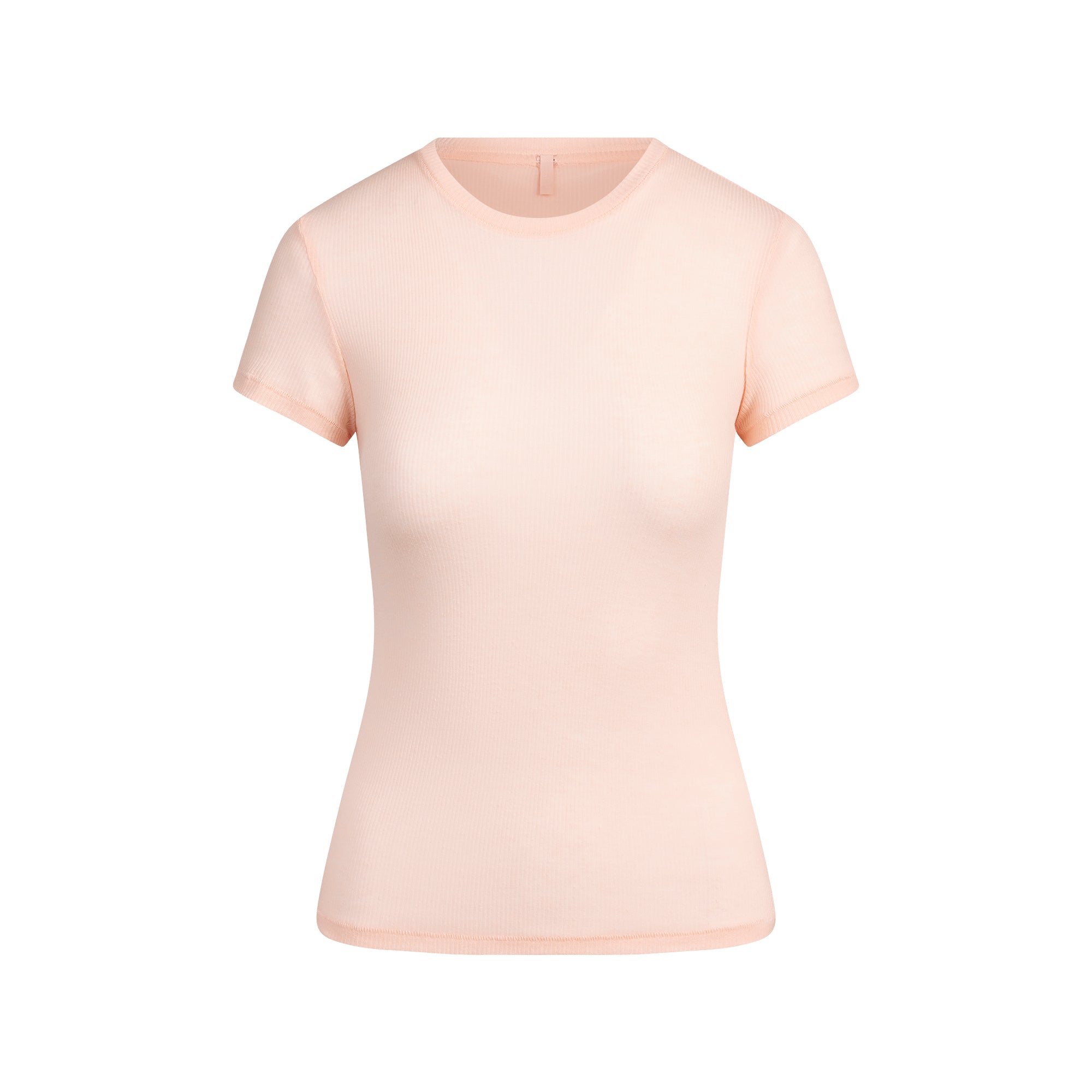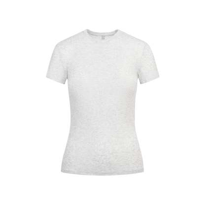 - High crew neckline, Short sleeves, Fits tight to body, Standard length