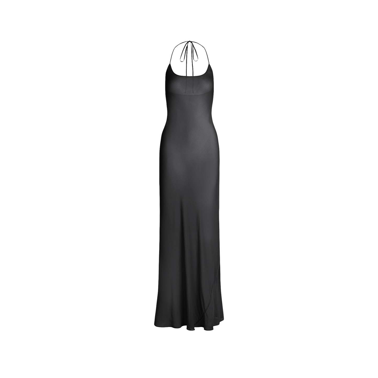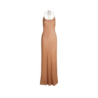 - Scoop halter neckline, Ties at neck, Dipped low back, Fit with ease, Long length