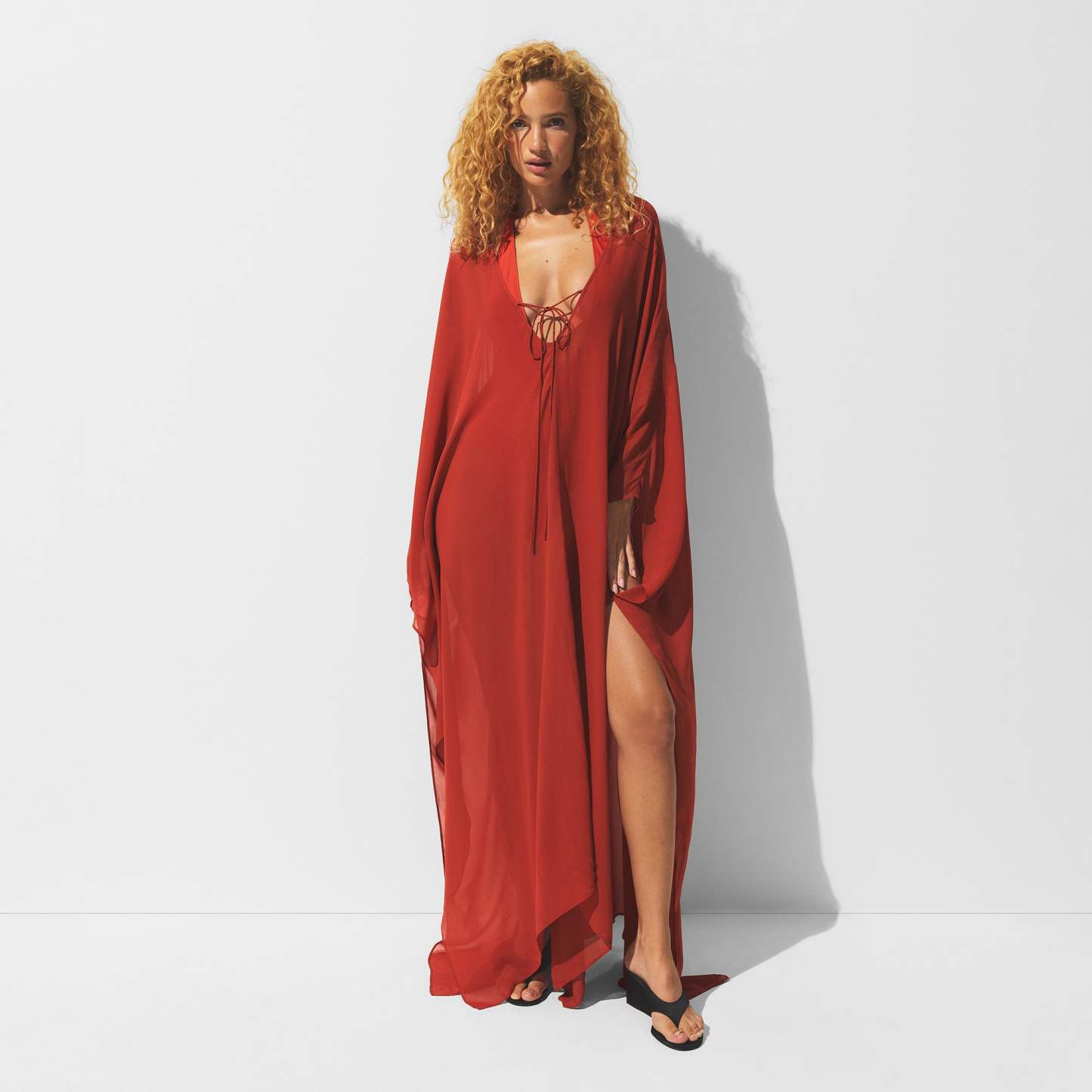 Effortless and elevated. This long kaftan cover-up is made with sheer, lightweight viscose for a luxe layered statement. Features a deep plunge neckline, center tie, and side openings. Fits true to size.