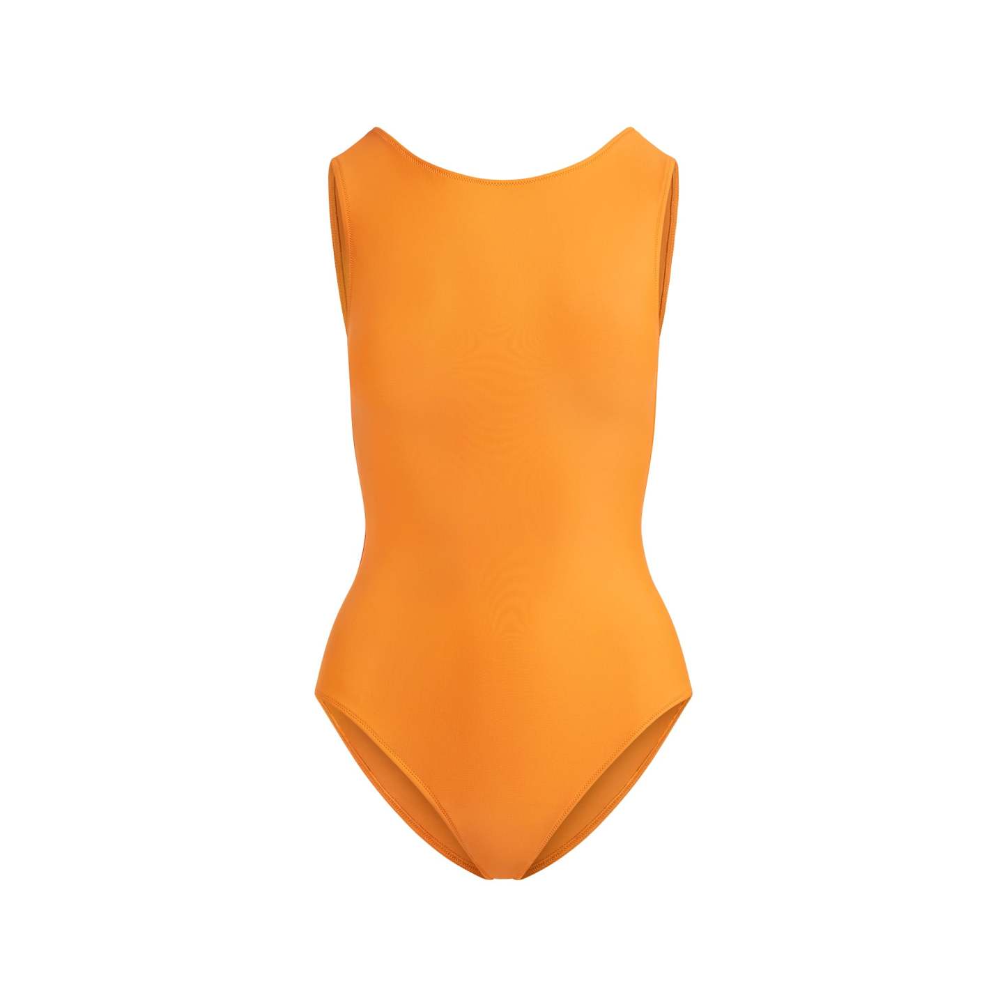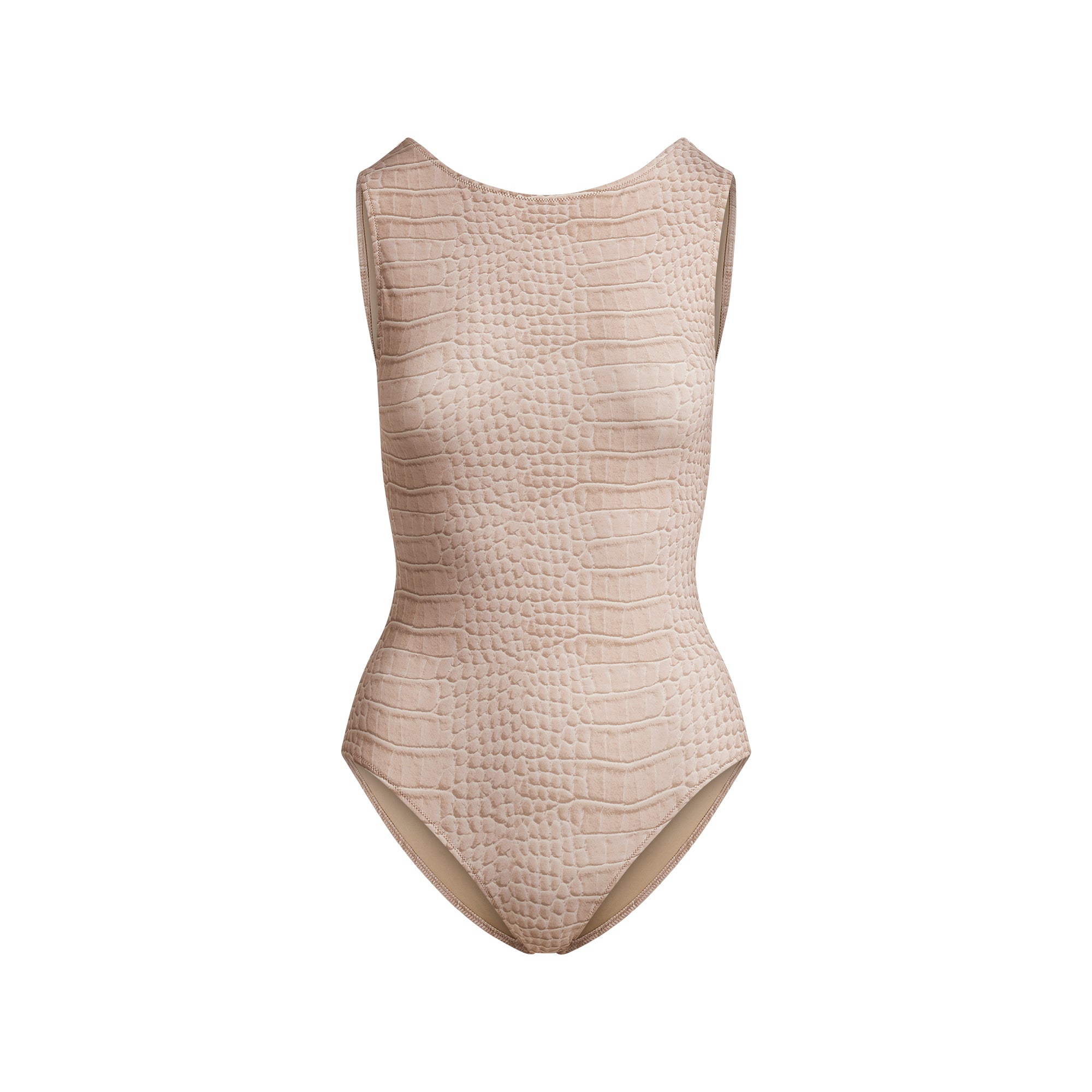 - High neckline, Low scoop back, Matte hardware branding at back, Brief coverage