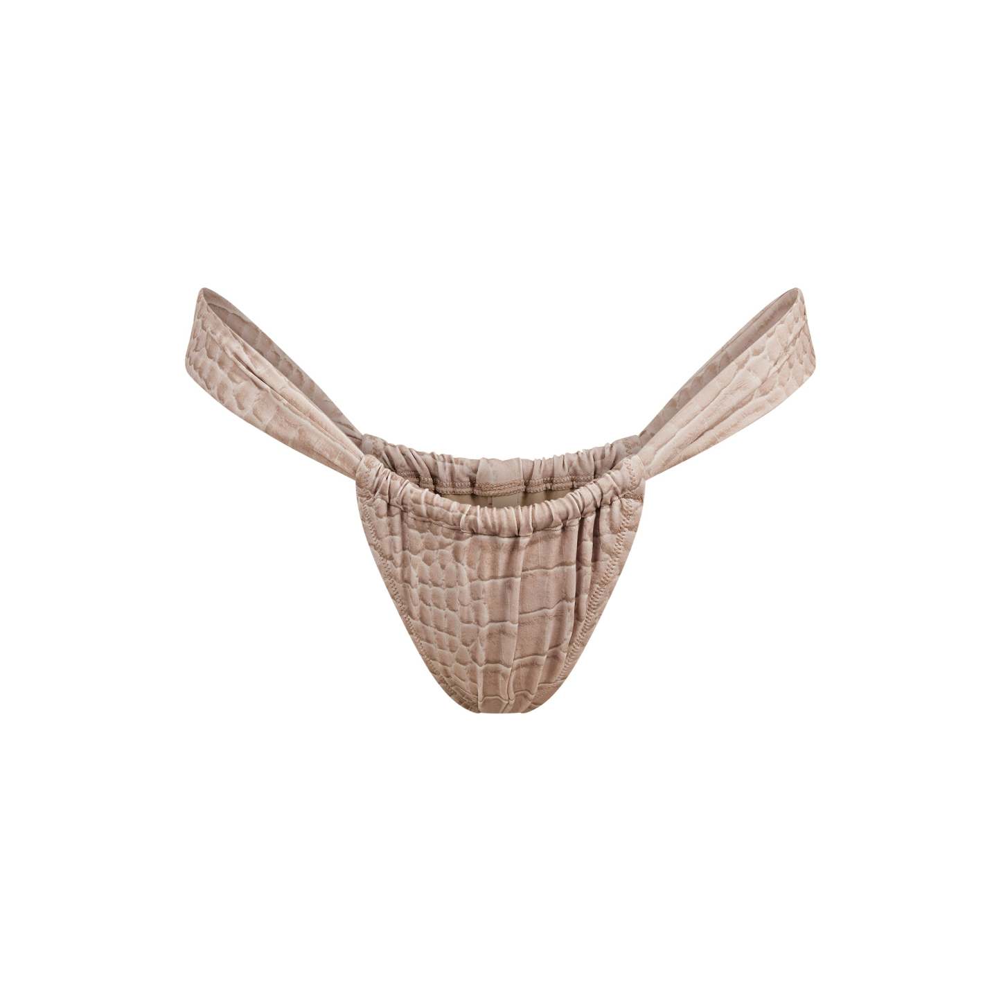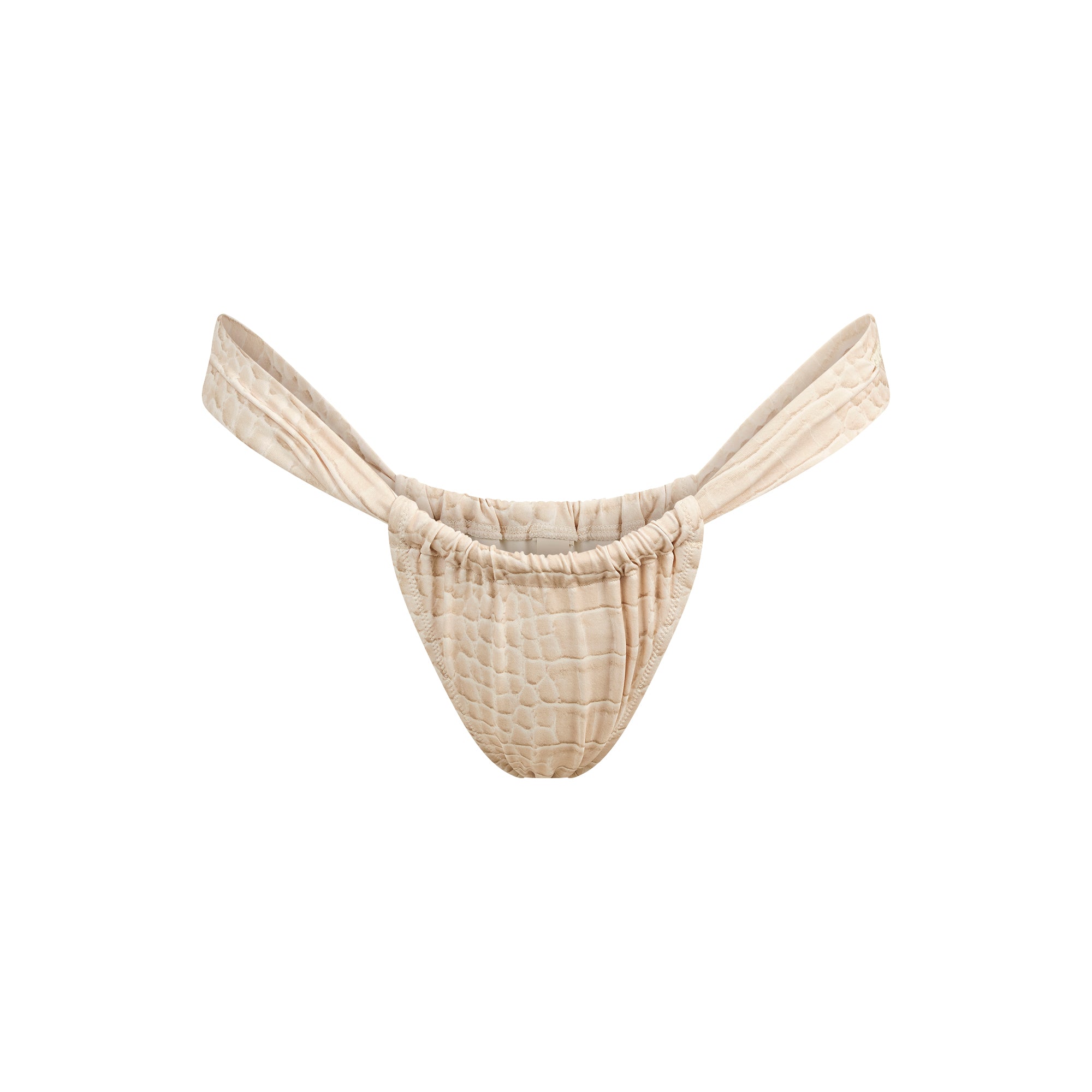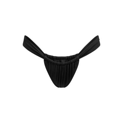 Bare it all. Made with our game-changing swim fabric, this thong swim style features sexy ruching and matte hardware logo branding at the straps. Fits true to size.
