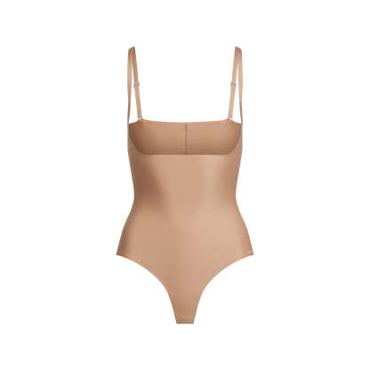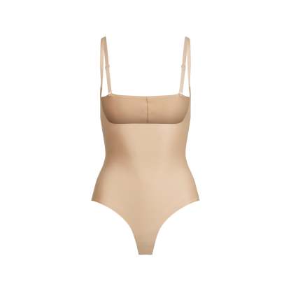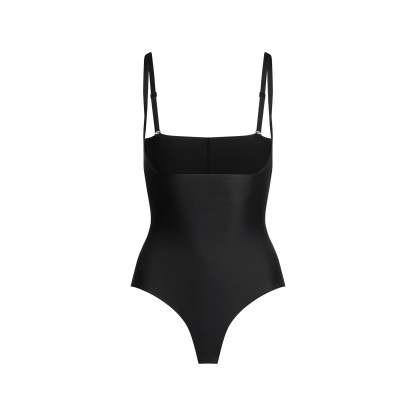 Shrink your waist up to two inches. This shapewear bodysuit is designed in our signature SKIMS Body fabric with targeted core compression and tummy-flattening technology. Features an open bust silhouette to pair with your favorite SKIMS bra and a thong back for a seamless look under clothes. Complete with snaps at the gusset, convertible, adjustable straps, and a raw cut leg opening. Fits true to size.