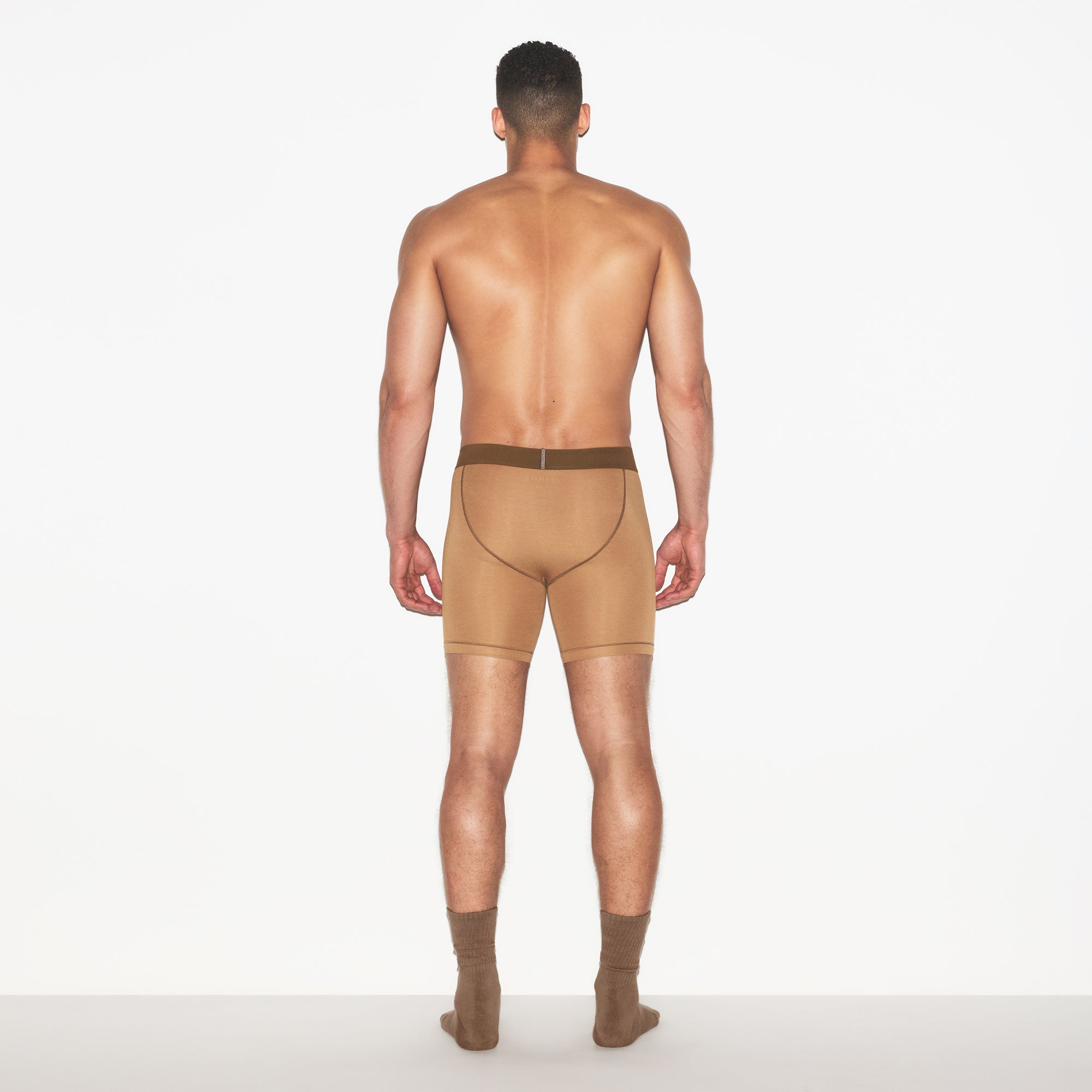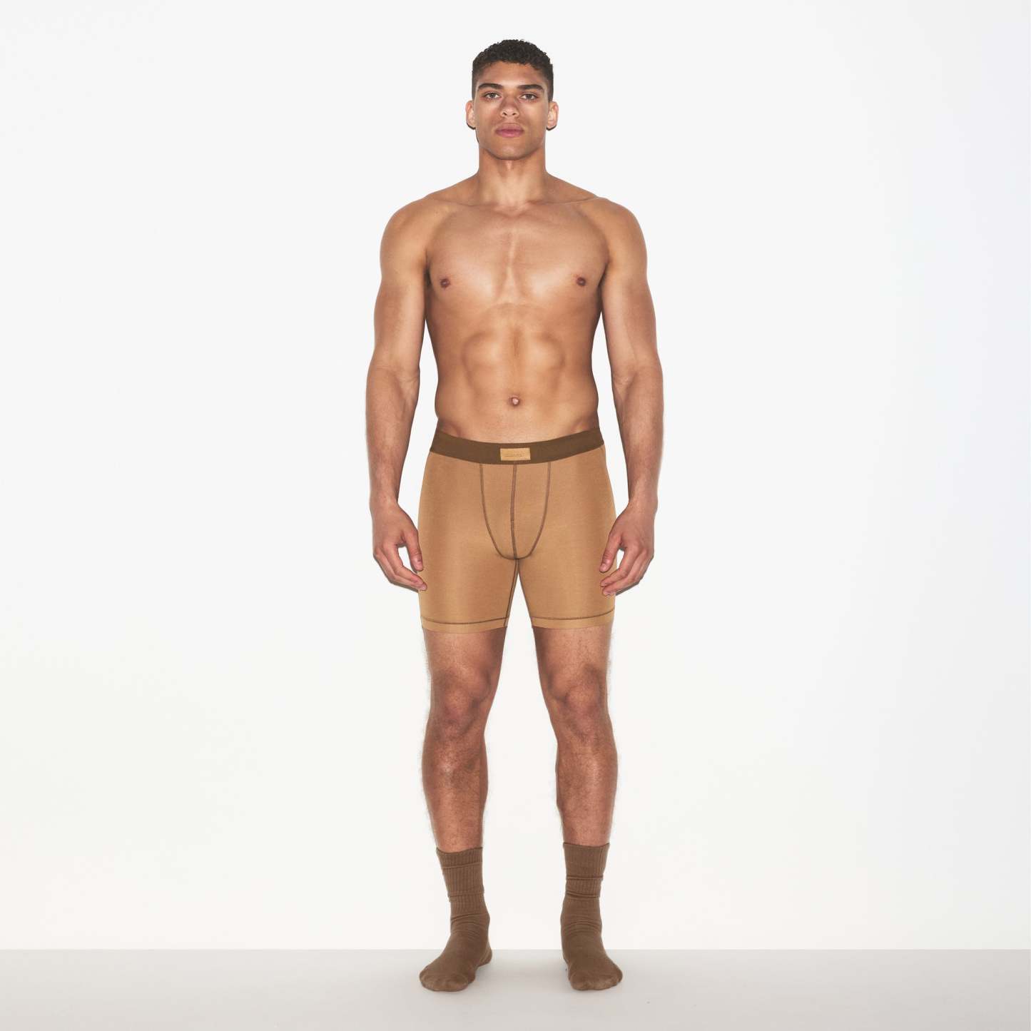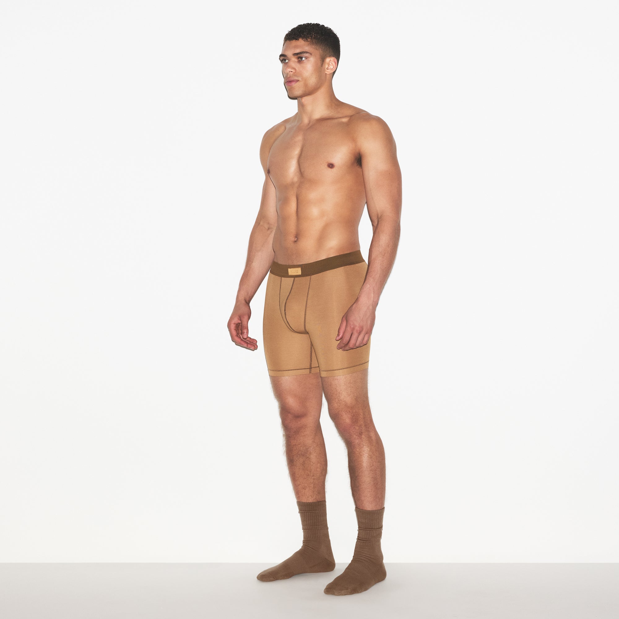 - Breathable mid-weight Cotton, Spandex for recovery and stretch, SKIMS branding on exterior waistband, Engineered pouch and gusset for comfort, Features a 5" inseam
