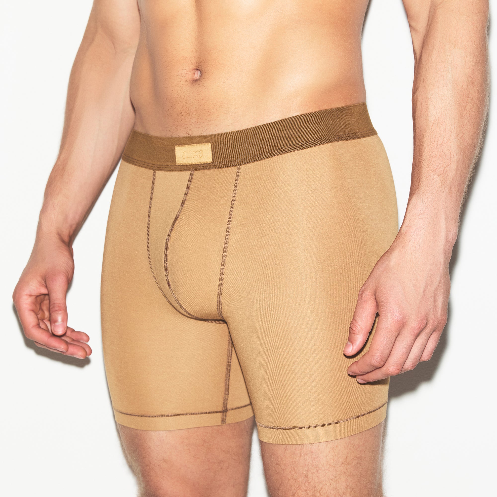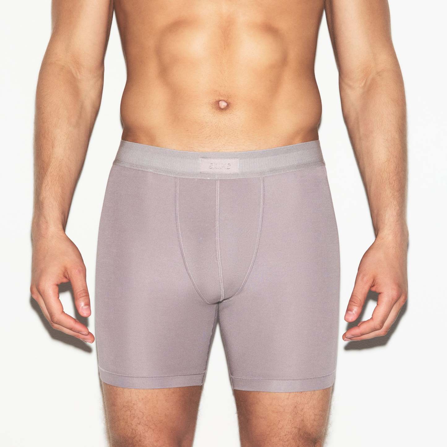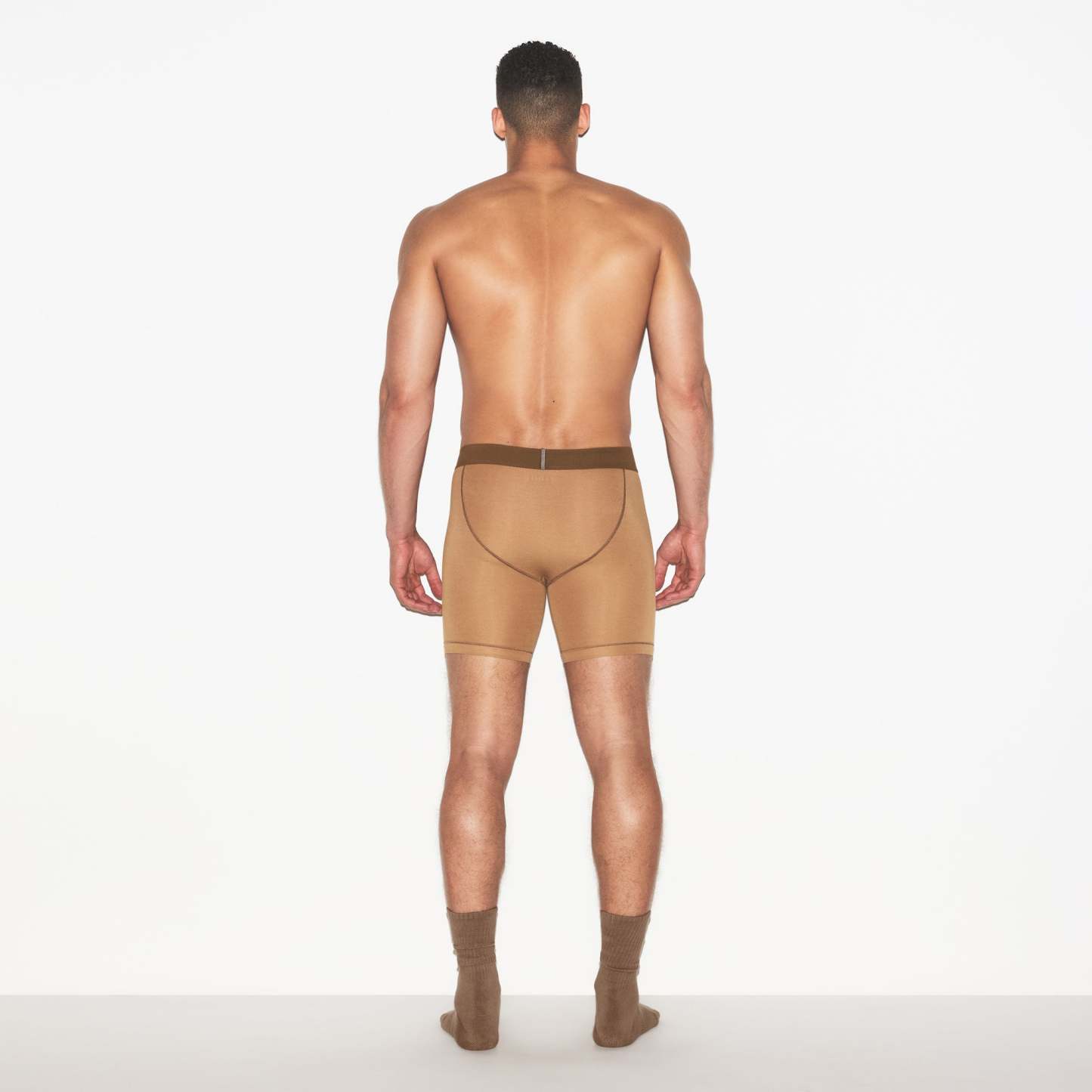 - Breathable mid-weight Cotton, Spandex for recovery and stretch, SKIMS branding on exterior waistband, Engineered pouch and gusset for comfort, Features a 5" inseam