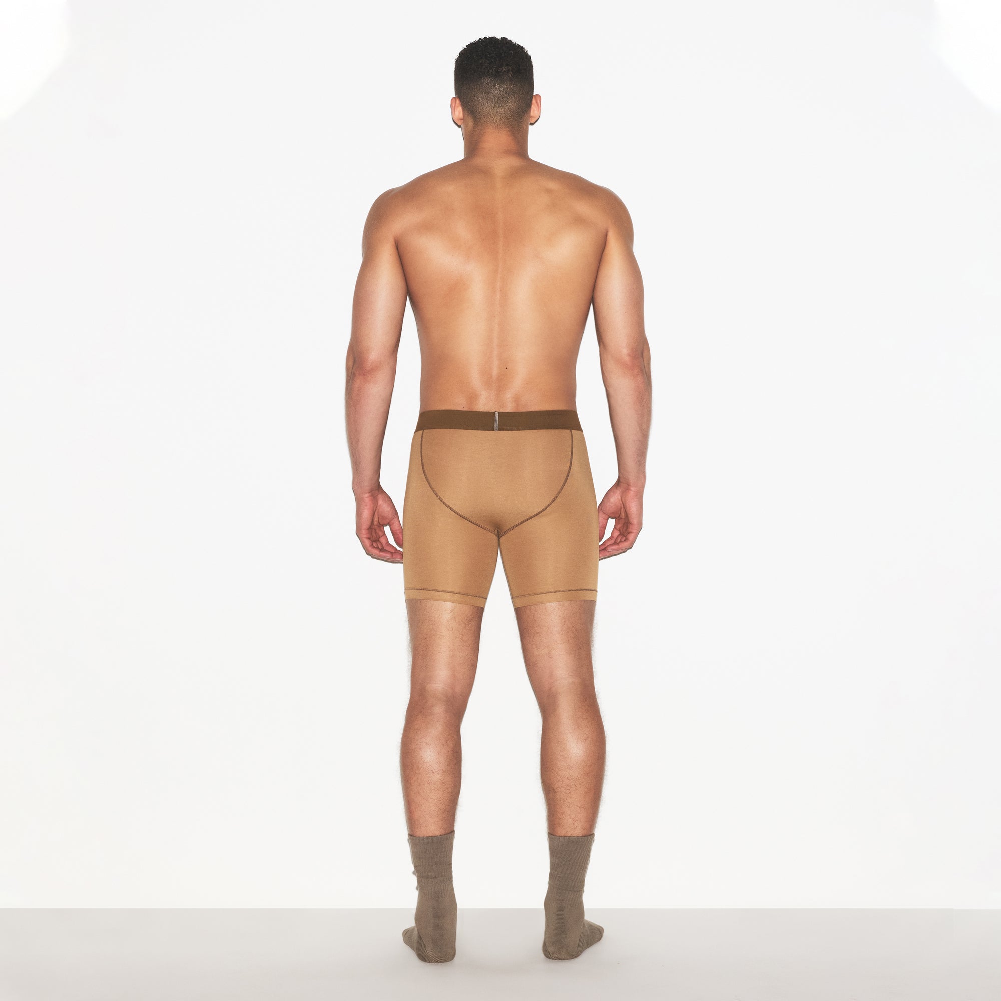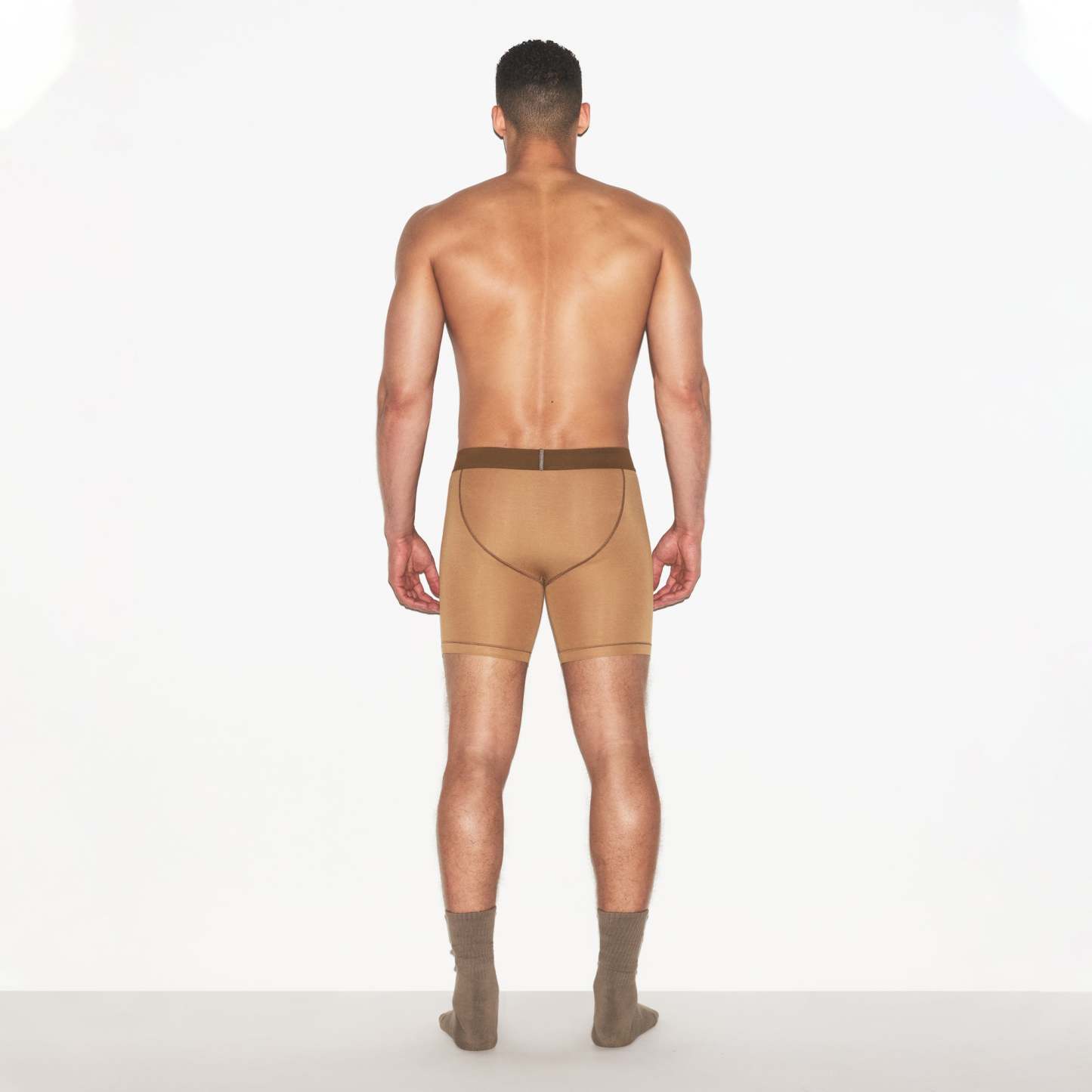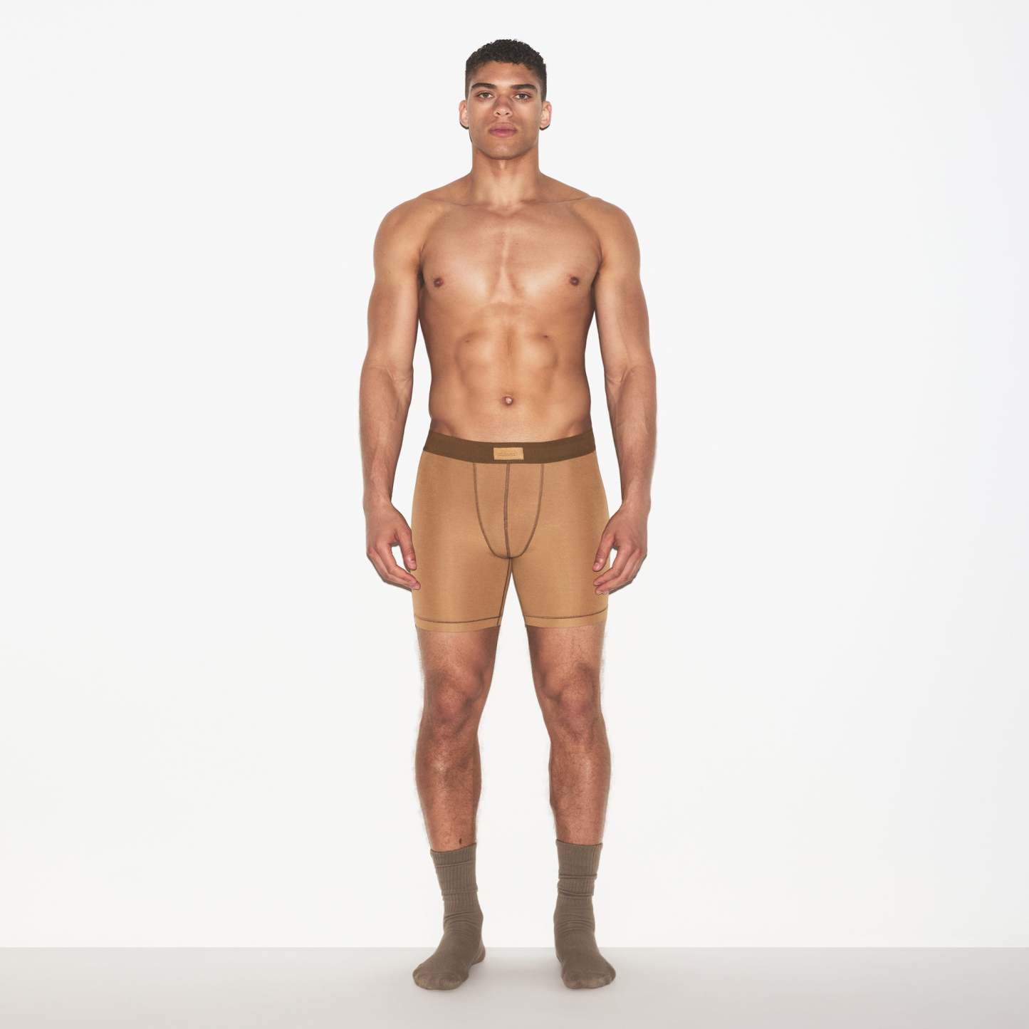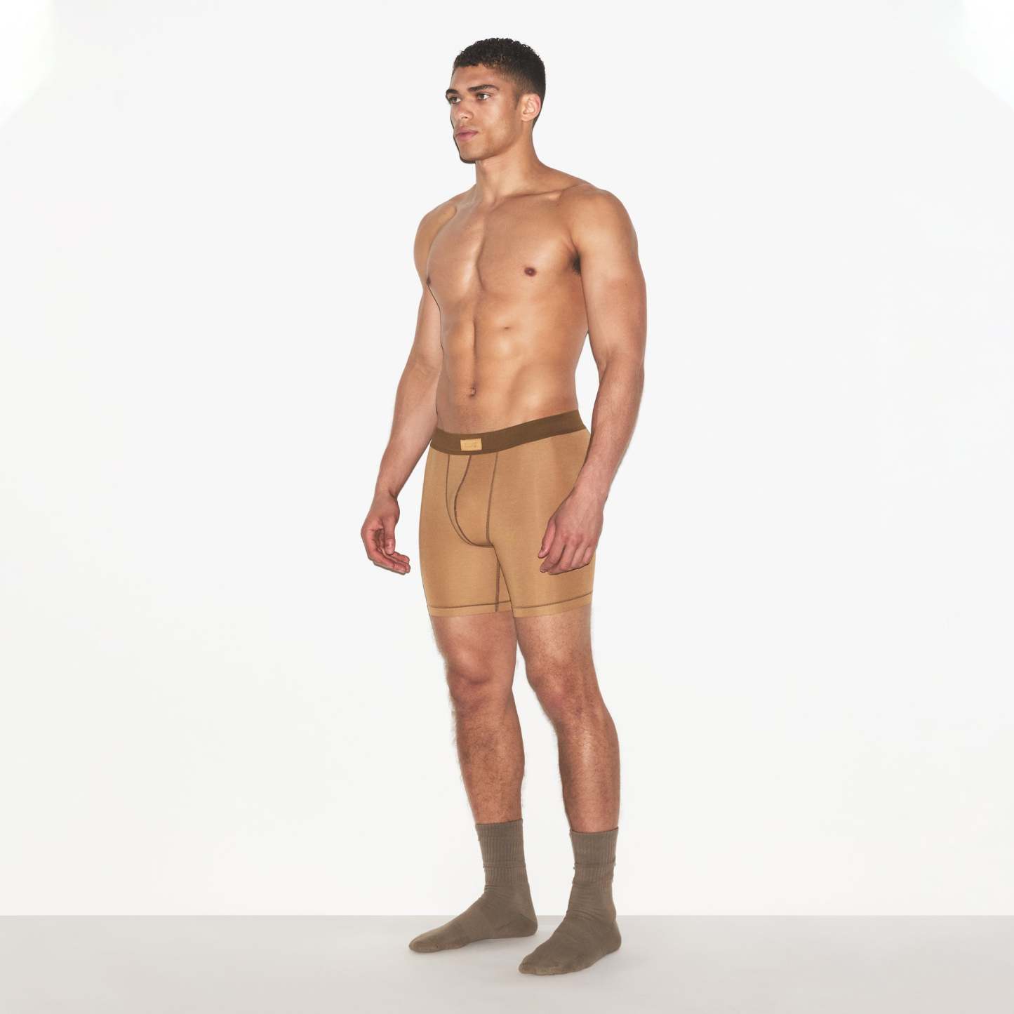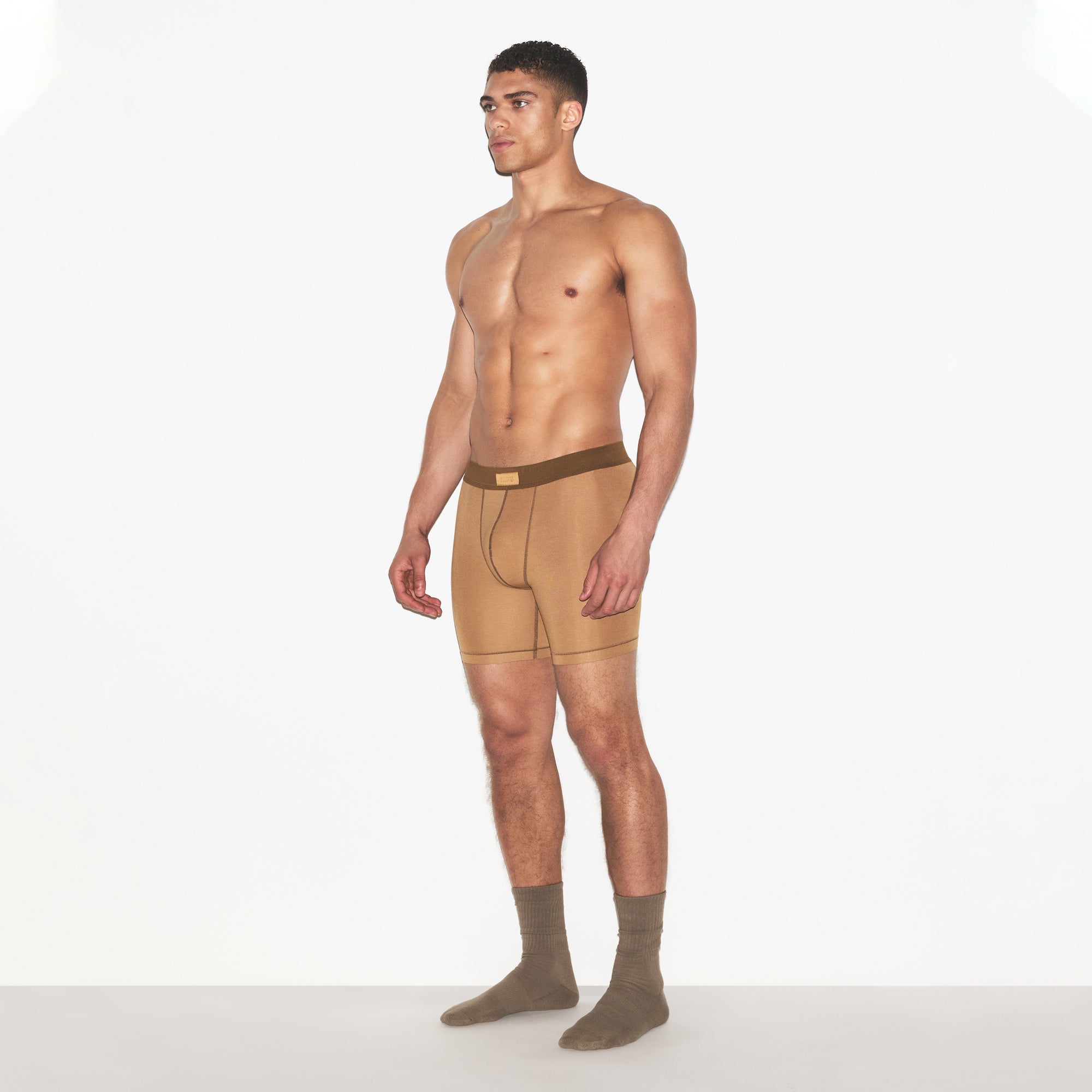 - Breathable mid-weight Cotton, Spandex for recovery and stretch, SKIMS branding on exterior waistband, Engineered pouch and gusset for comfort, Features a 5" inseam