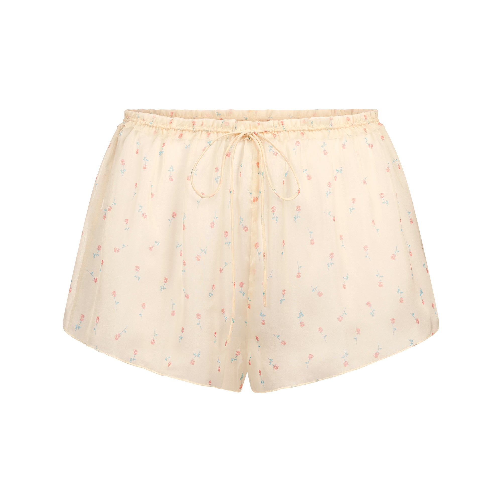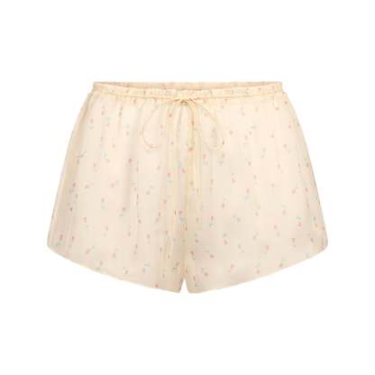 The sweetest set. Designed in 100% silk chiffon, this feminine babydoll and short set includes a bralette with a scoop neckline, thin ties at the neckline and straps, and a flutter hem. The cropped short features a thin tie at the waist. Complete with raw cut details and SKIMS logos at the babydoll and short back waist. Fits true to size.