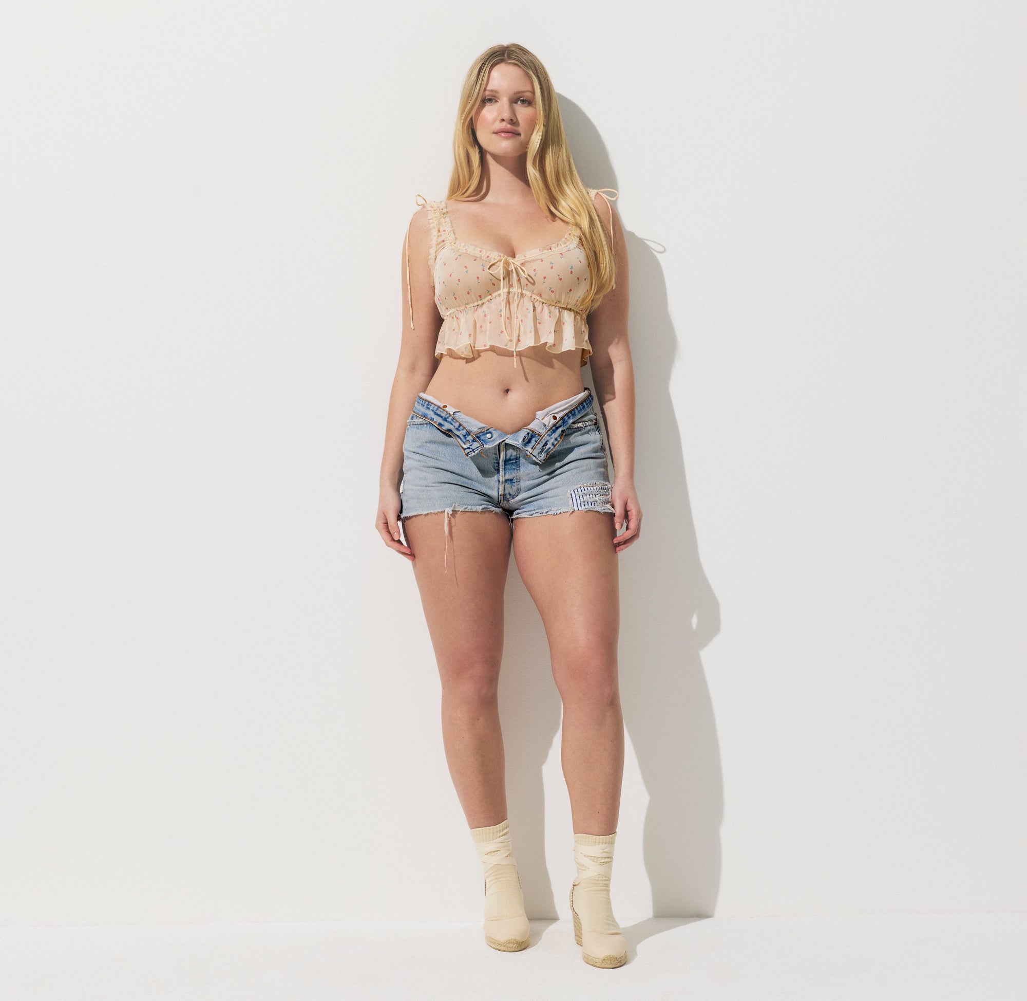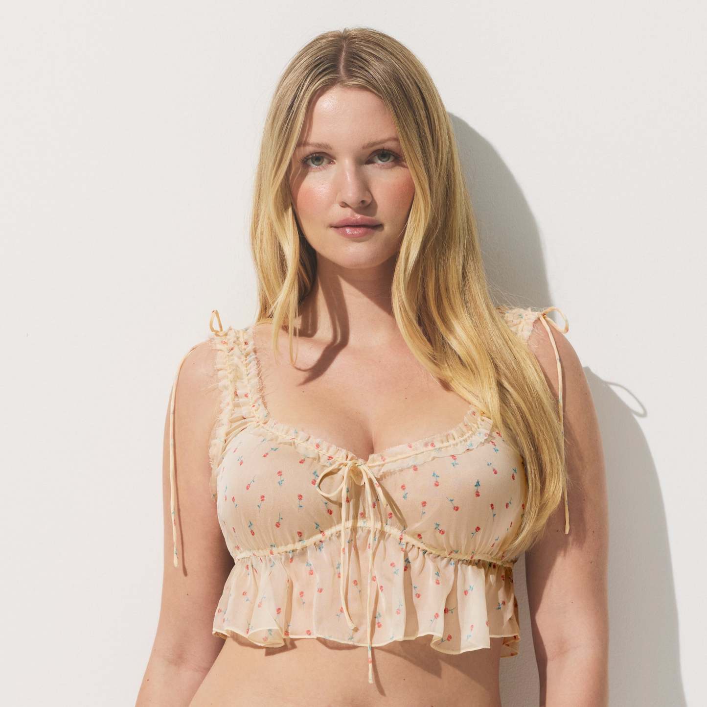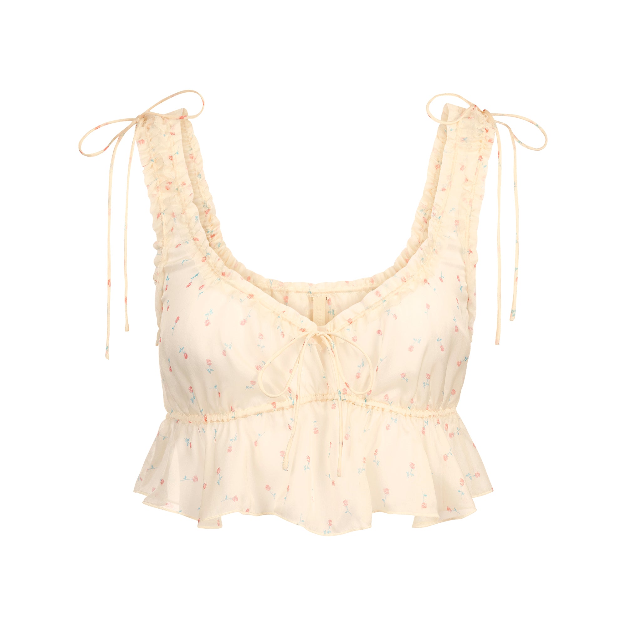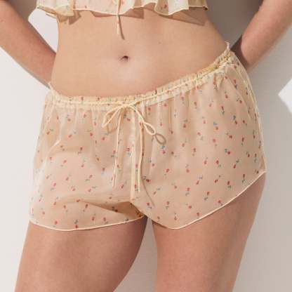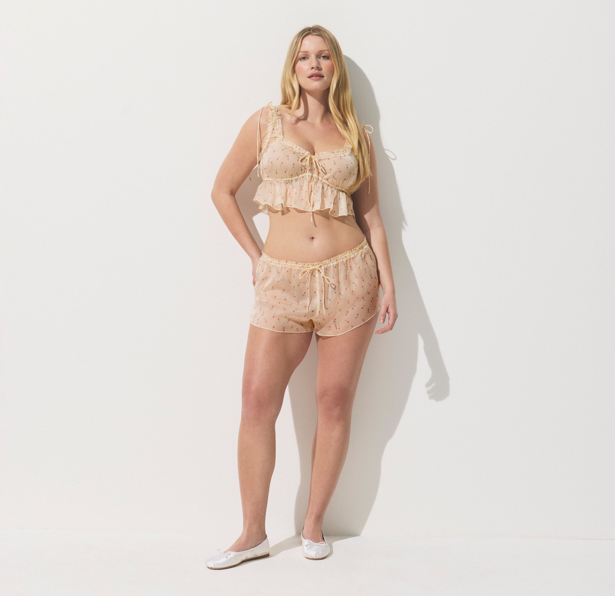 - Bralette: Scoop neckline, Raw cut neckline and underarm, Rouleau ties at neckline and straps, Logo label at center back, Flutter hem, Cropped length; Short: Rouleau tie at waist for adjustability, Logo label at center back waist, Fit with ease