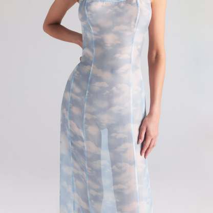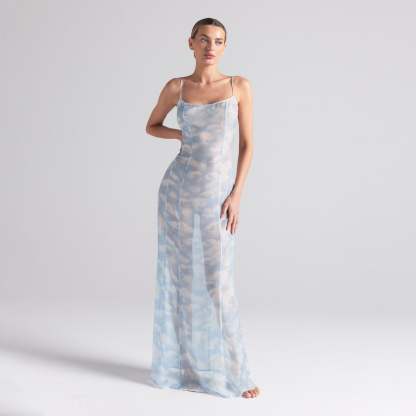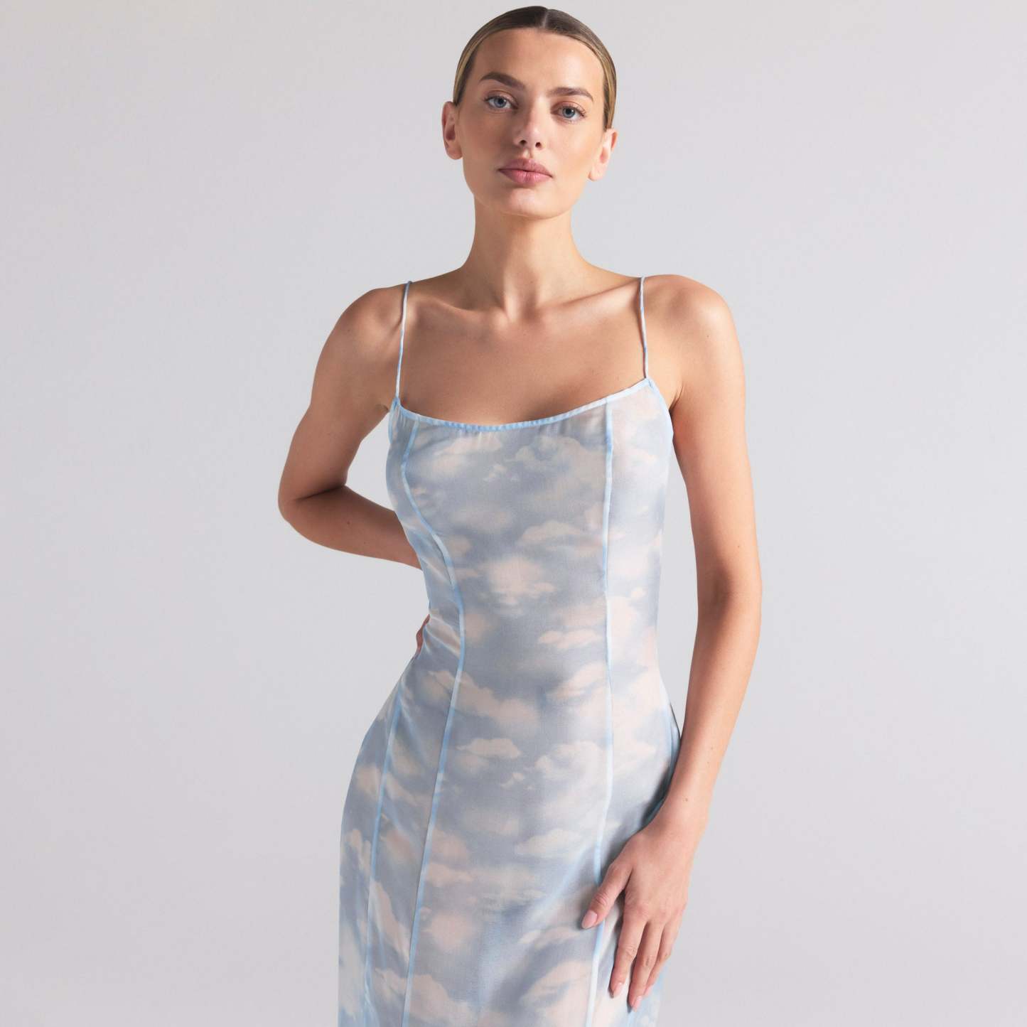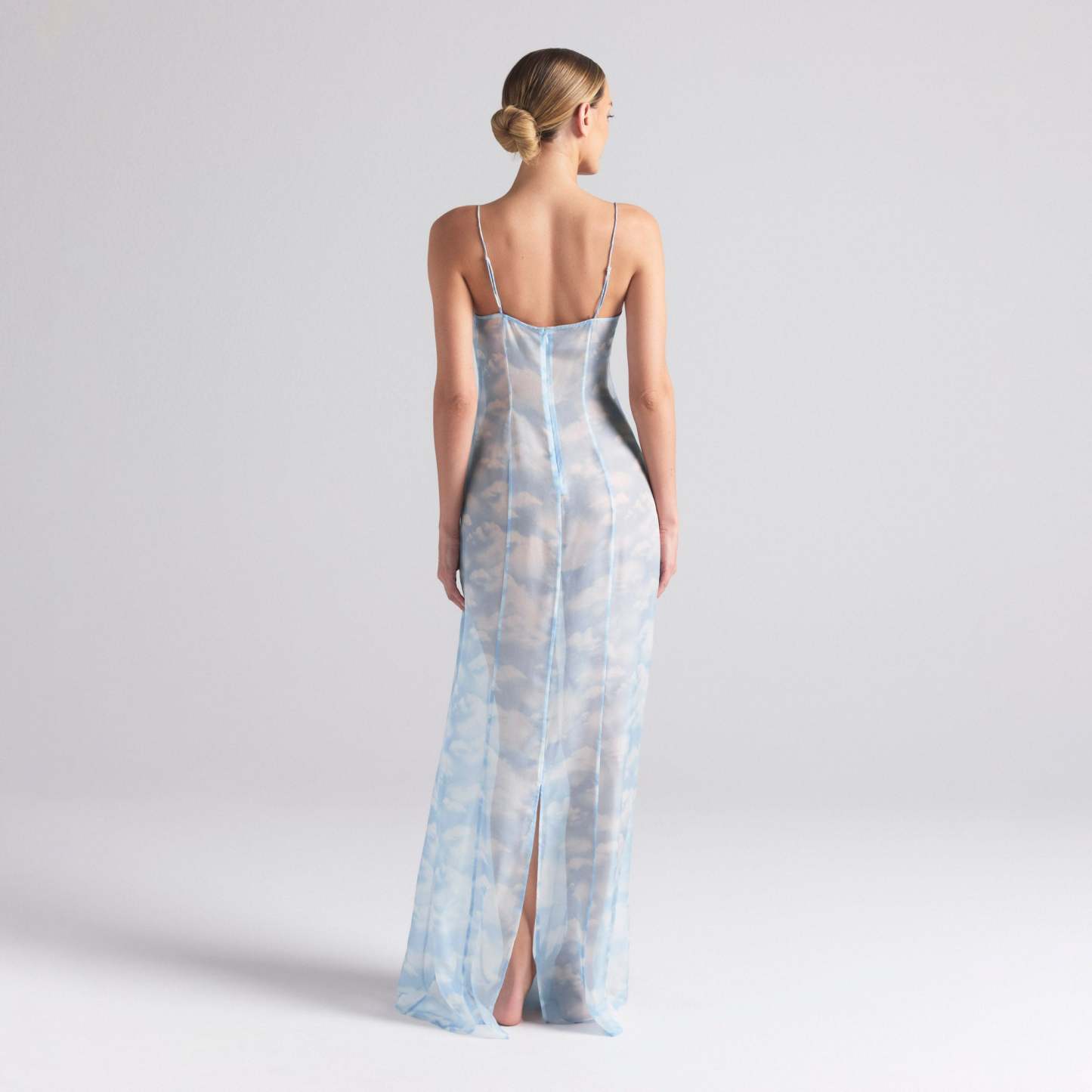 Swept away by SKIMS. This sensual maxi dress will pull at their heartstrings with a sexy, daring slit at the center back. Designed in our signature 100% silk chiffon, this slip features a flattering scoop neckline, thin adjustable straps, and concealed zipper back. Fits true to size.