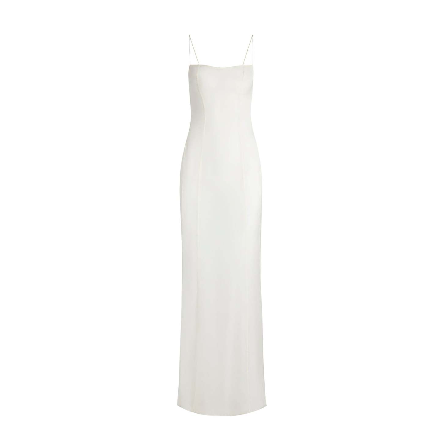 - Scoop neckline, Adjustable rouleau straps, Invisible zipper at center back, Seam details, Slit at center back, Maxi length