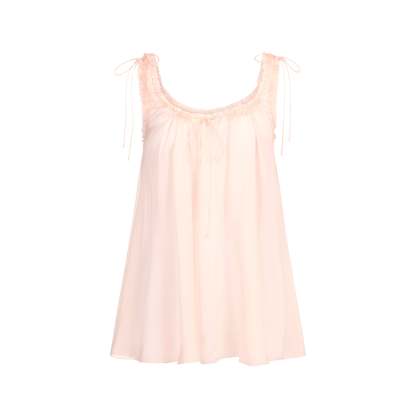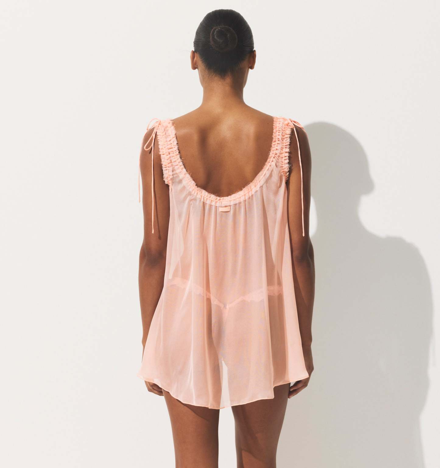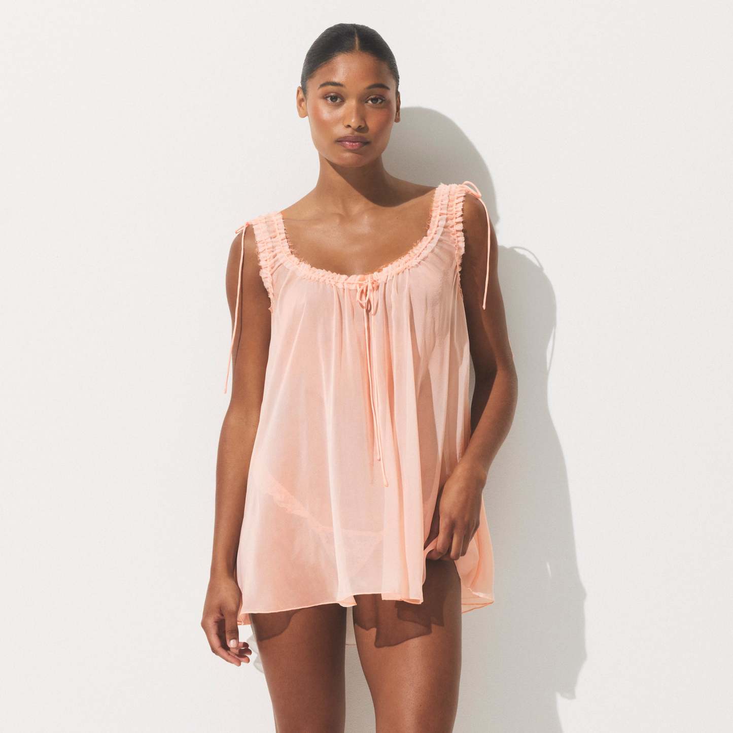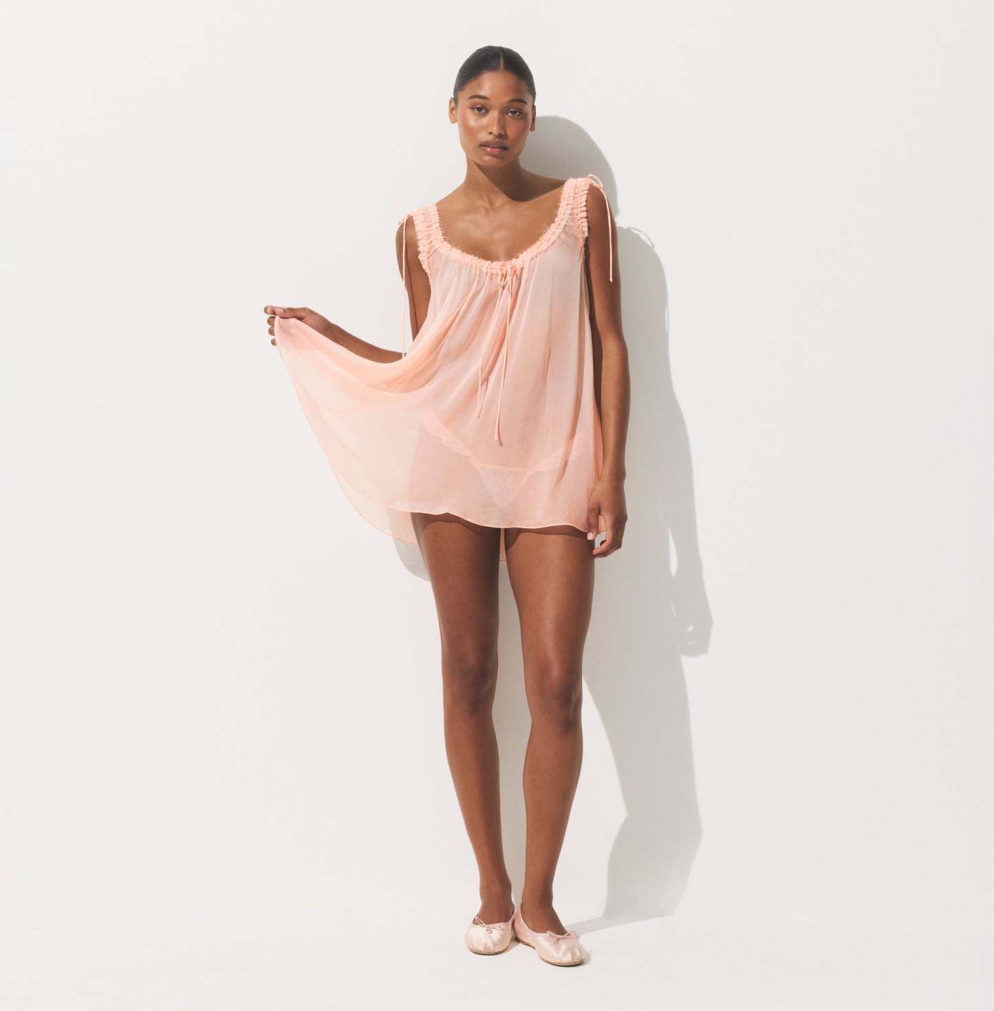 Dreamy desire. This romantic relaxed mini is made with 100% silk chiffon for a chic, sensual look. Features a flattering scoop neckline and thin tie at the neck and straps. Complete with raw cut hems and a SKIMS logo detail at the center back. Fits true to size.