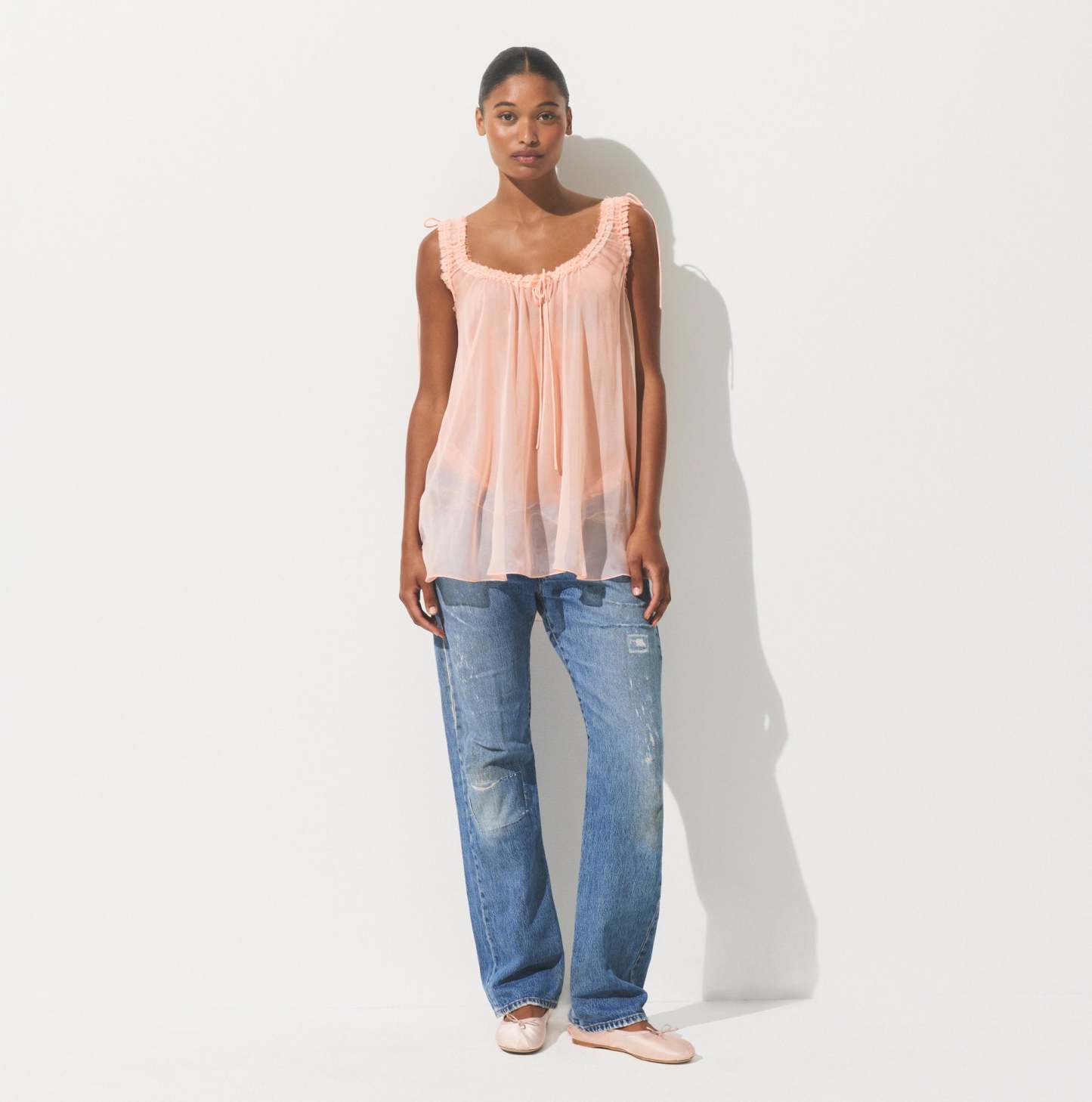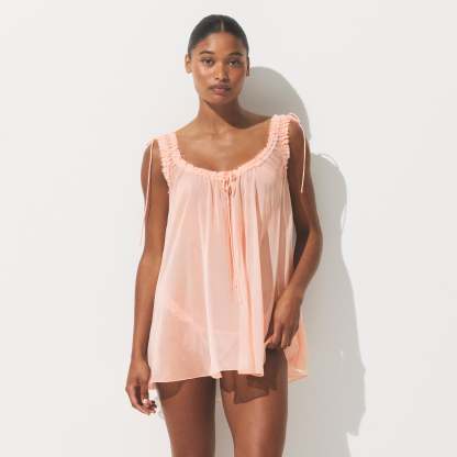- Scoop neckline, Raw cut neckline and underarm, Rouleau ties at neckline and straps, Logo label at center back, Fit with ease, Mini length