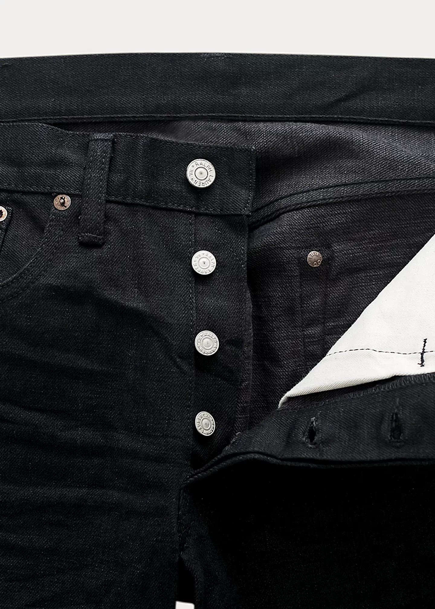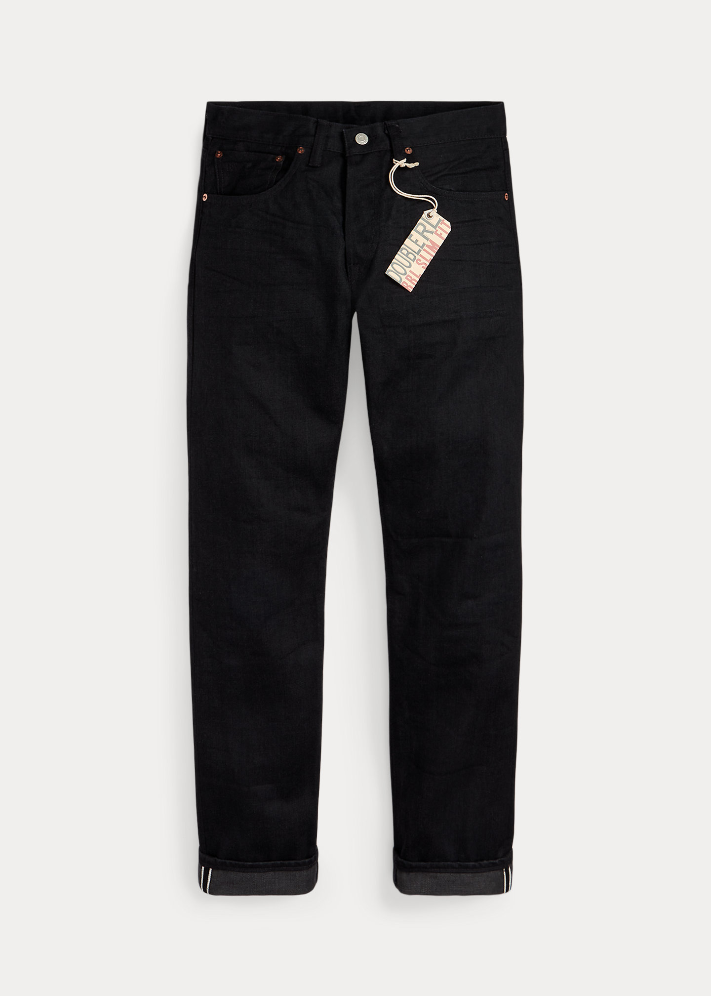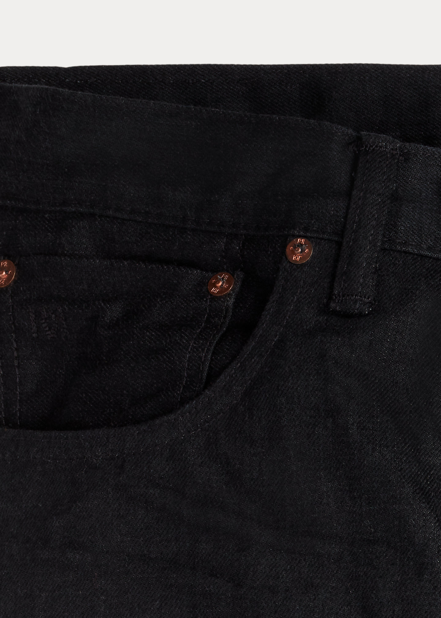 - American-made buttons, rivets, and washer burrs. Five-pocket styling. Selvedge coin pocket with “RRL” embroidery. Heavy twill pocket lining.
