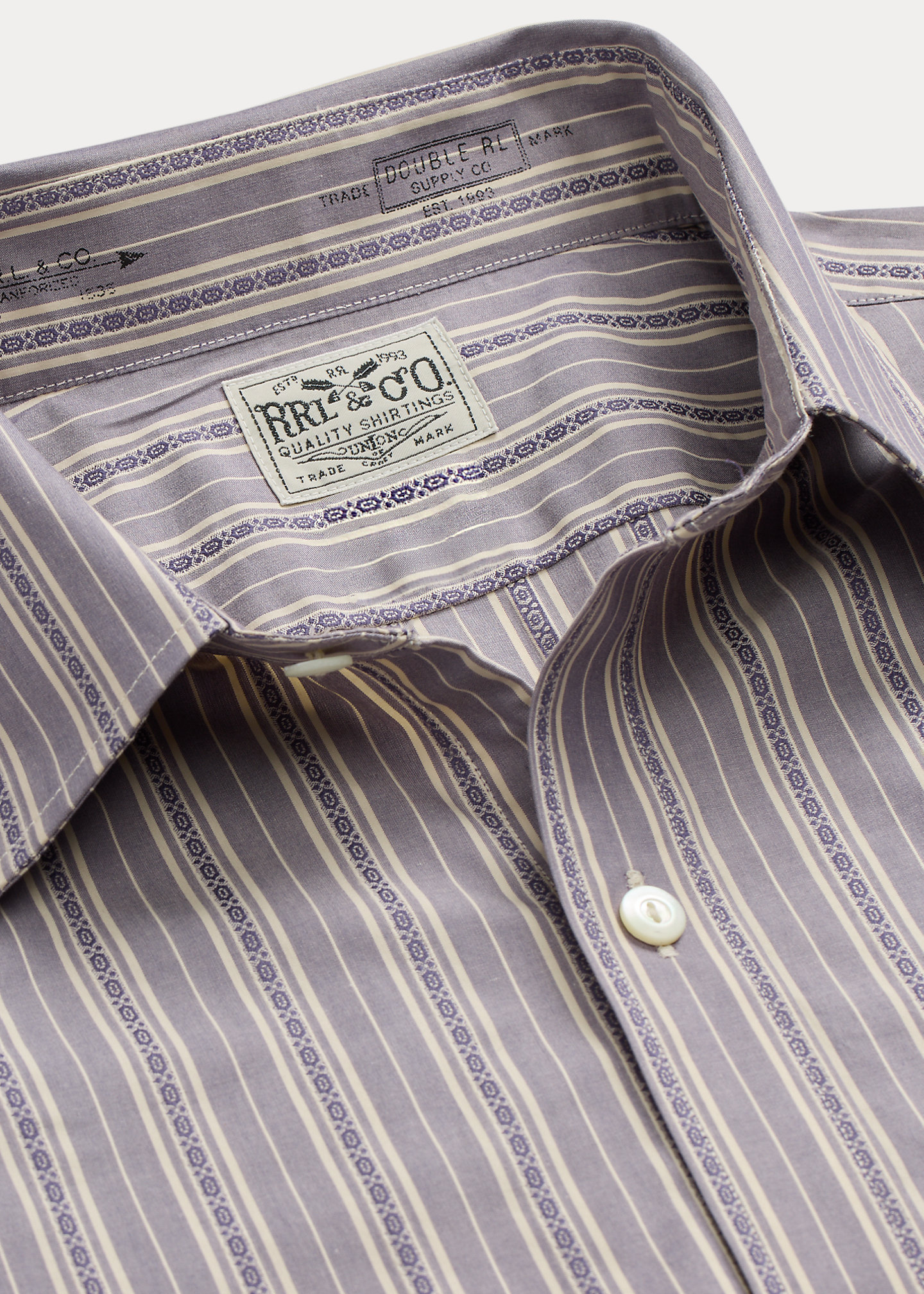 - Vintage-inspired straight collar. Buttoned placket. Genuine mother-of-pearl buttons.