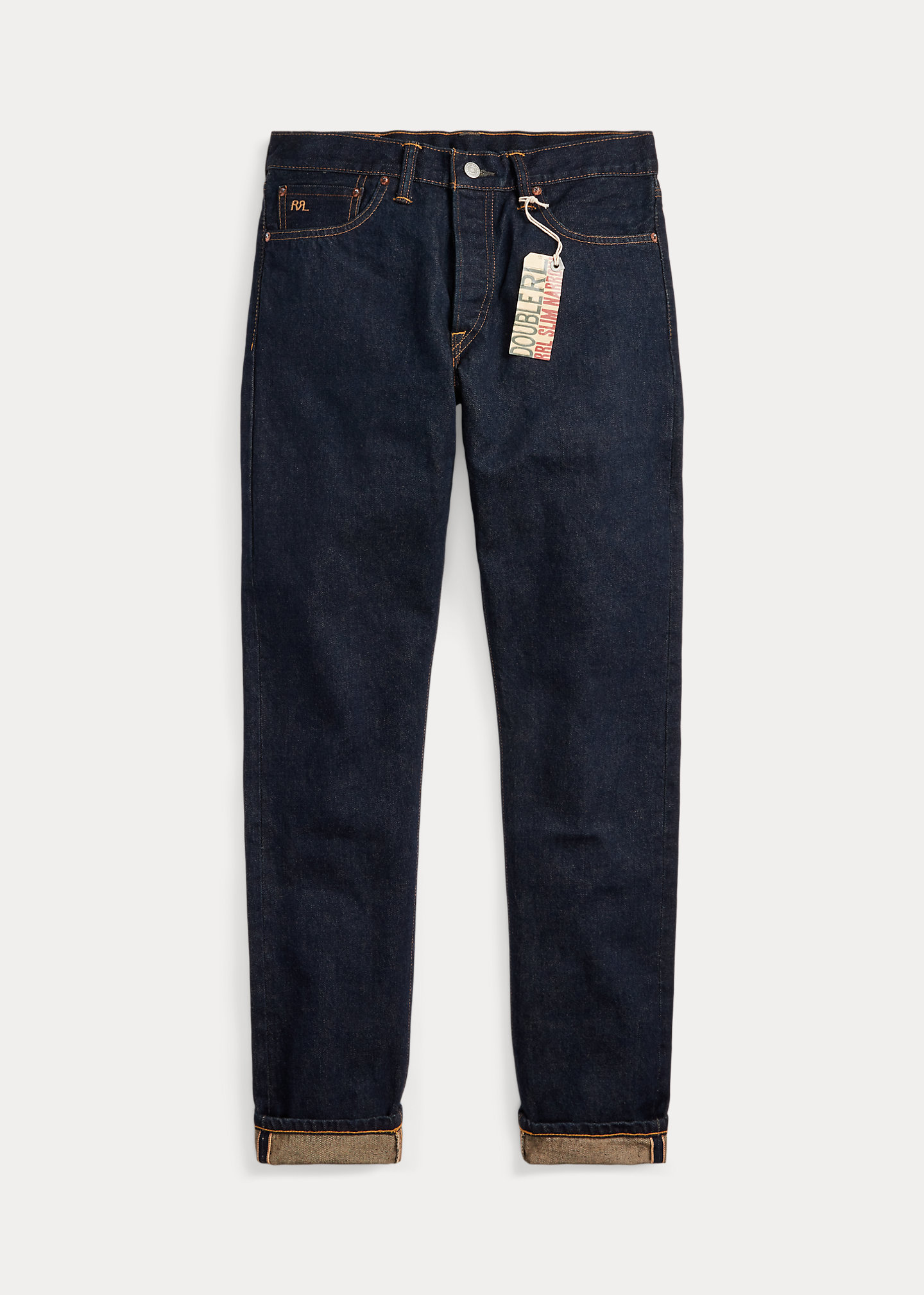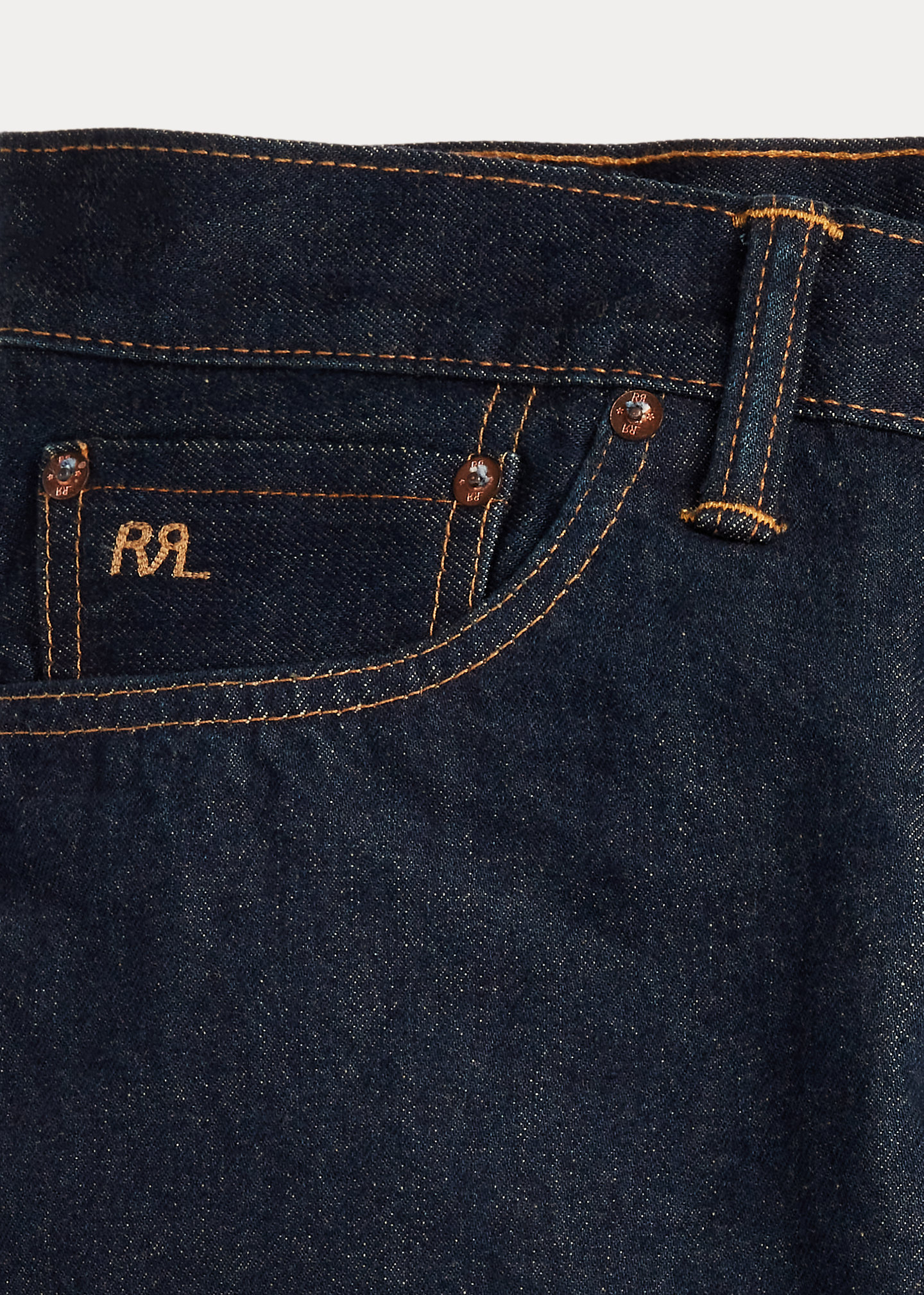 - American-made buttons, copper-tone rivets, and washer burrs. Five-pocket styling. “RRL” embroidery at the selvedge coin pocket. Heavy twill pocket lining.