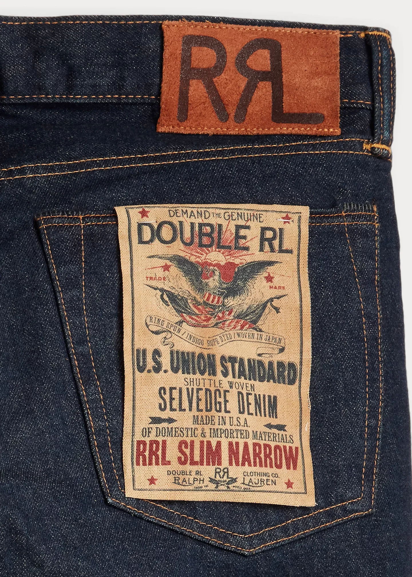 - Leather “RRL”-debossed logo label at the back right waist.