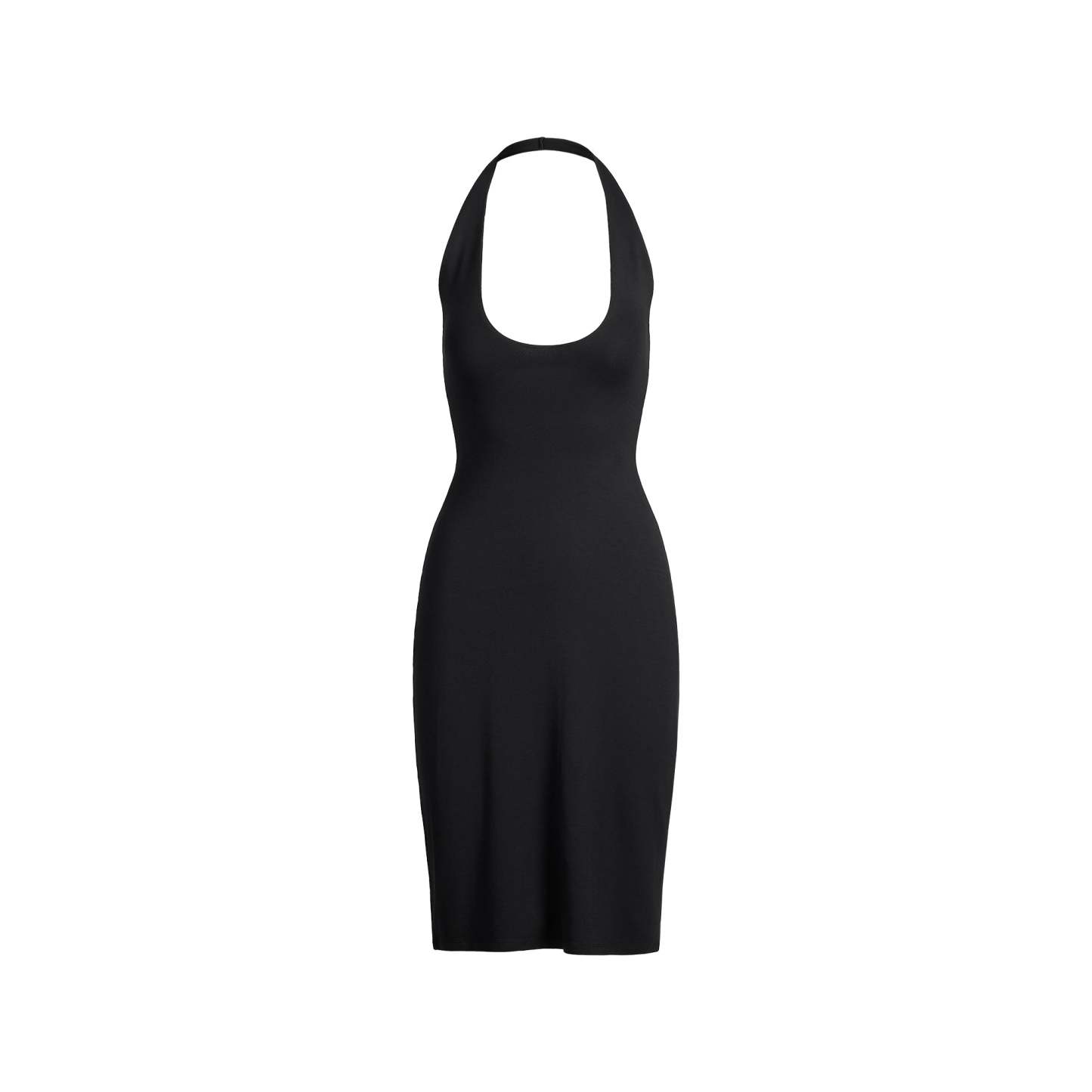 - Plunge halter neckline, Interior shelf bra, Low back, Fits tight to body, Hits below the knee