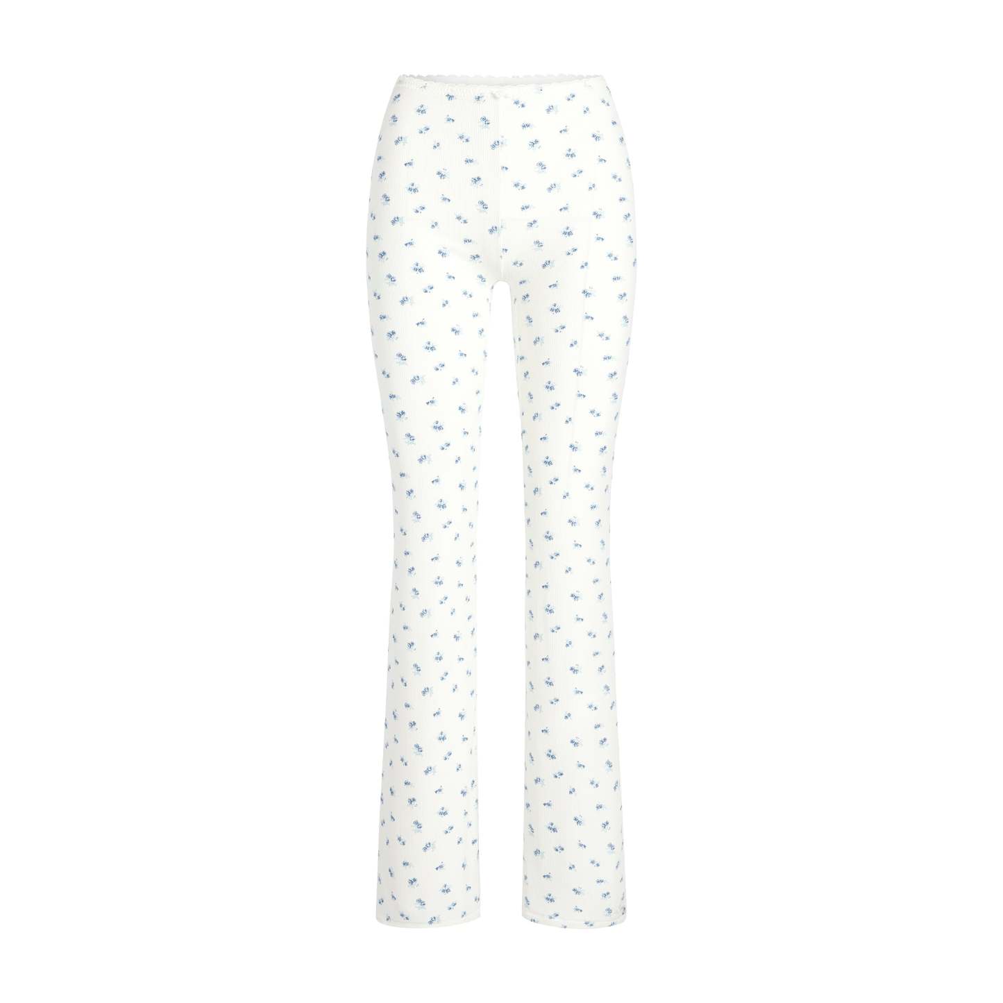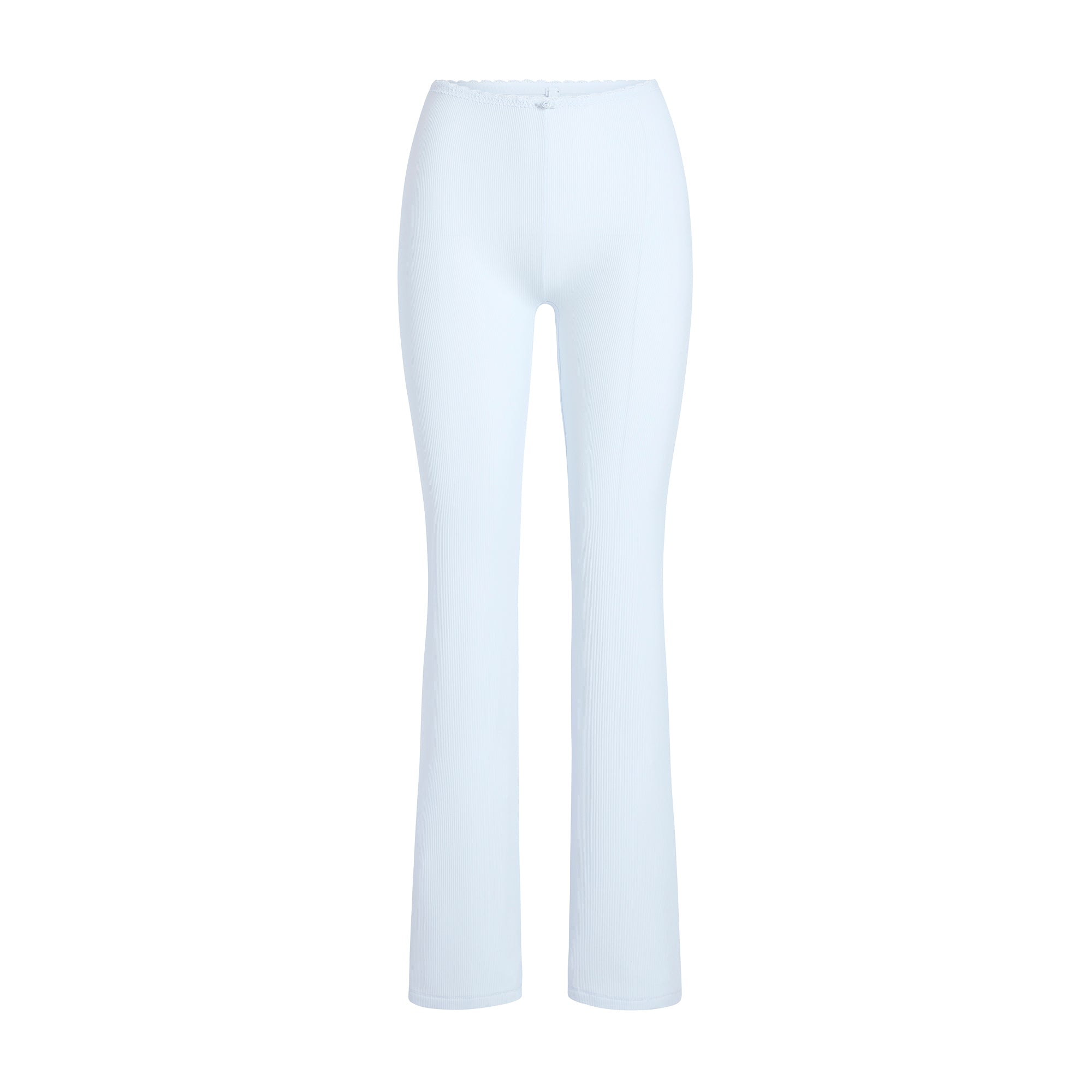 - Full length 32" inseam (all sizes), Elastic in interior waistband, Lace trim along waistband and rosette at center front