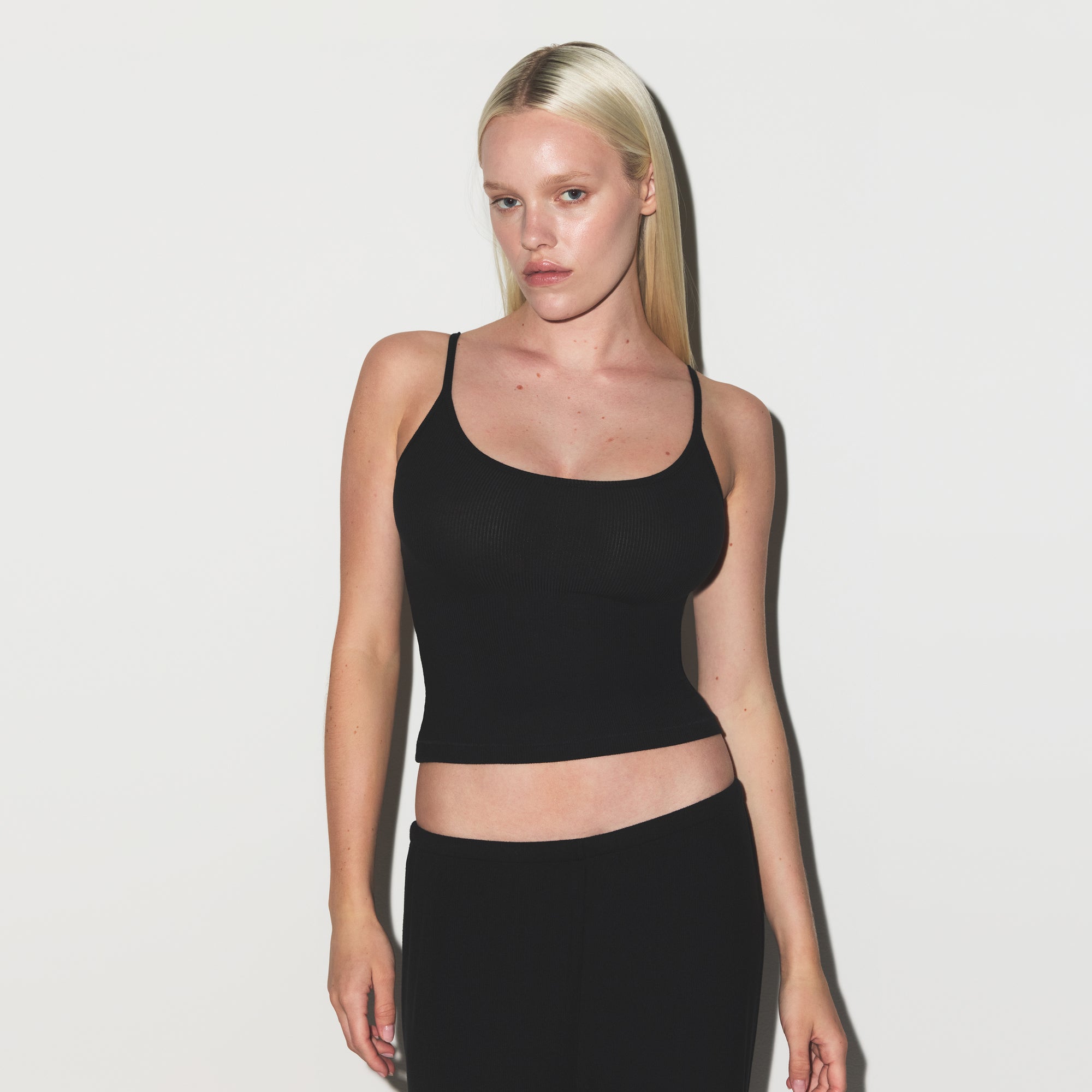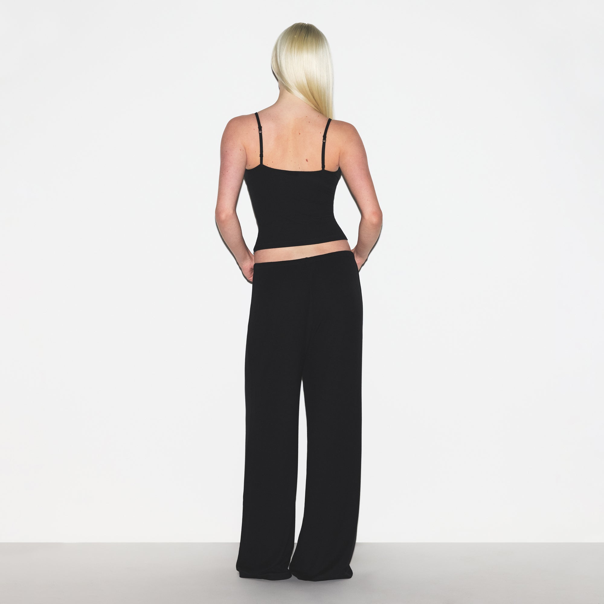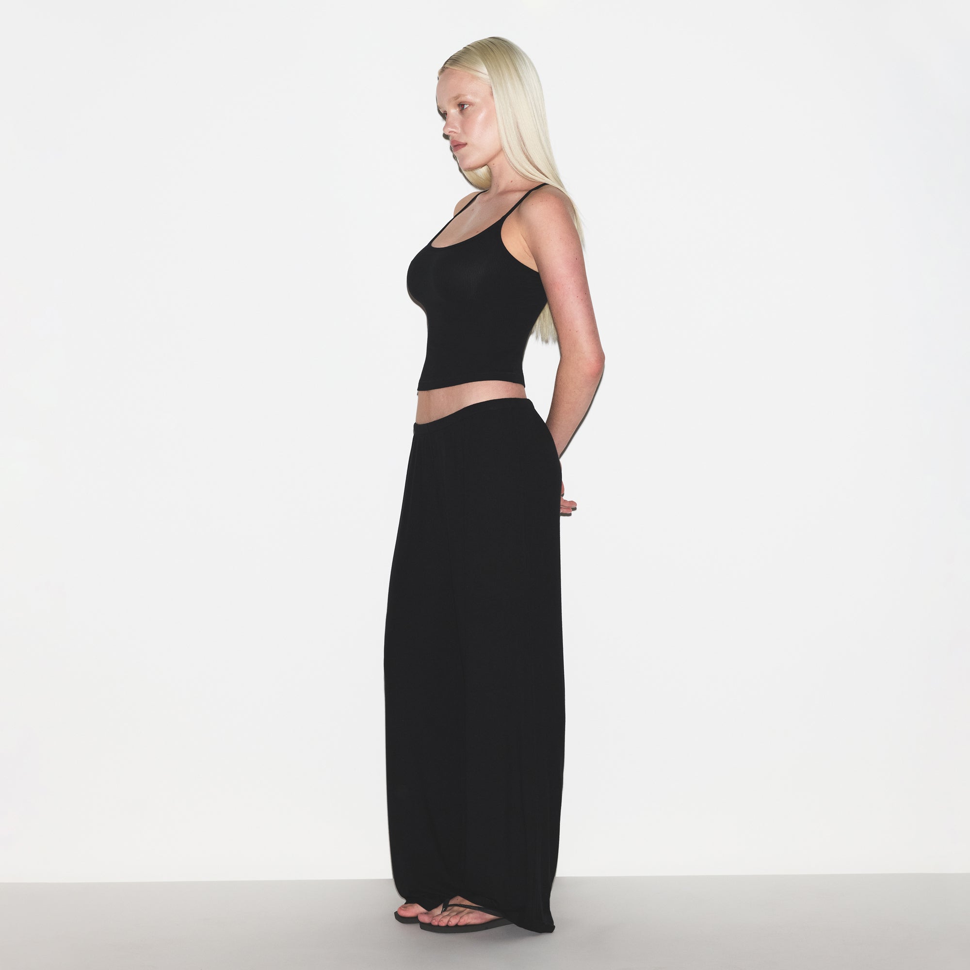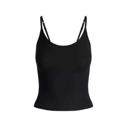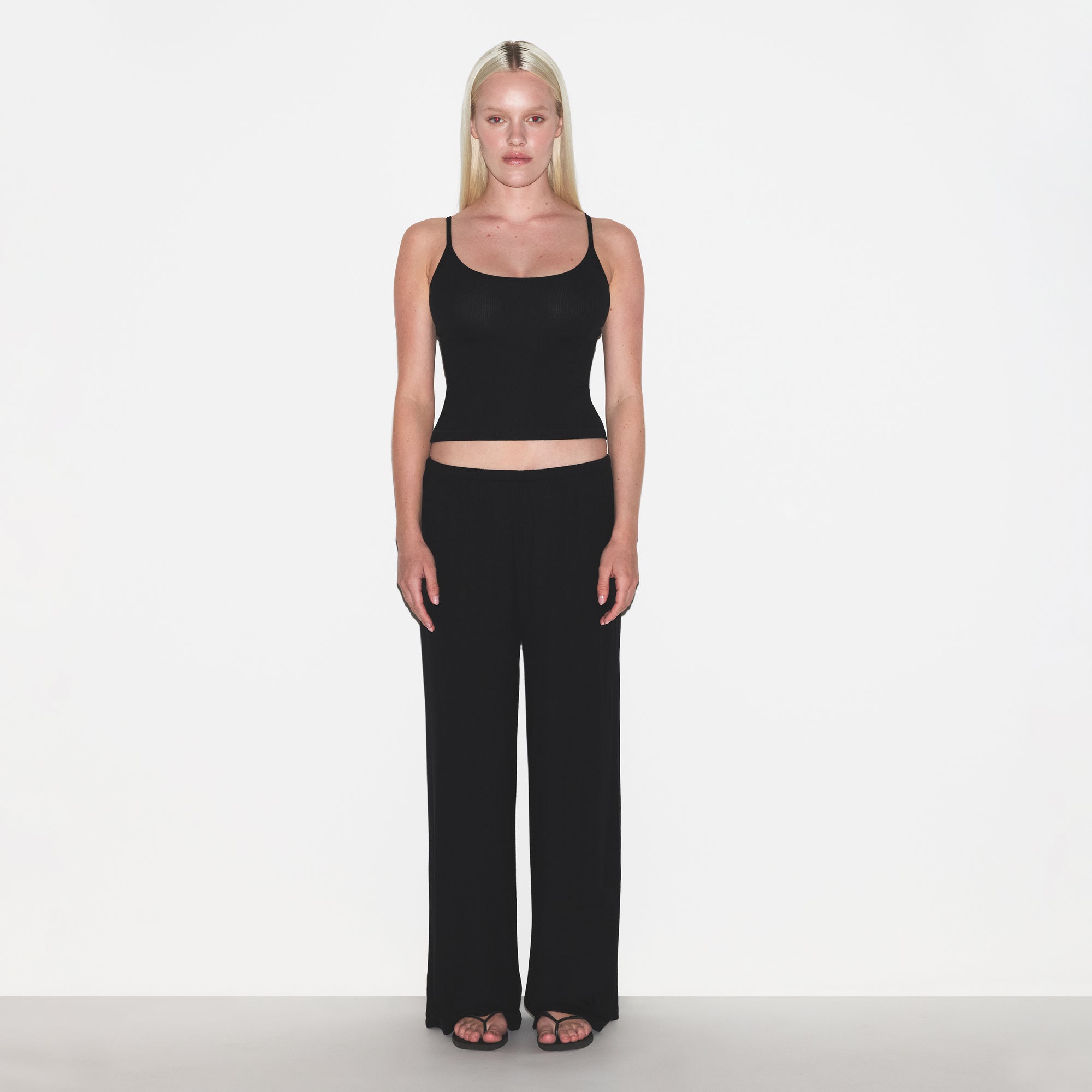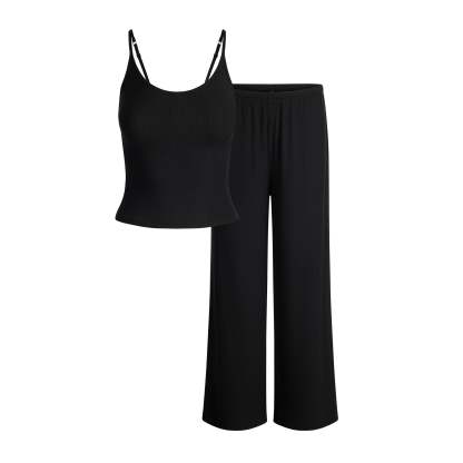 Dream in comfort. Made with our ultra-soft modal ribbed fabric, this sleep set includes a relaxed tank with a scoop neckline, adjustable straps, and SKIMS logo detail at the center back neck. Features a straight leg pant with a soft knit elastic waistband and interior adjustable drawstring. Fits true to size.
