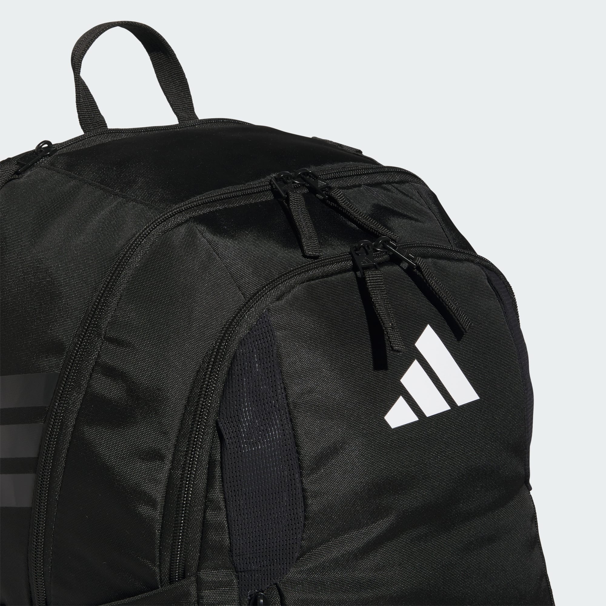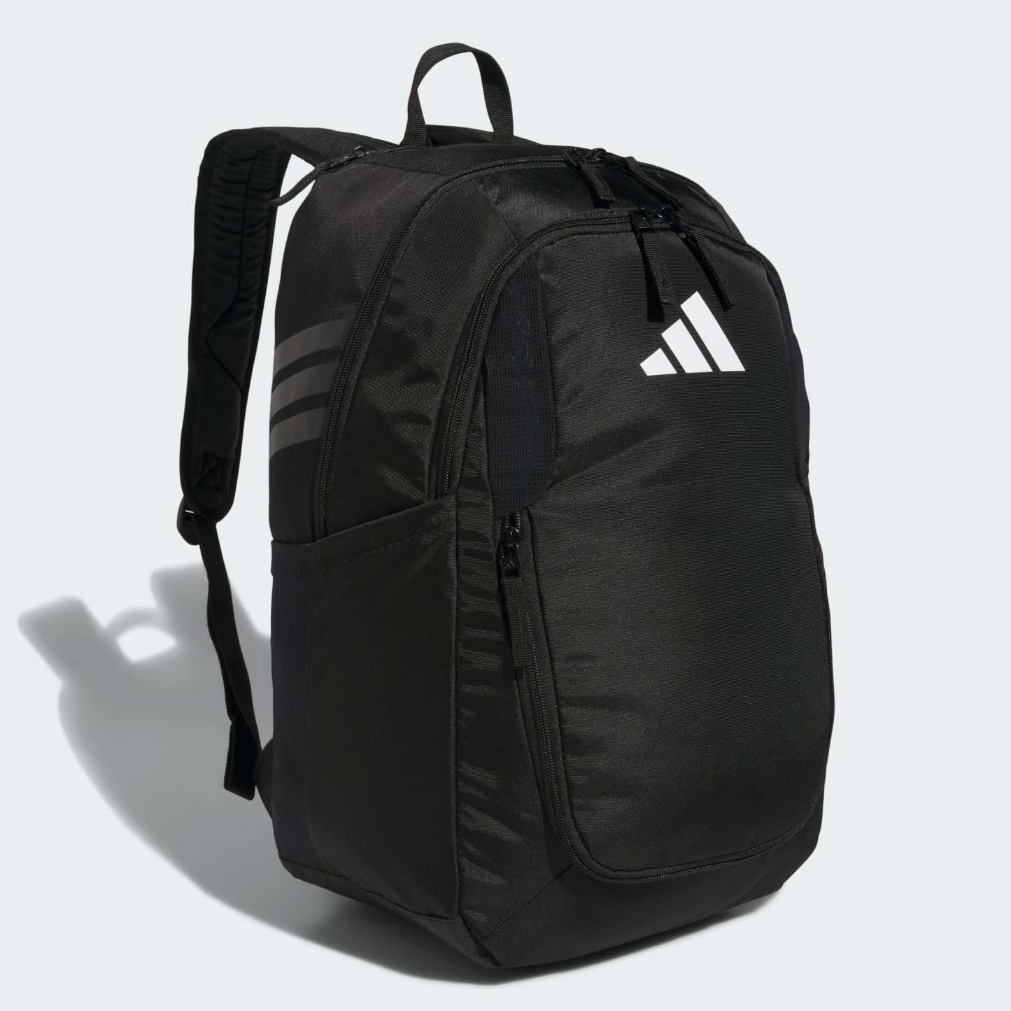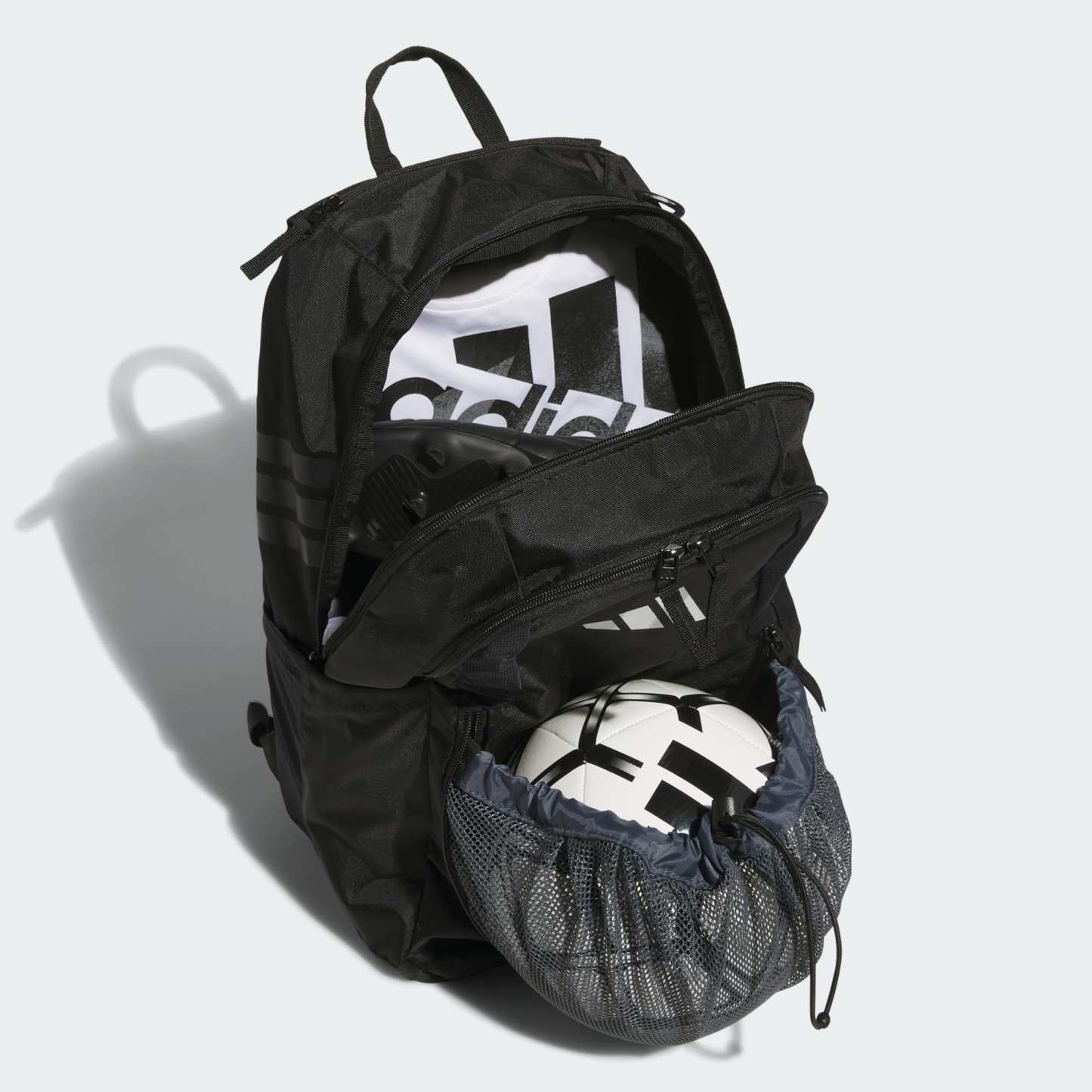 Made from lightweight, durable polyester, this versatile adidas backpack keeps stuff organized and dry thanks to a water-resistant base. Multiple zip pockets keep your gear separated, including one that can hold a size 5 soccer ball and two mesh side pockets that can each hold a 32 oz water bottle. There's also a vented pocket to store dirty gear and a clip to attach essentials. Score!