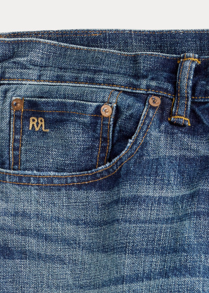 - American-made buttons, rivets, and washer burrs. Five-pocket styling. "RRL" embroidery at the selvedge coin pocket. Natural twill pocket lining.
