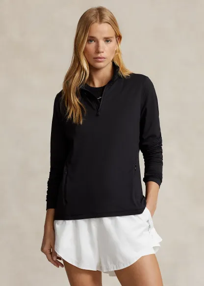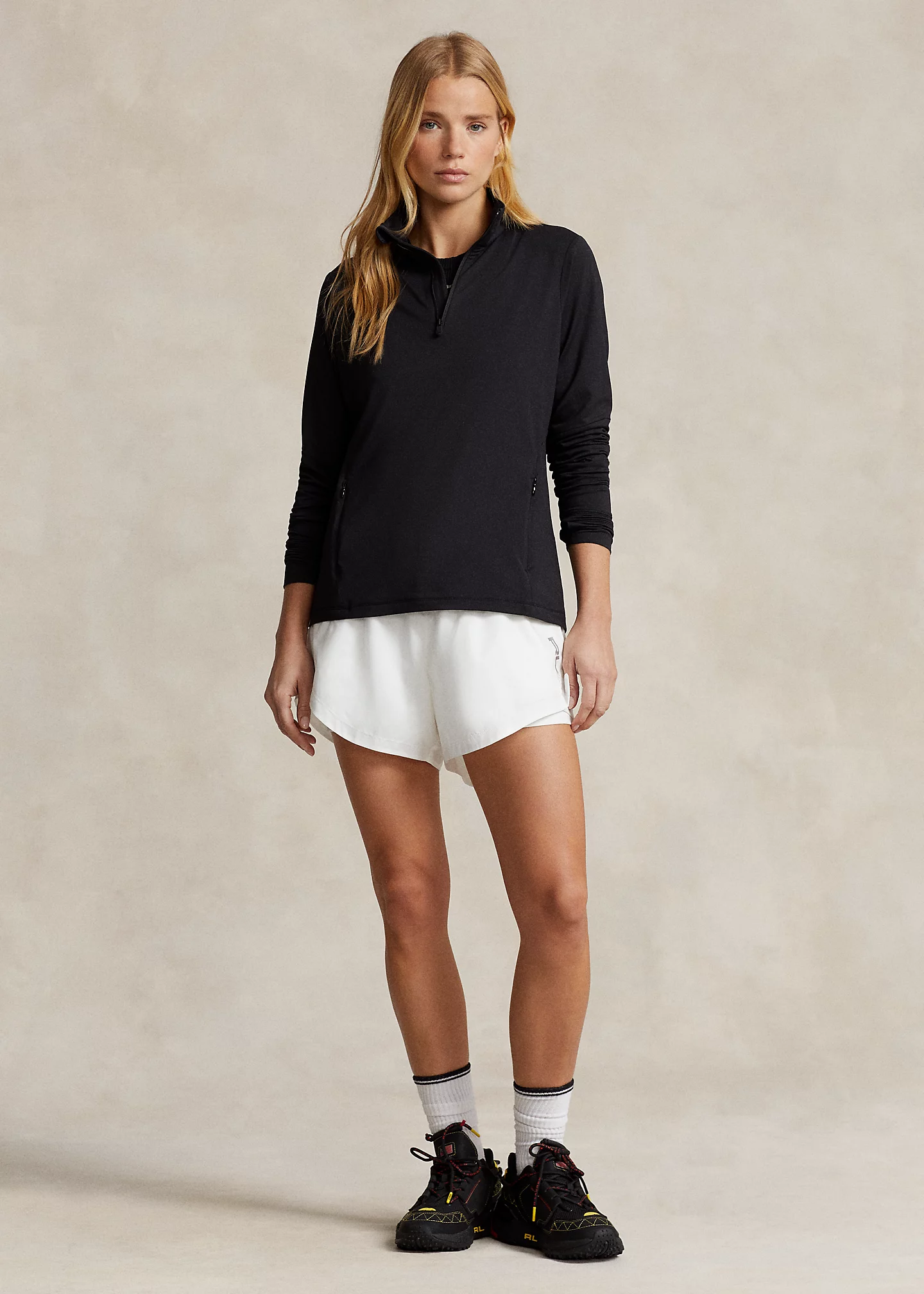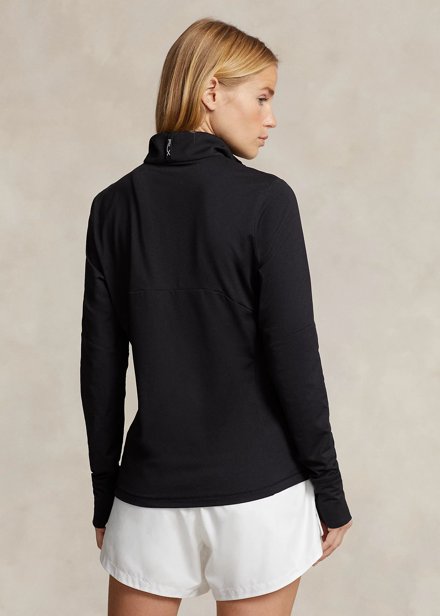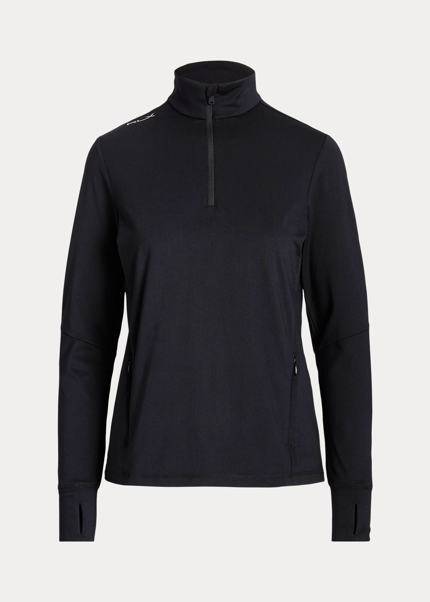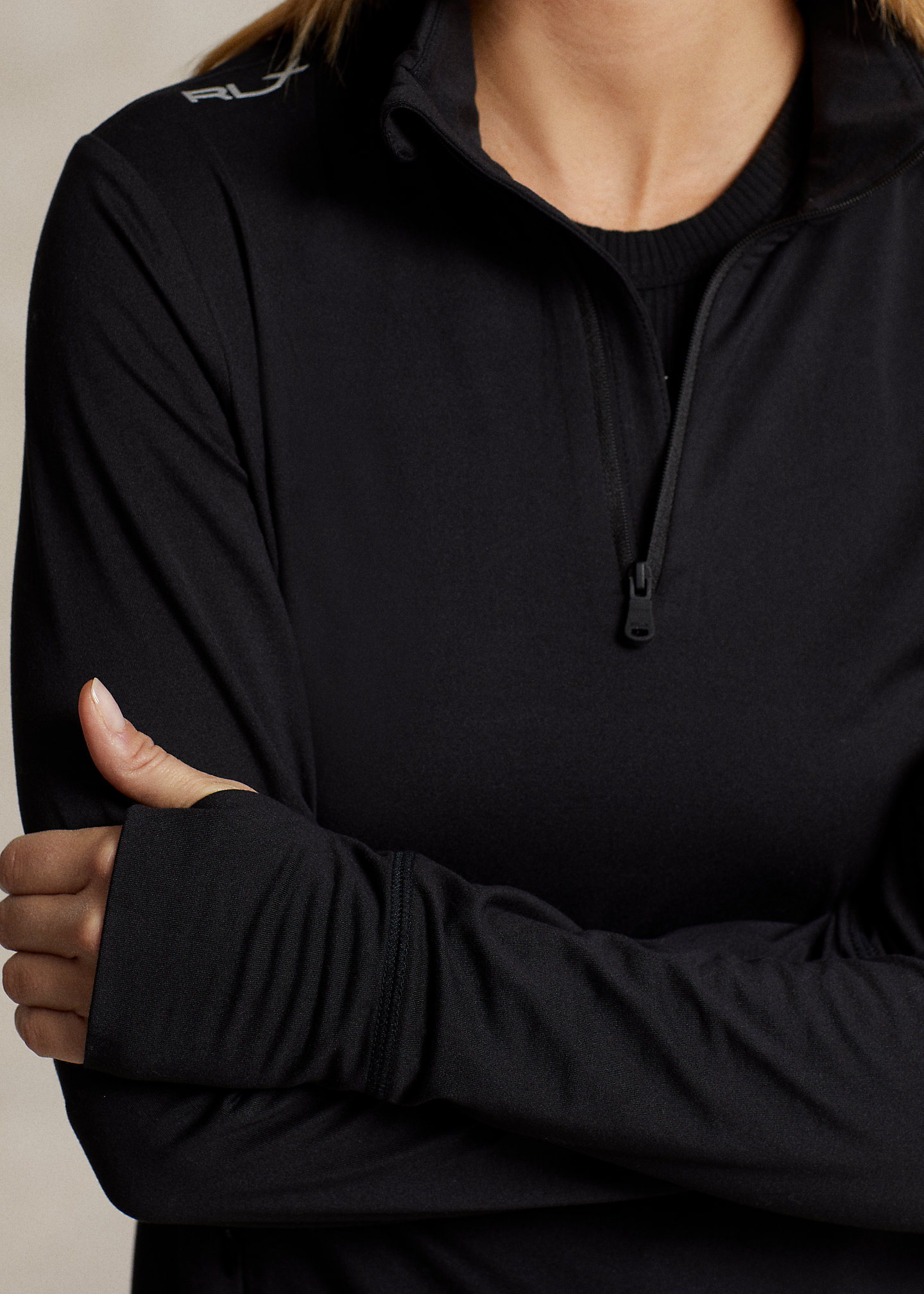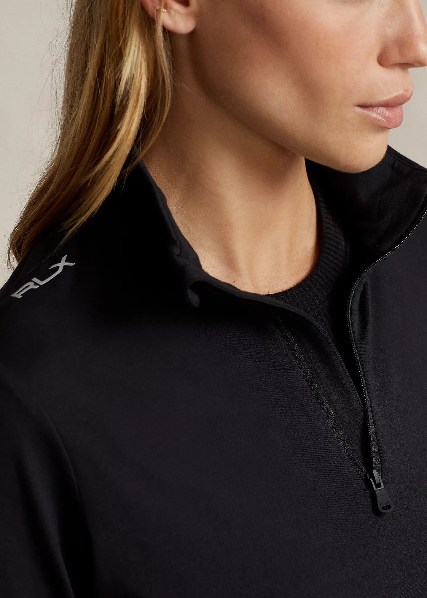- Mockneck. Quarter-zip placket. "RLX" locker loop at the center back of the neck.
