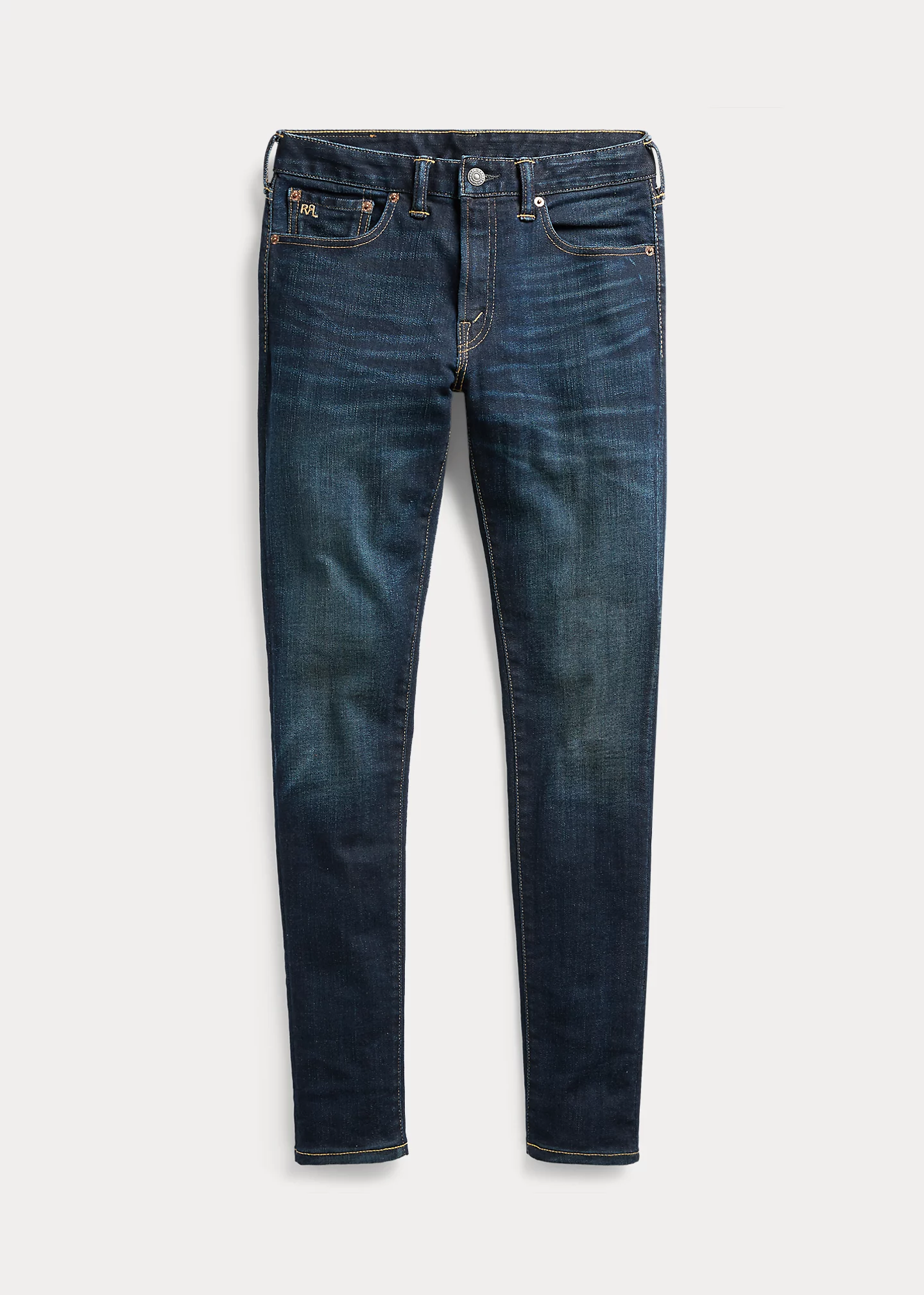 - American-made button, rivets, and washer burrs. Five-pocket styling. “RRL” embroidery at the coin pocket.