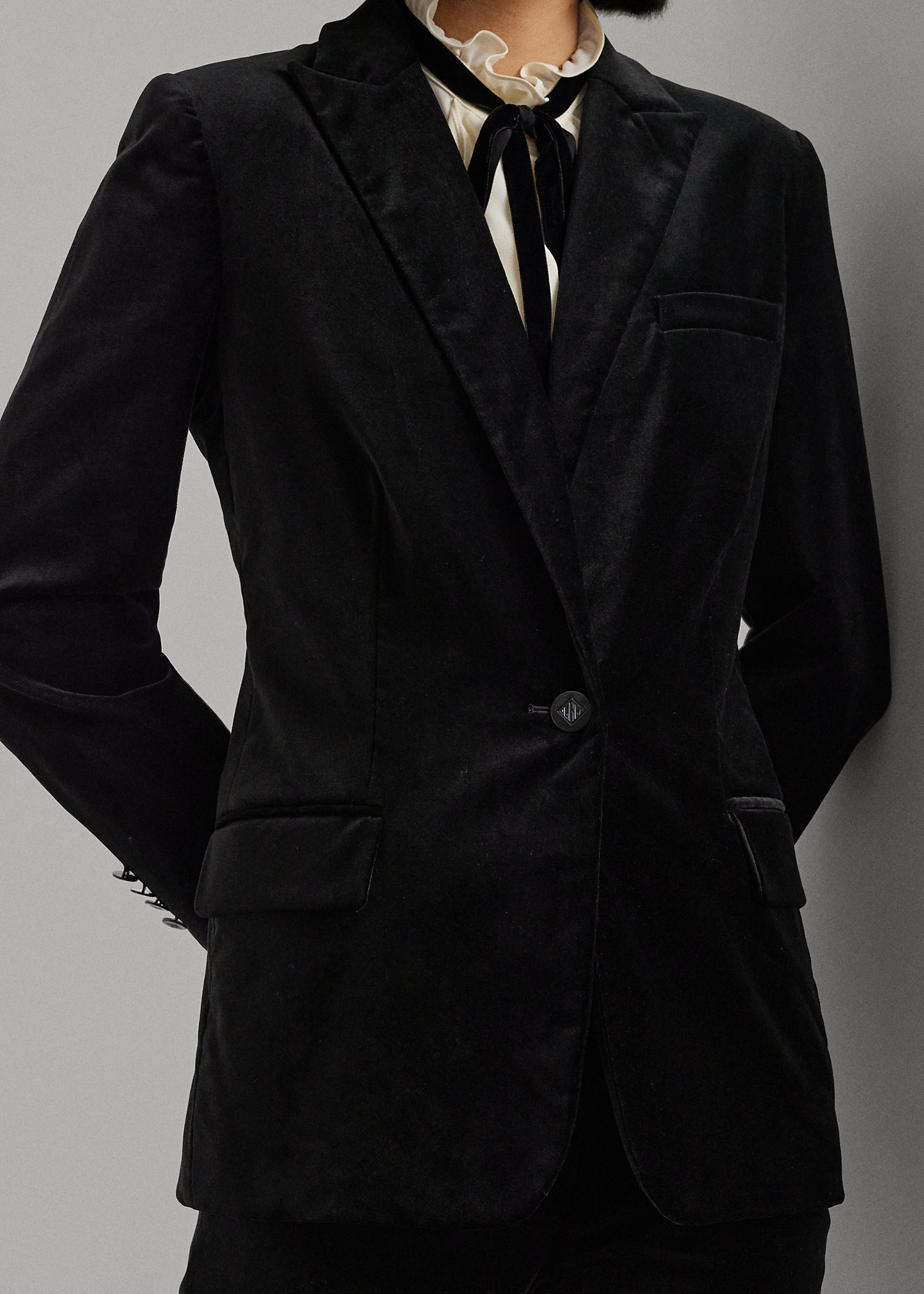 - Peak lapels. Single-button silhouette. "LRL"-engraved buttons.