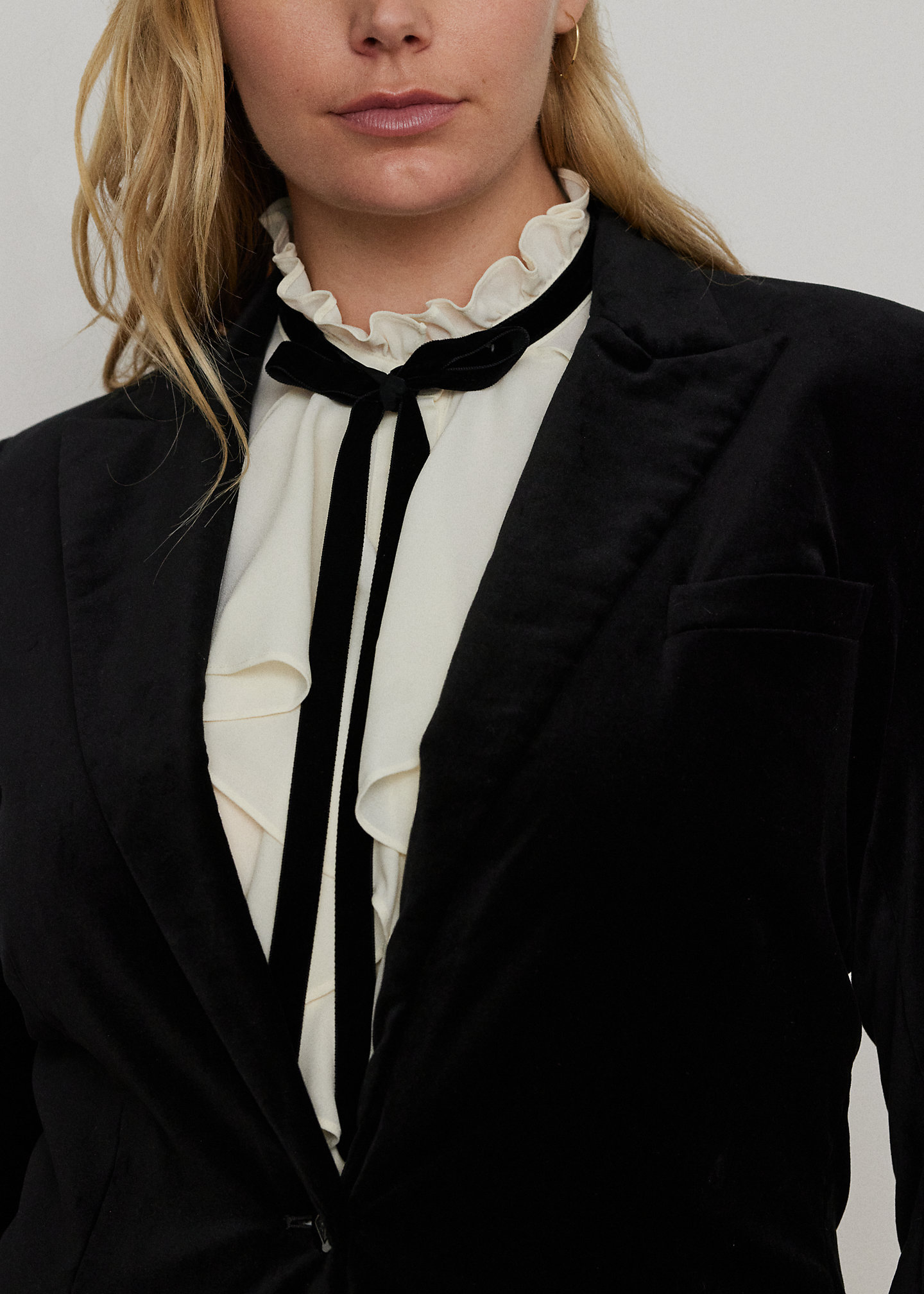 - Peak lapels. Single-button silhouette. "LRL"-engraved buttons.