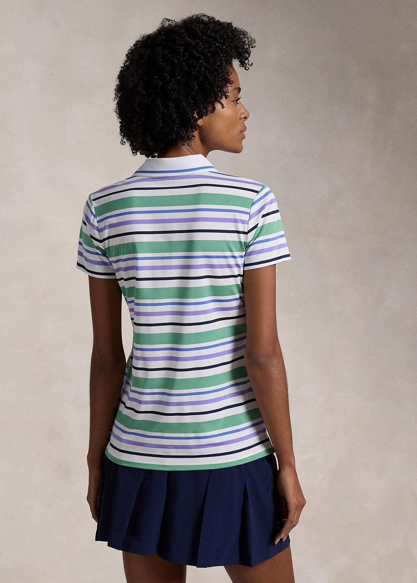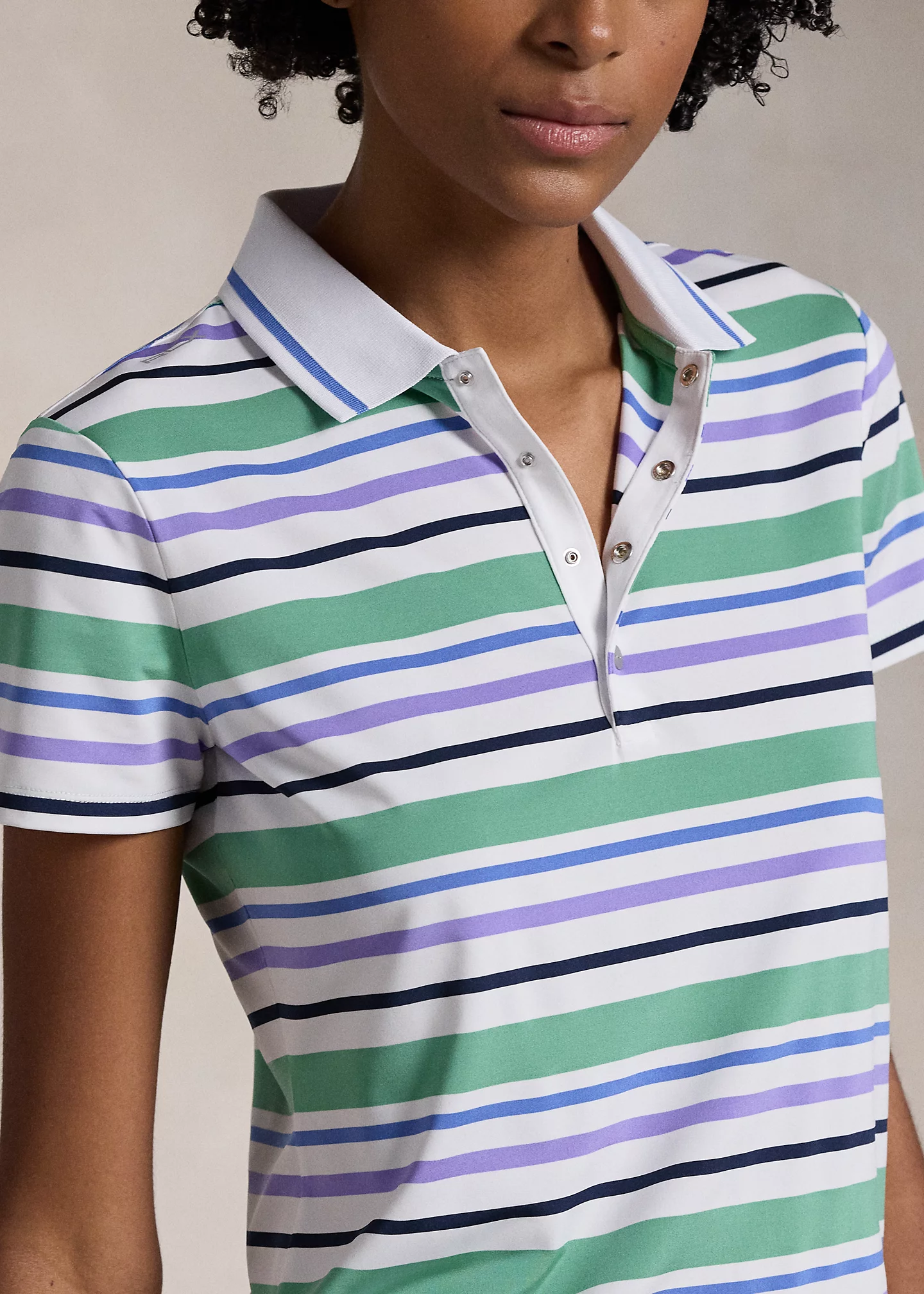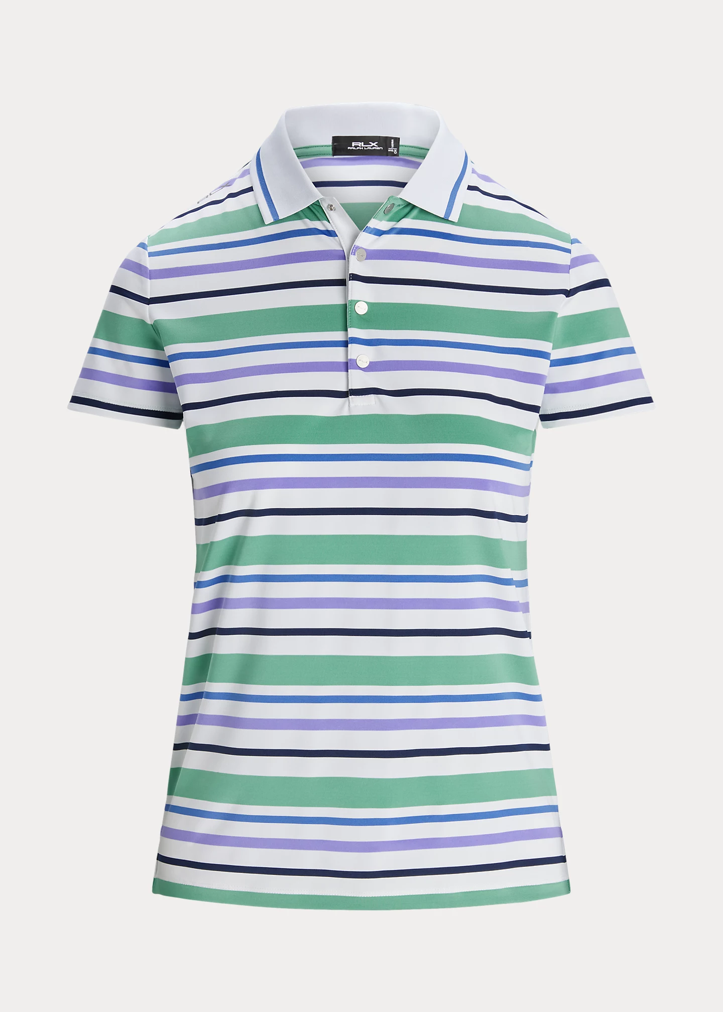 - Ribbed Polo collar with striped tipping. Four-snap placket. “RLX”-engraved snaps.