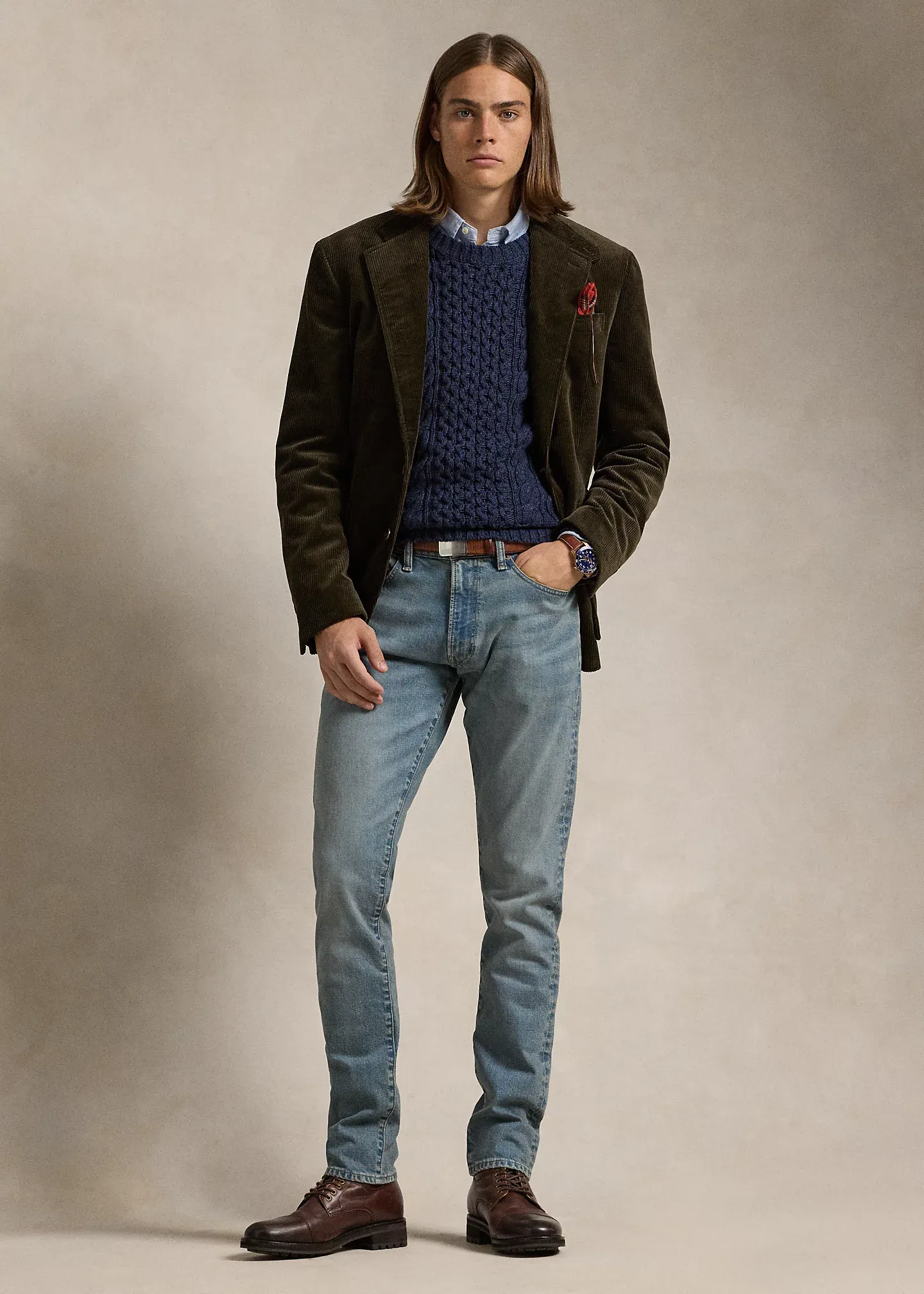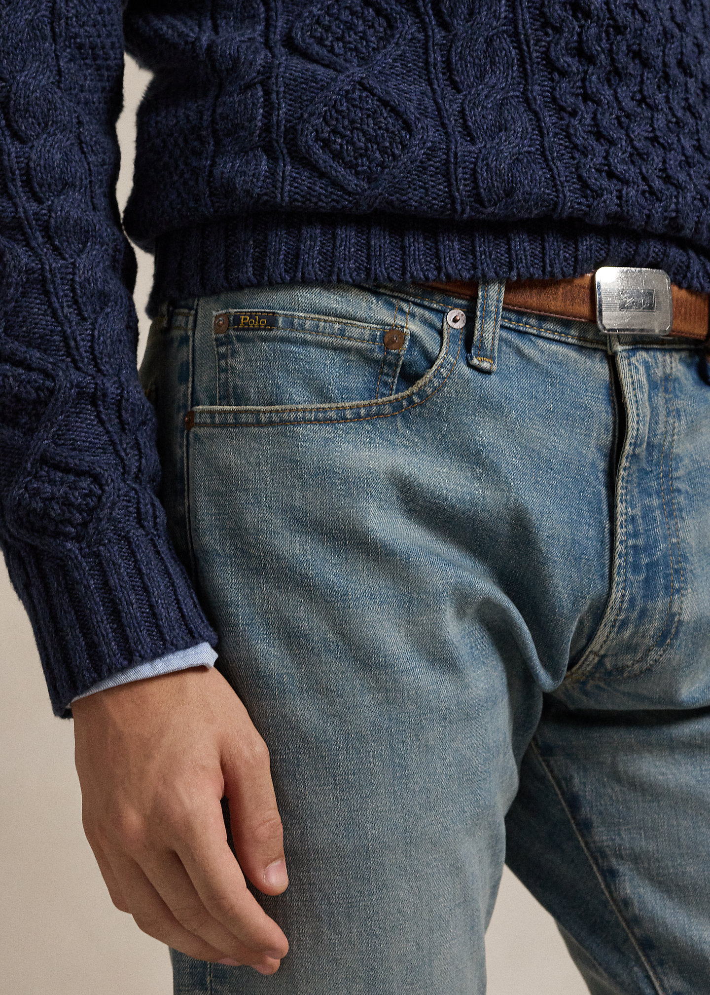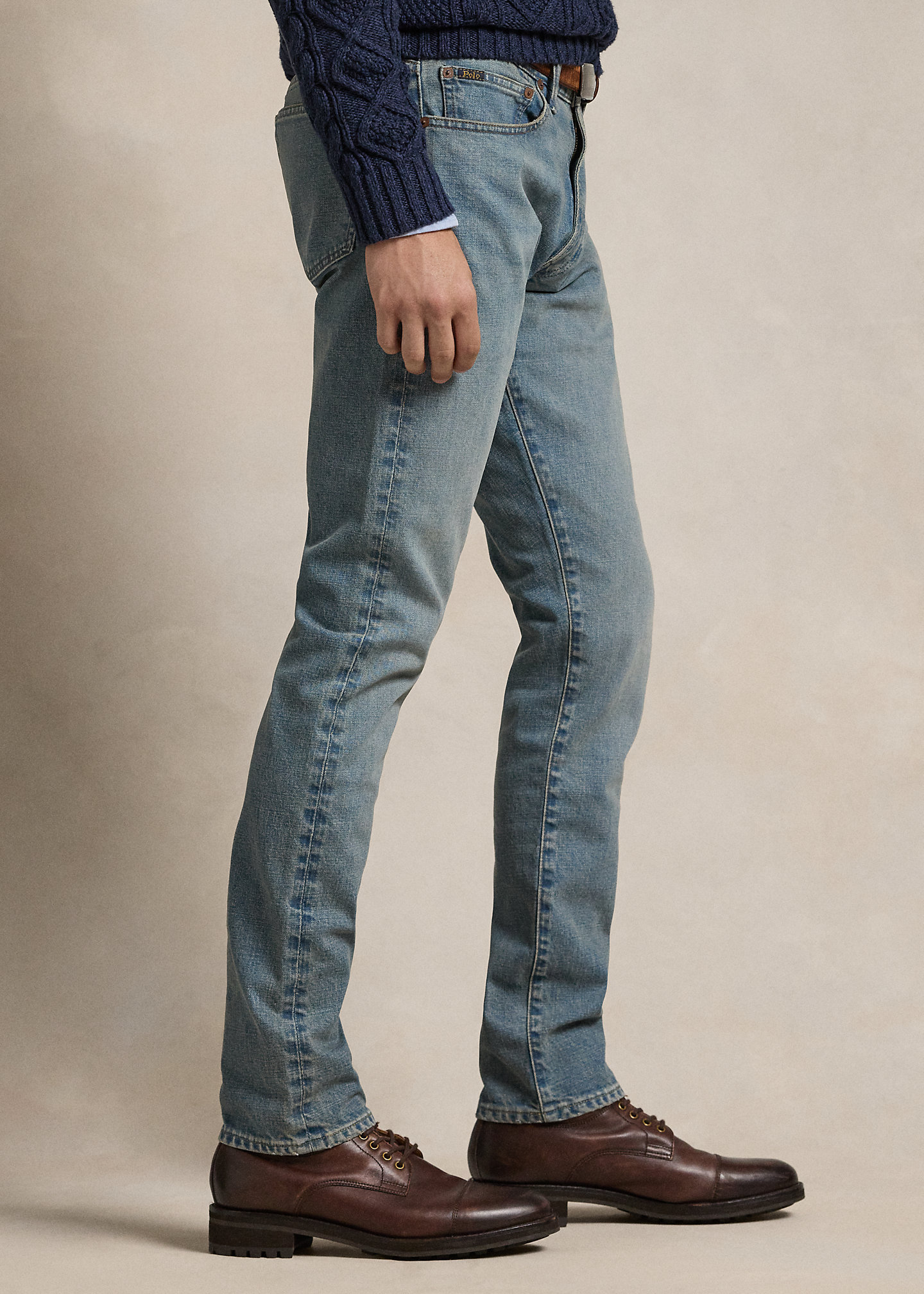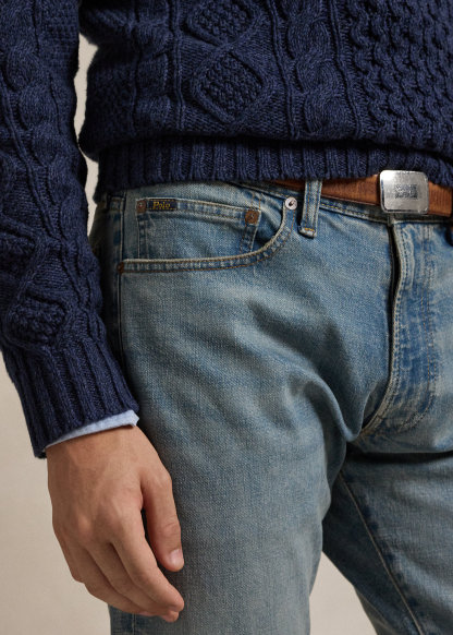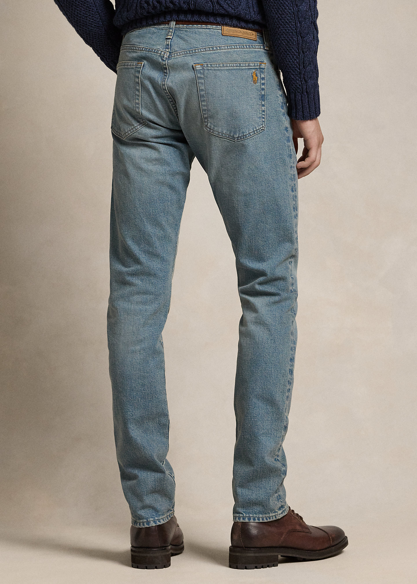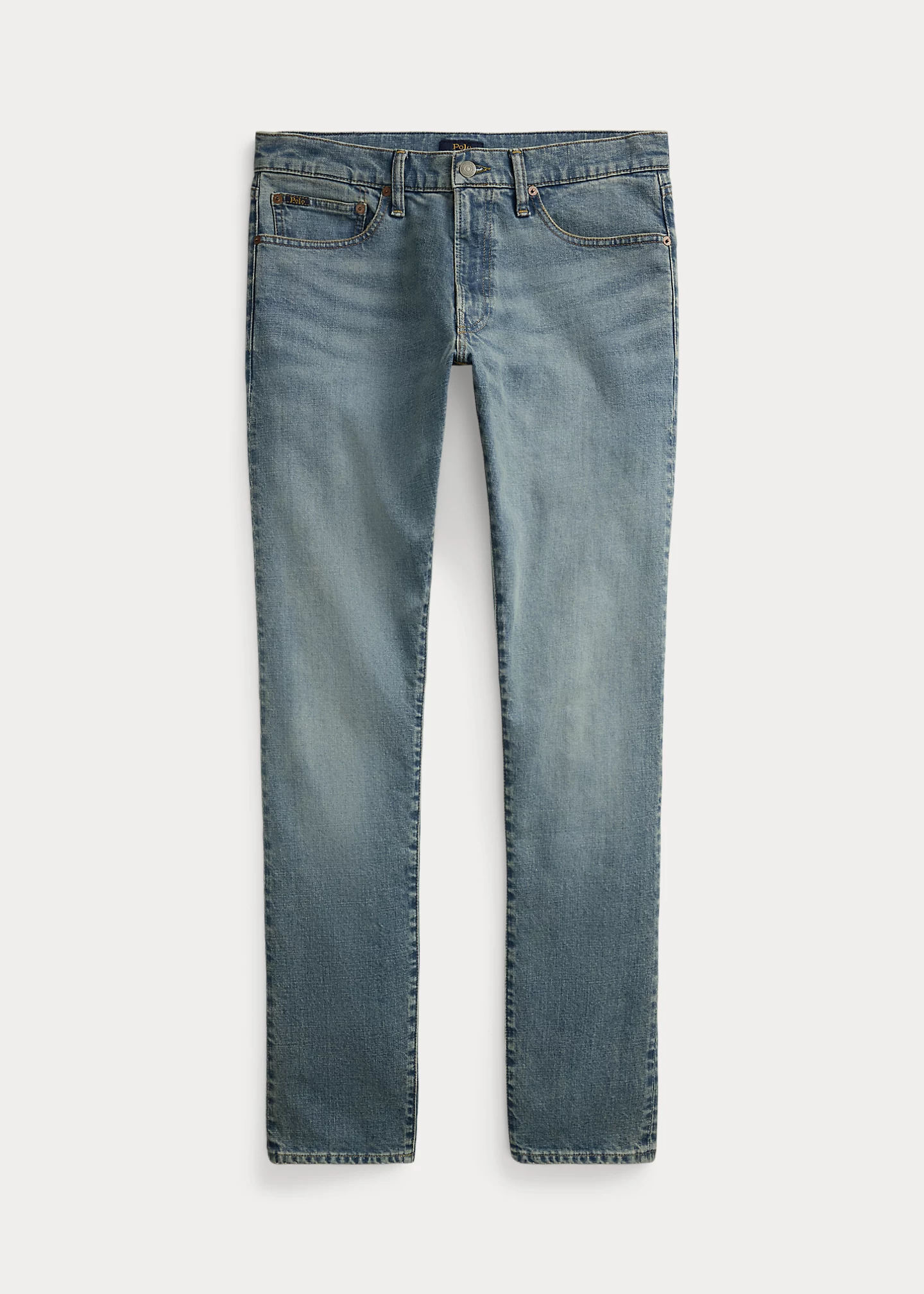 - Five-pocket styling with signature metal rivets. Leather “Polo Ralph Lauren” patch at the back right waist.