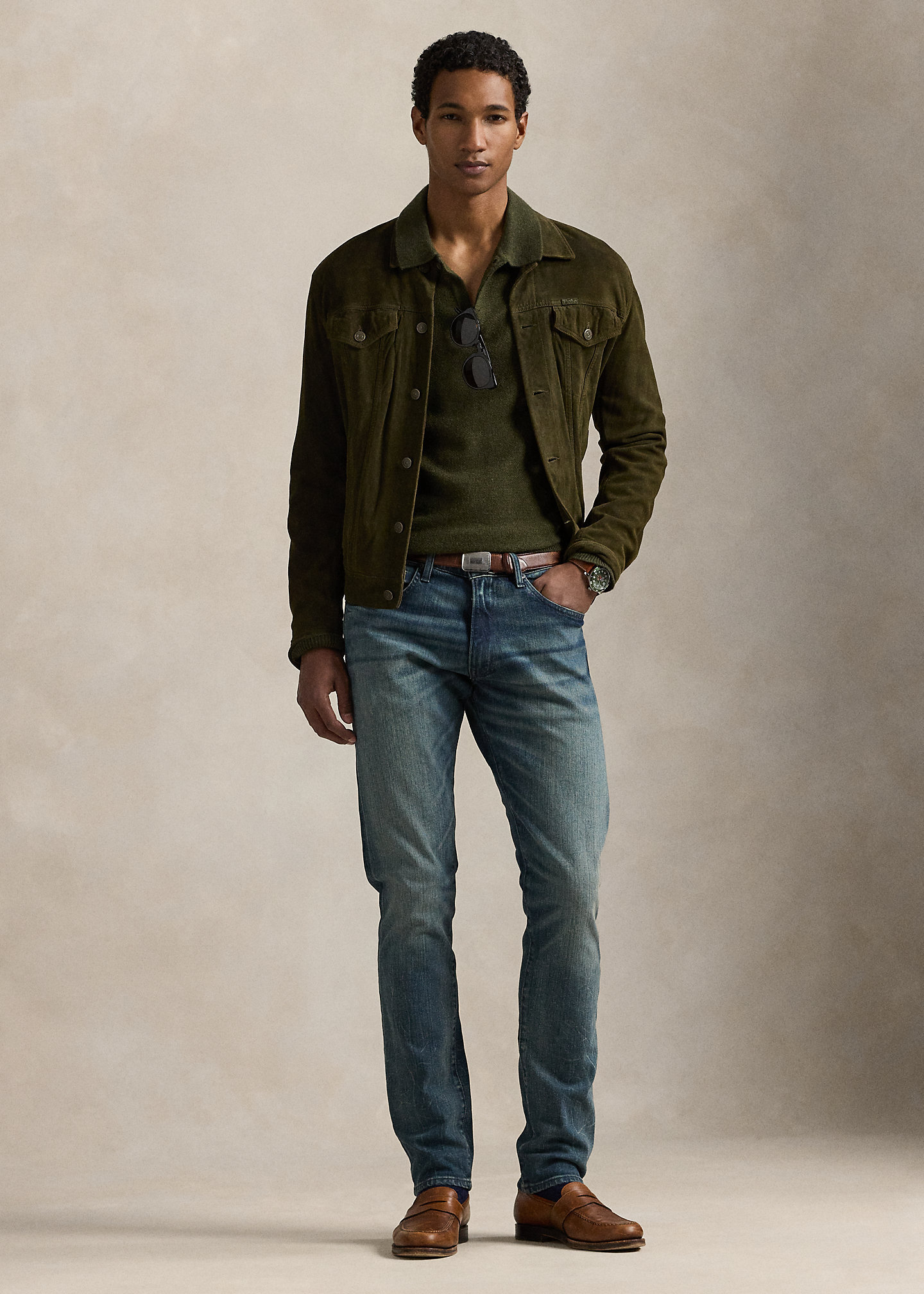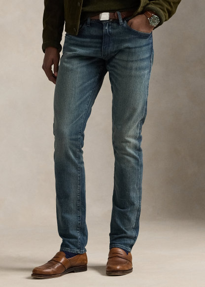 - Five-pocket styling with signature metal rivets. "Polo" label at the coin pocket.