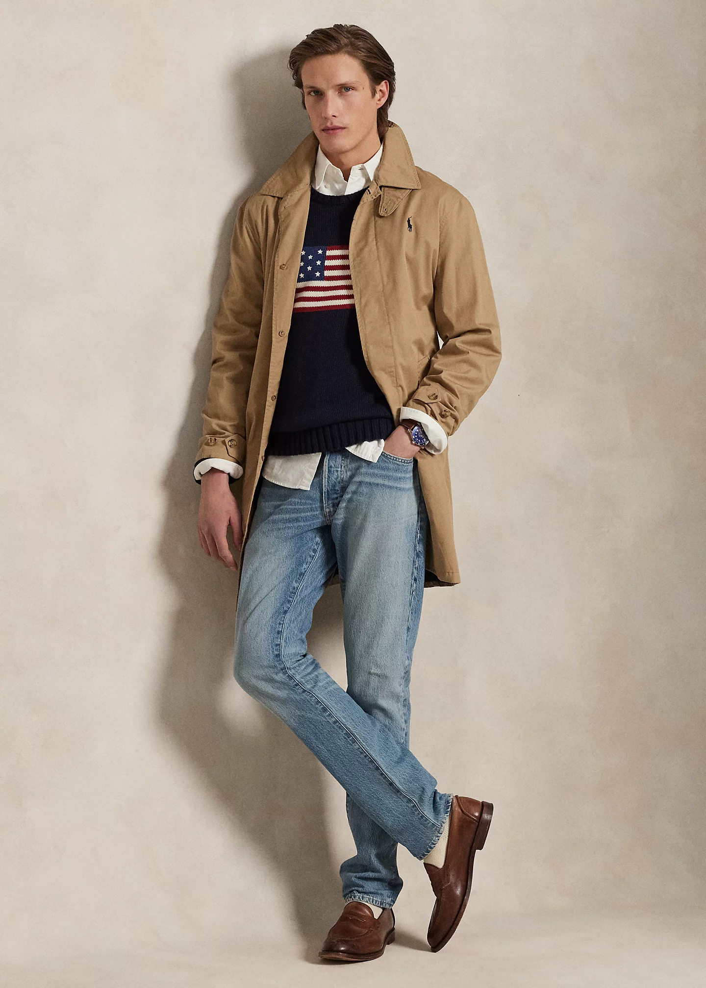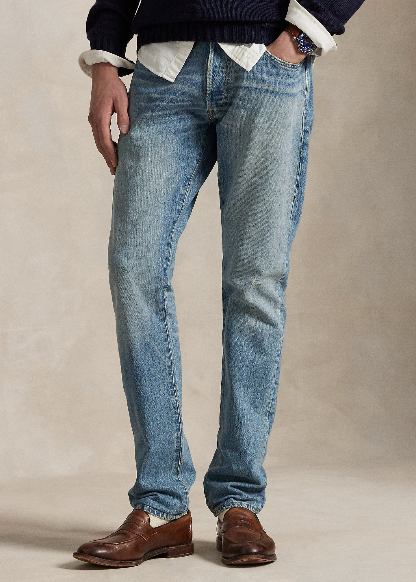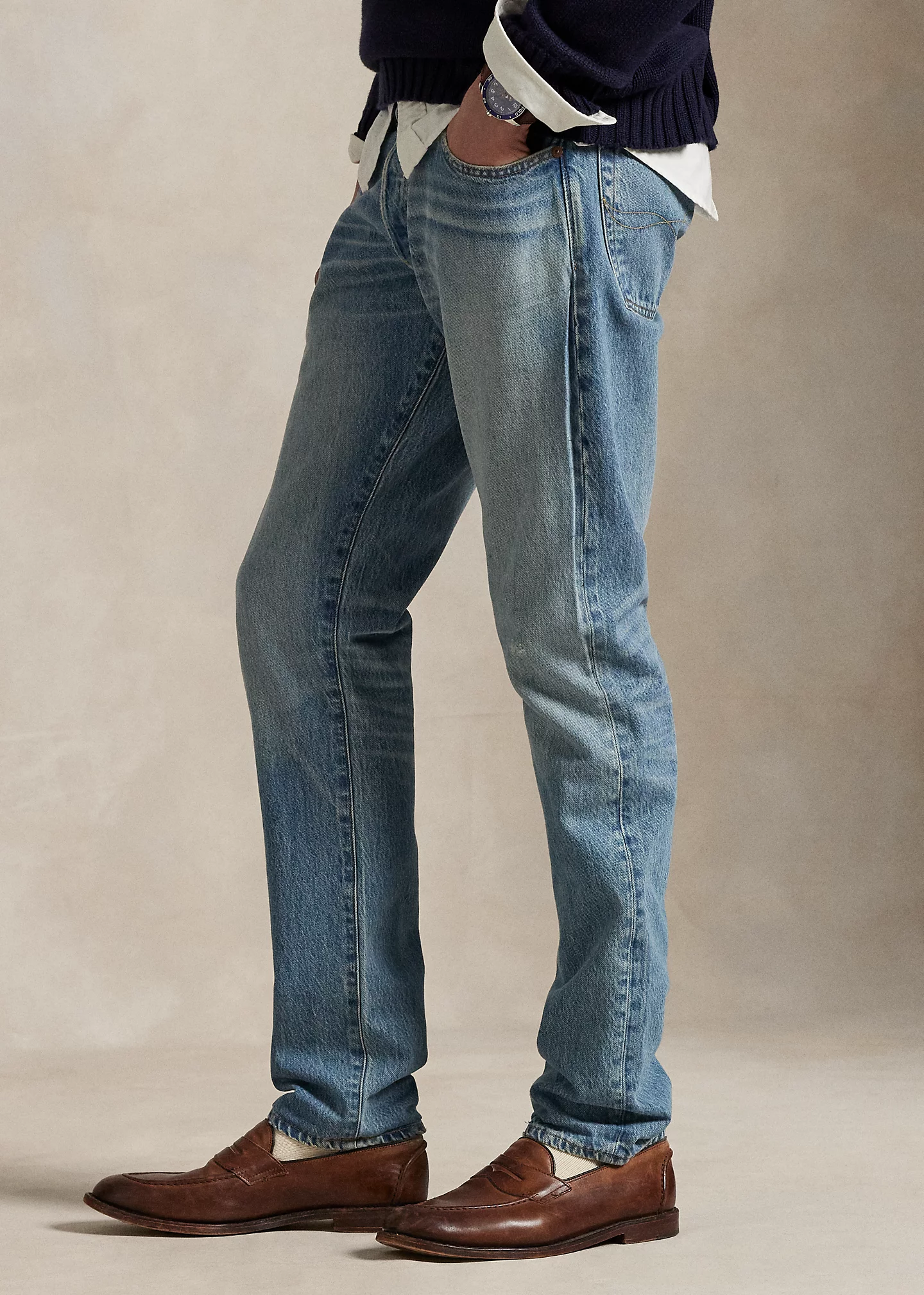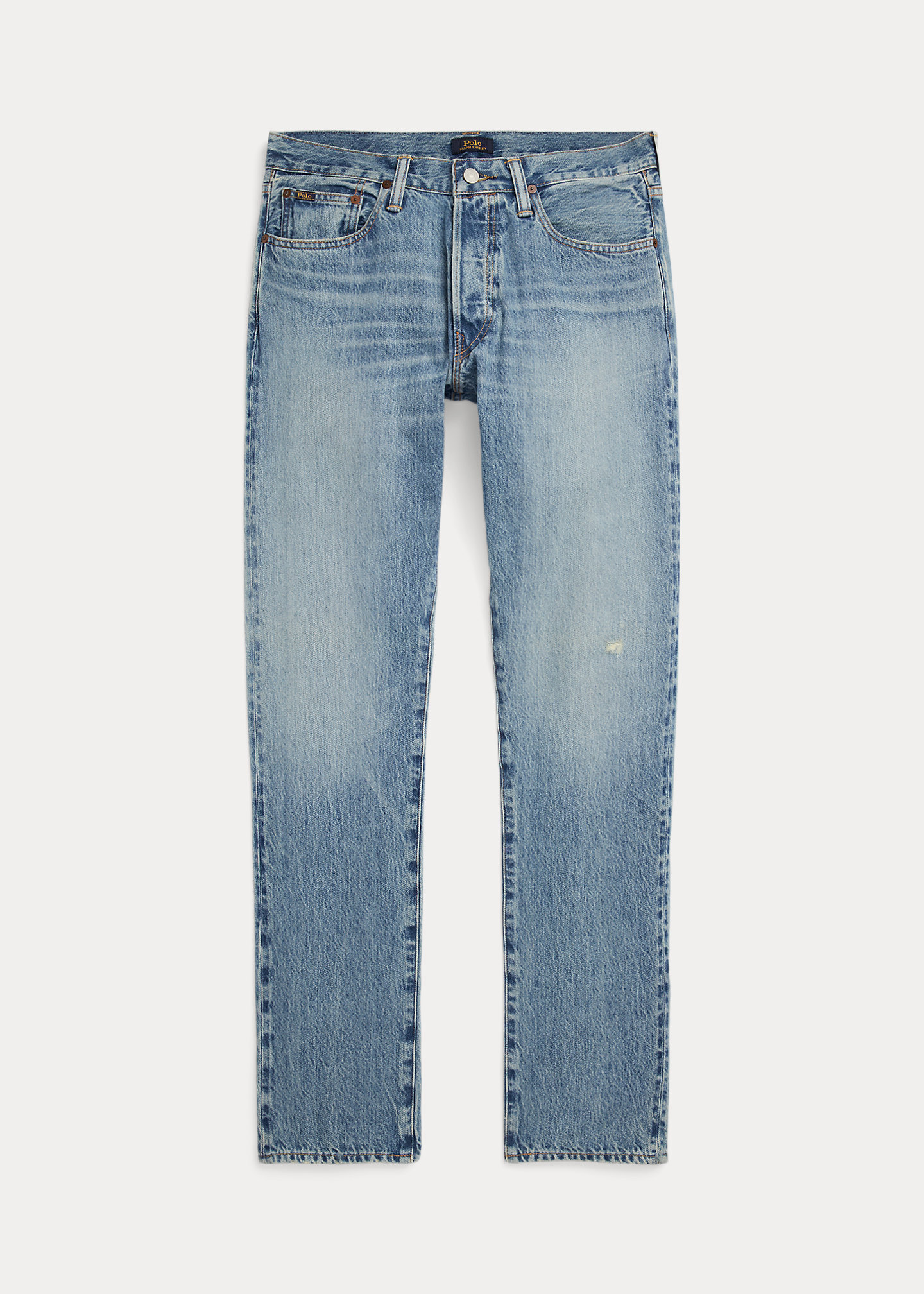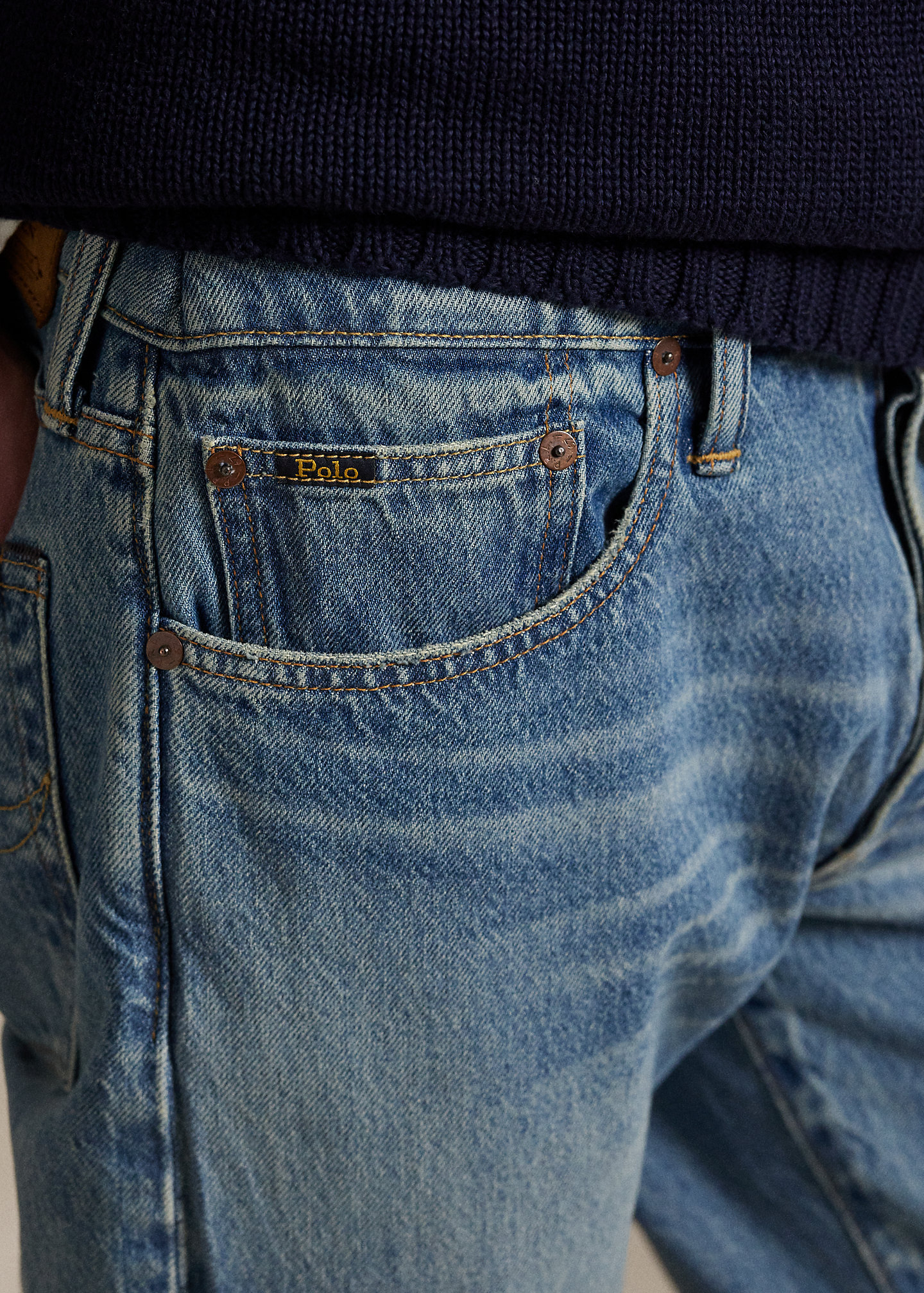 - Five-pocket styling with signature metal rivets. "Polo" label at the coin pocket.
