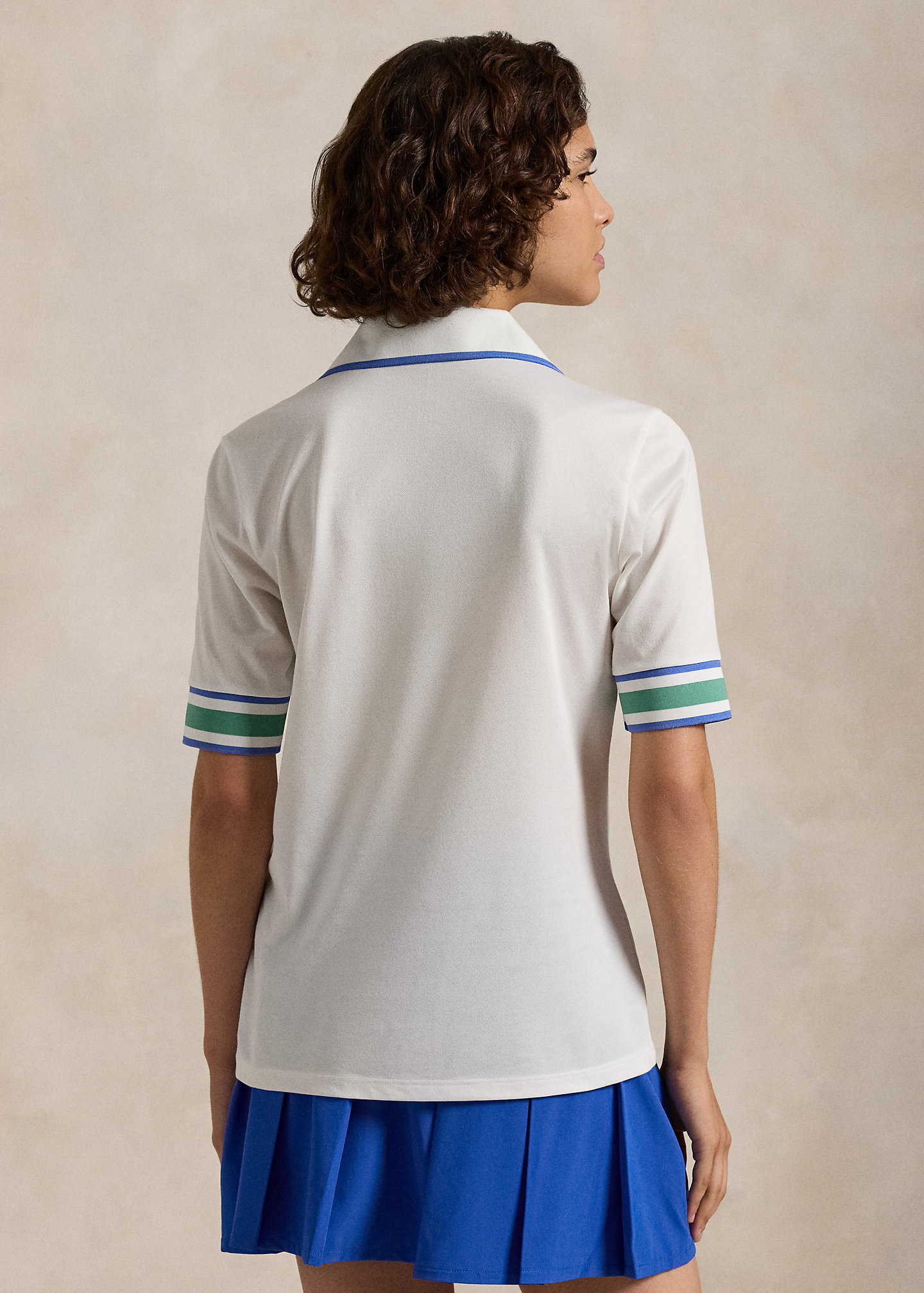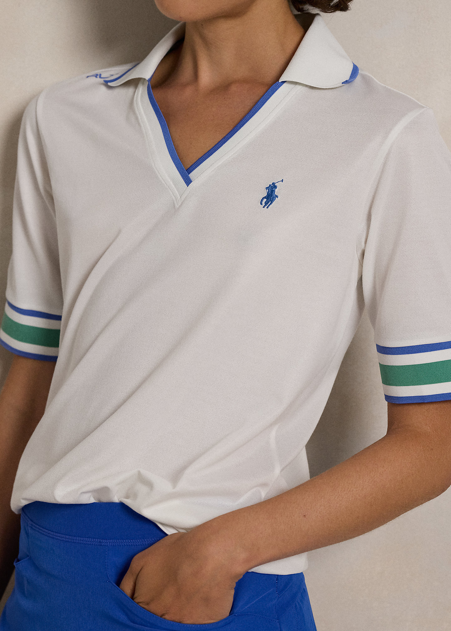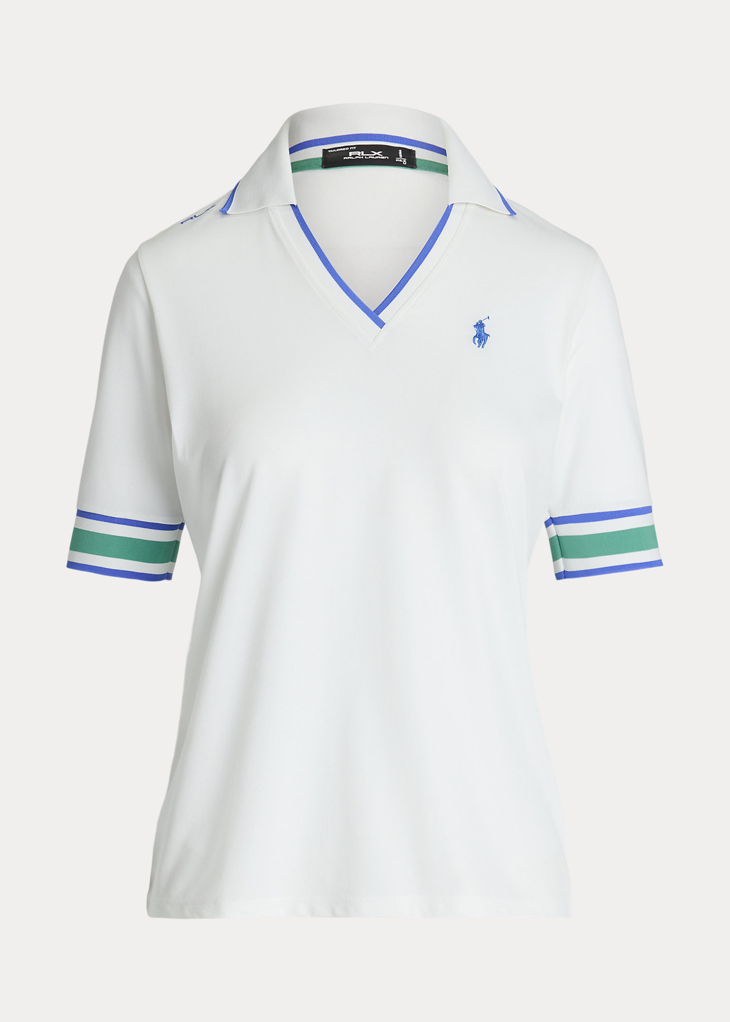- Polo collar and V-neck with contrast tipping.
