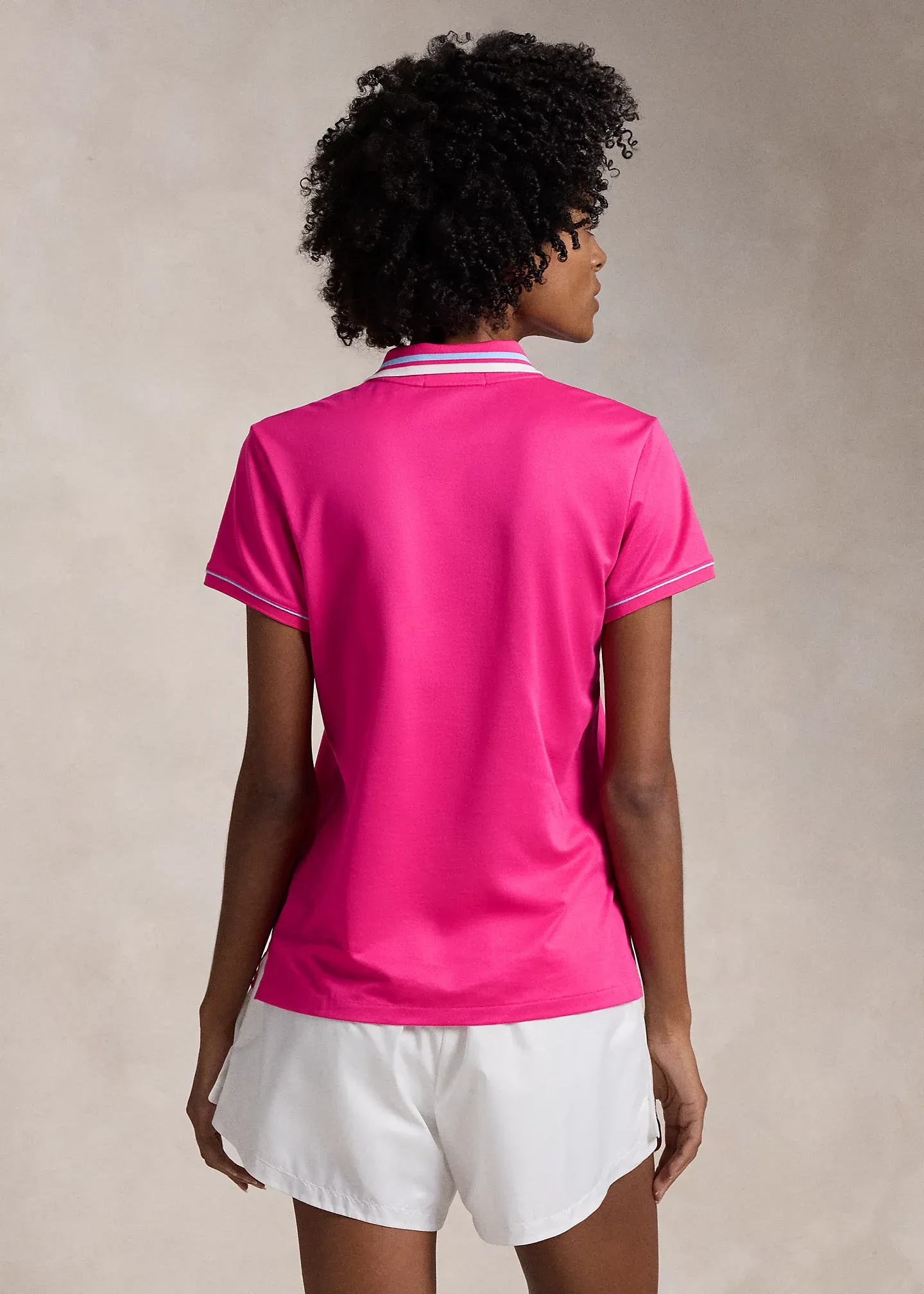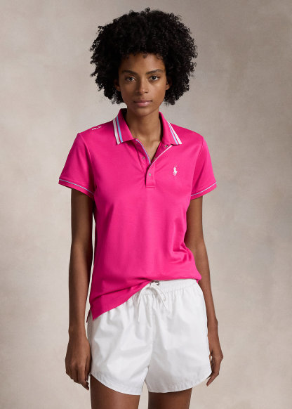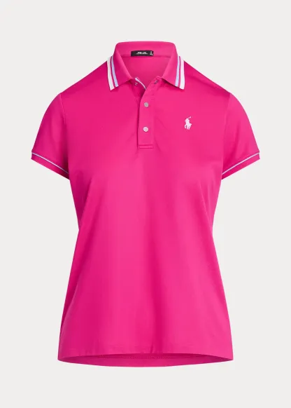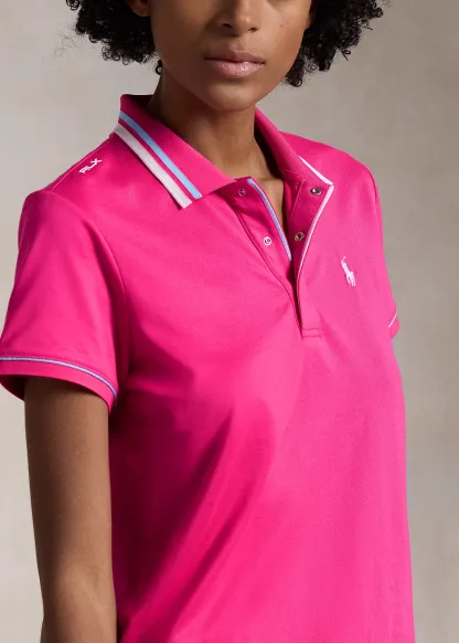 - Ribbed Polo collar with striped tipping. Three-snap placket. “RLX”-engraved snaps.