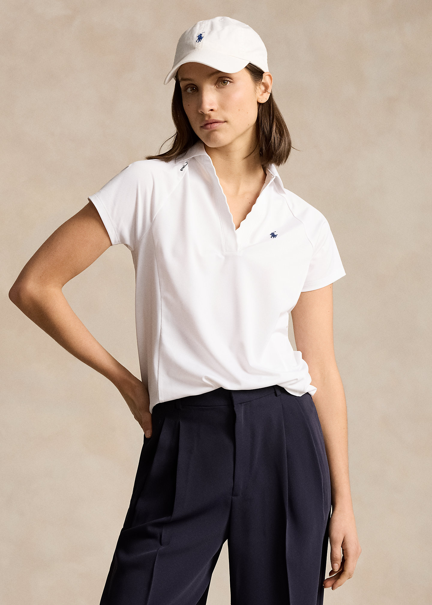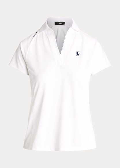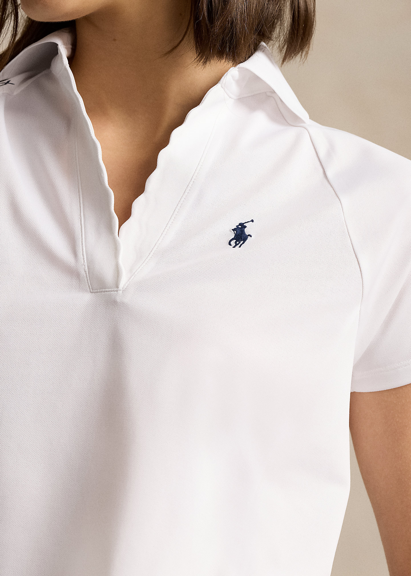 - Ribbed Polo collar. Split placket with scalloped edges.