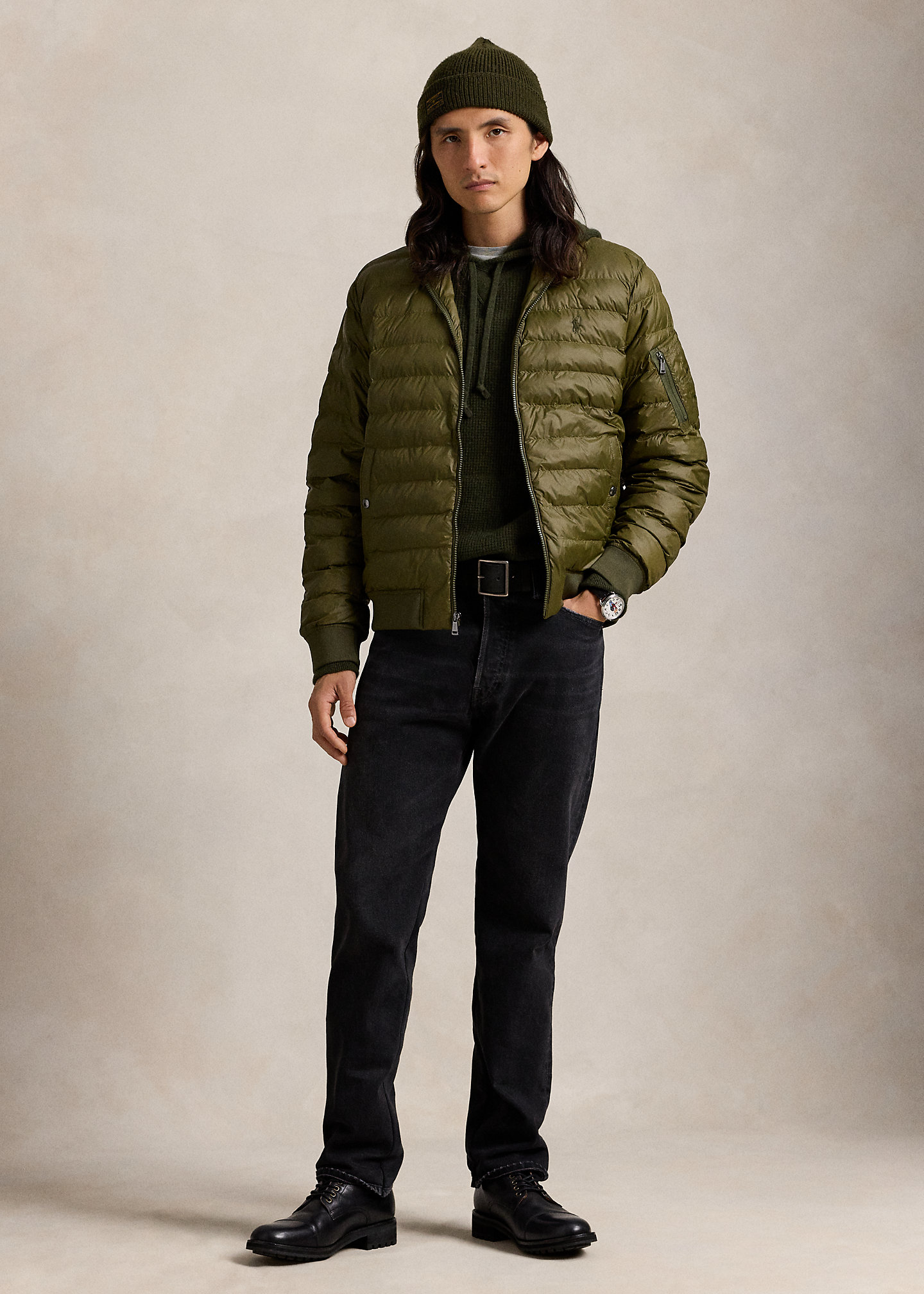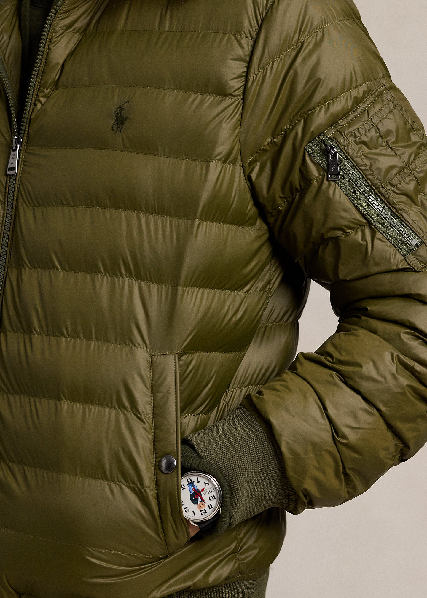 - Long sleeves with ribbed cuffs. Left sleeve zip pocket.