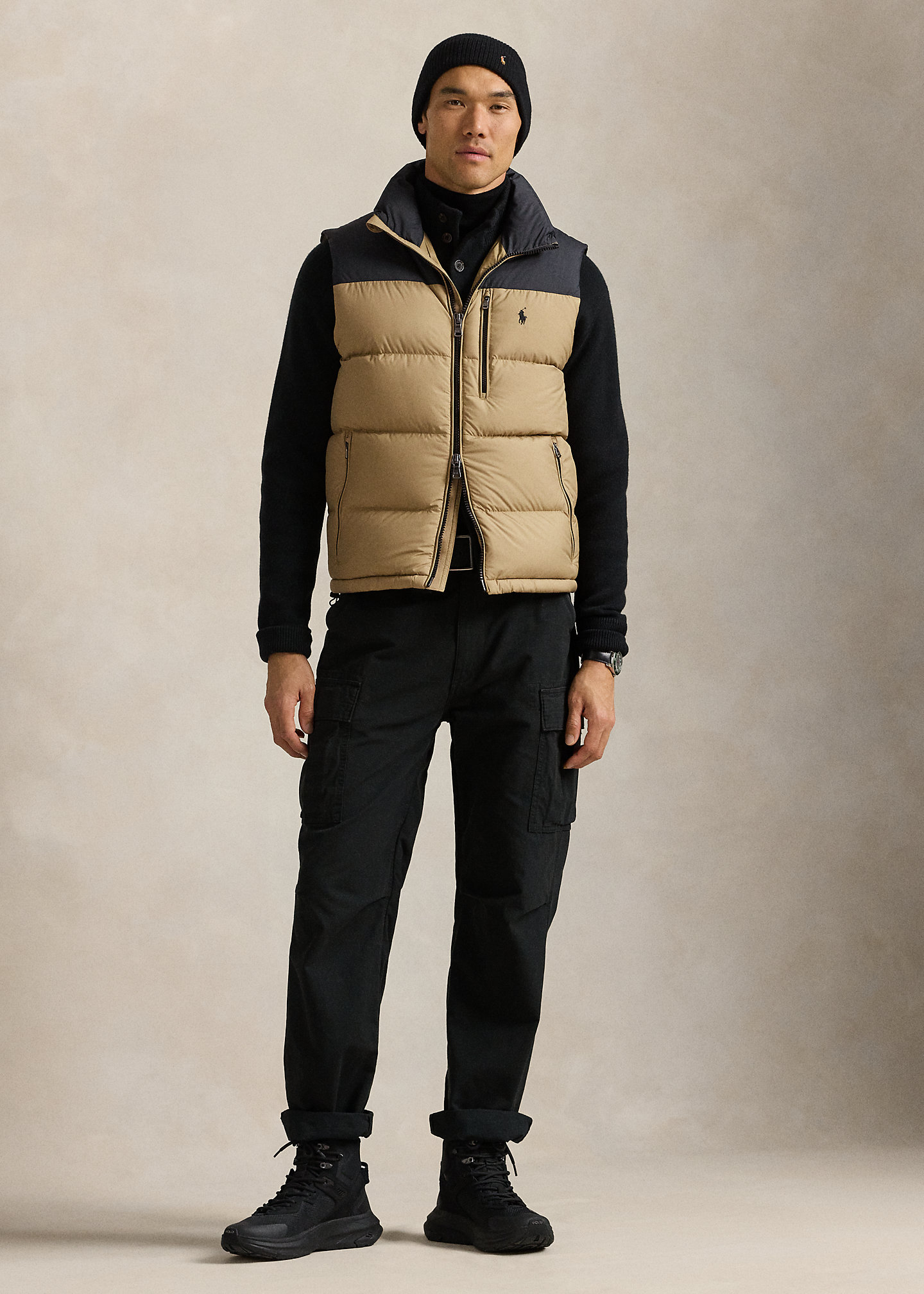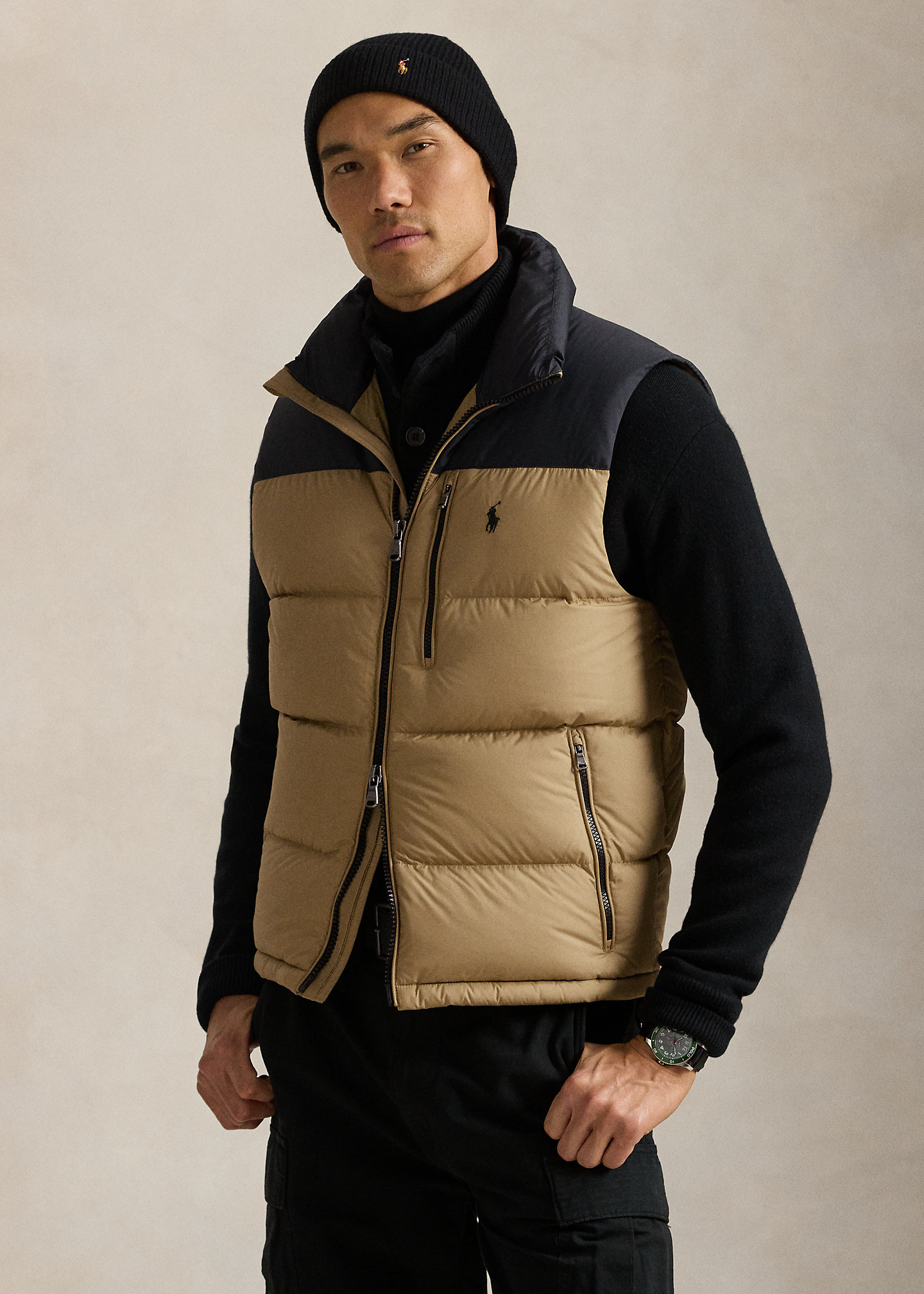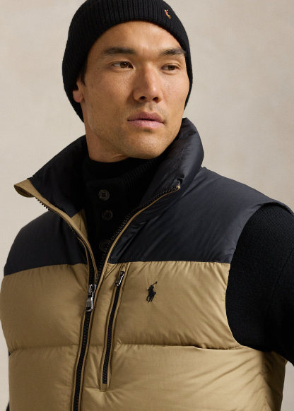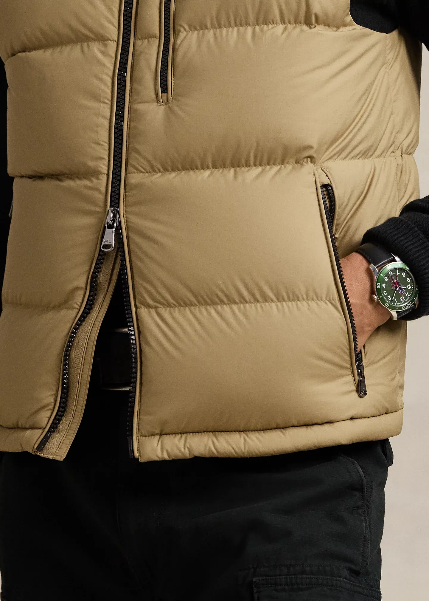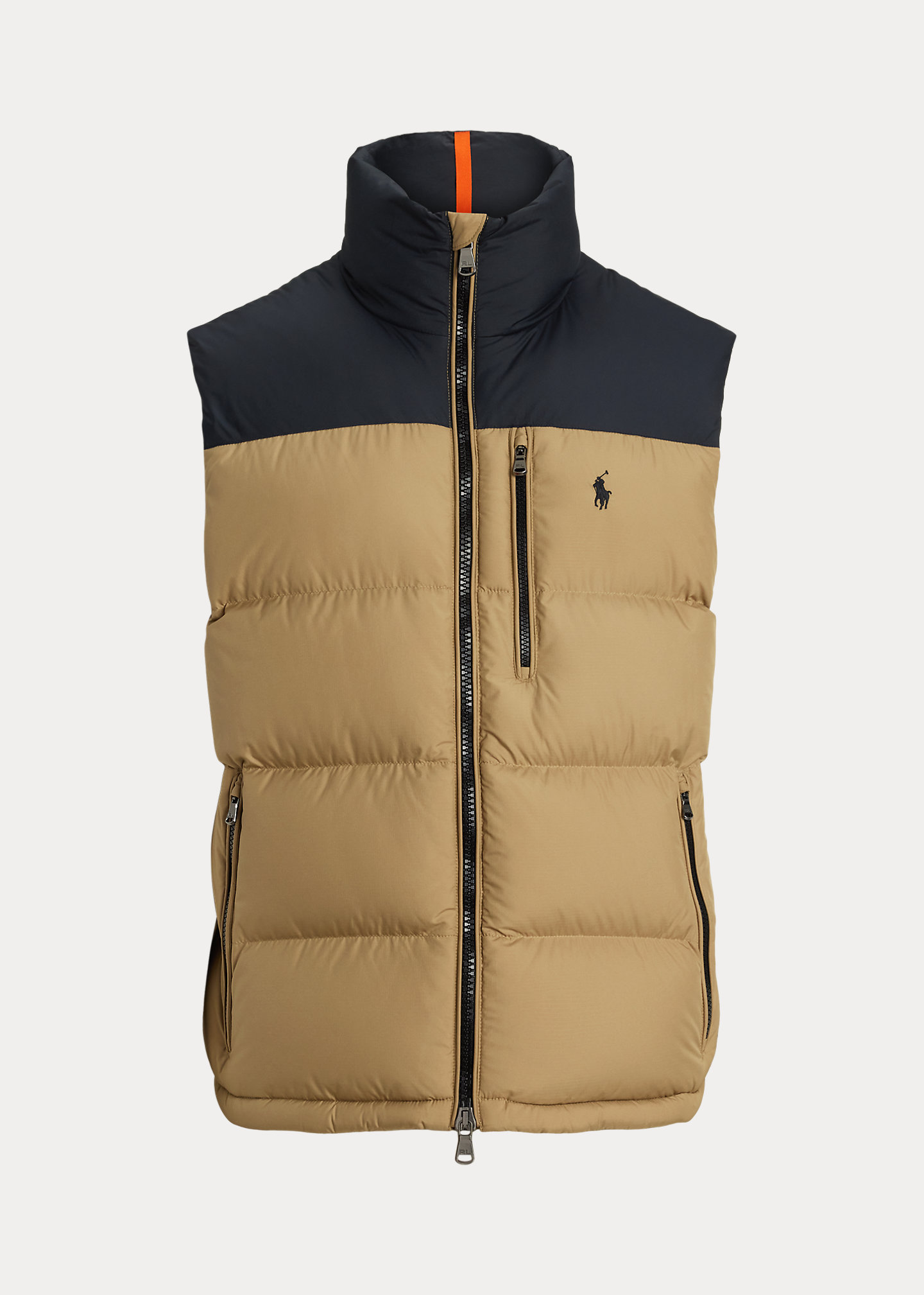 - Mockneck. Two-way full-zip front with a storm guard and a flap at the top that prevents chafing. Left chest zipped pocket. Two front waist zipped pockets. Interior right chest pocket. Drawstring hem. Fully lined and filled.
