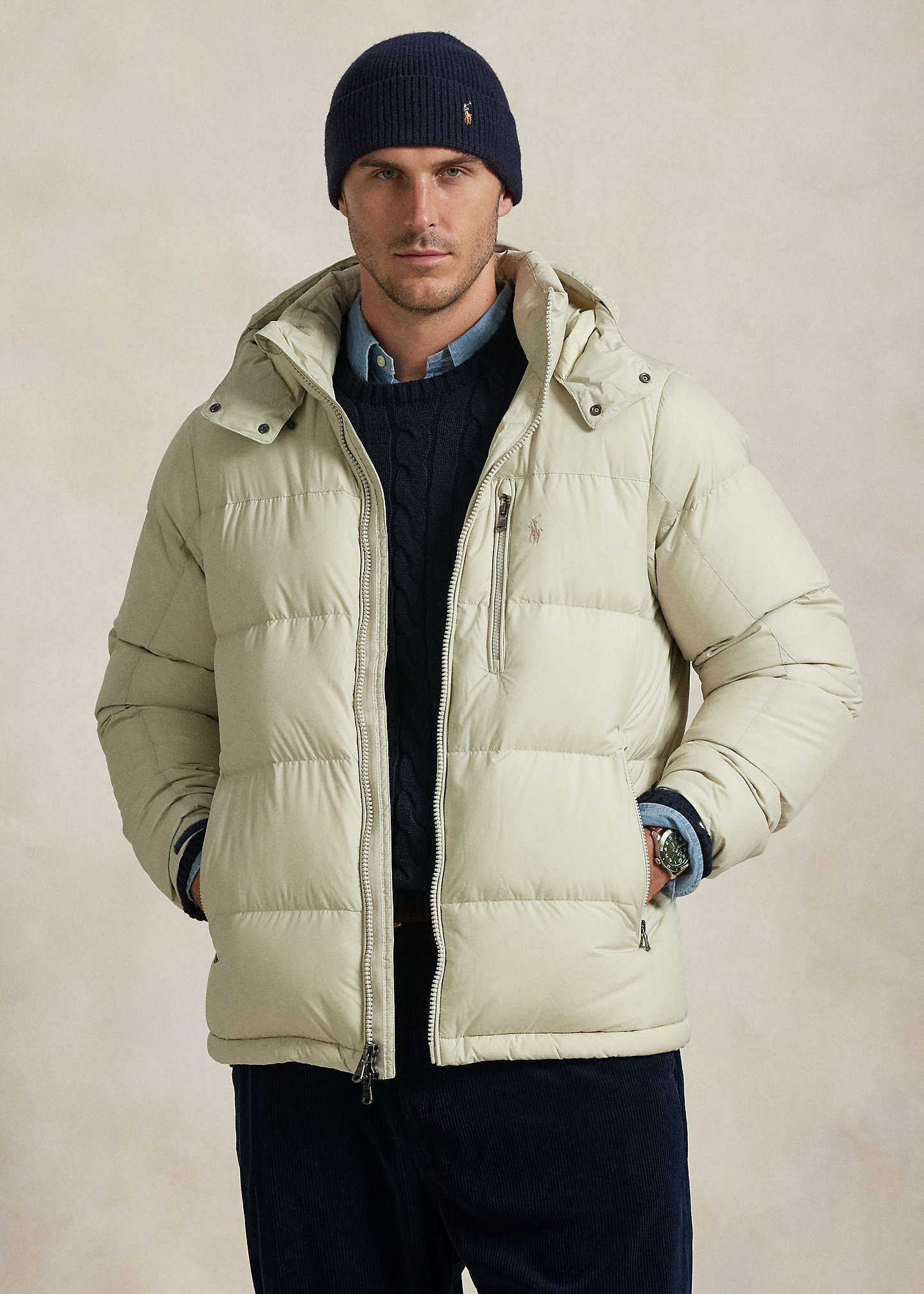 - Left chest zipped pocket. Two front waist zipped pockets. Interior right chest pocket. Drawstring hem. Fully lined and filled.