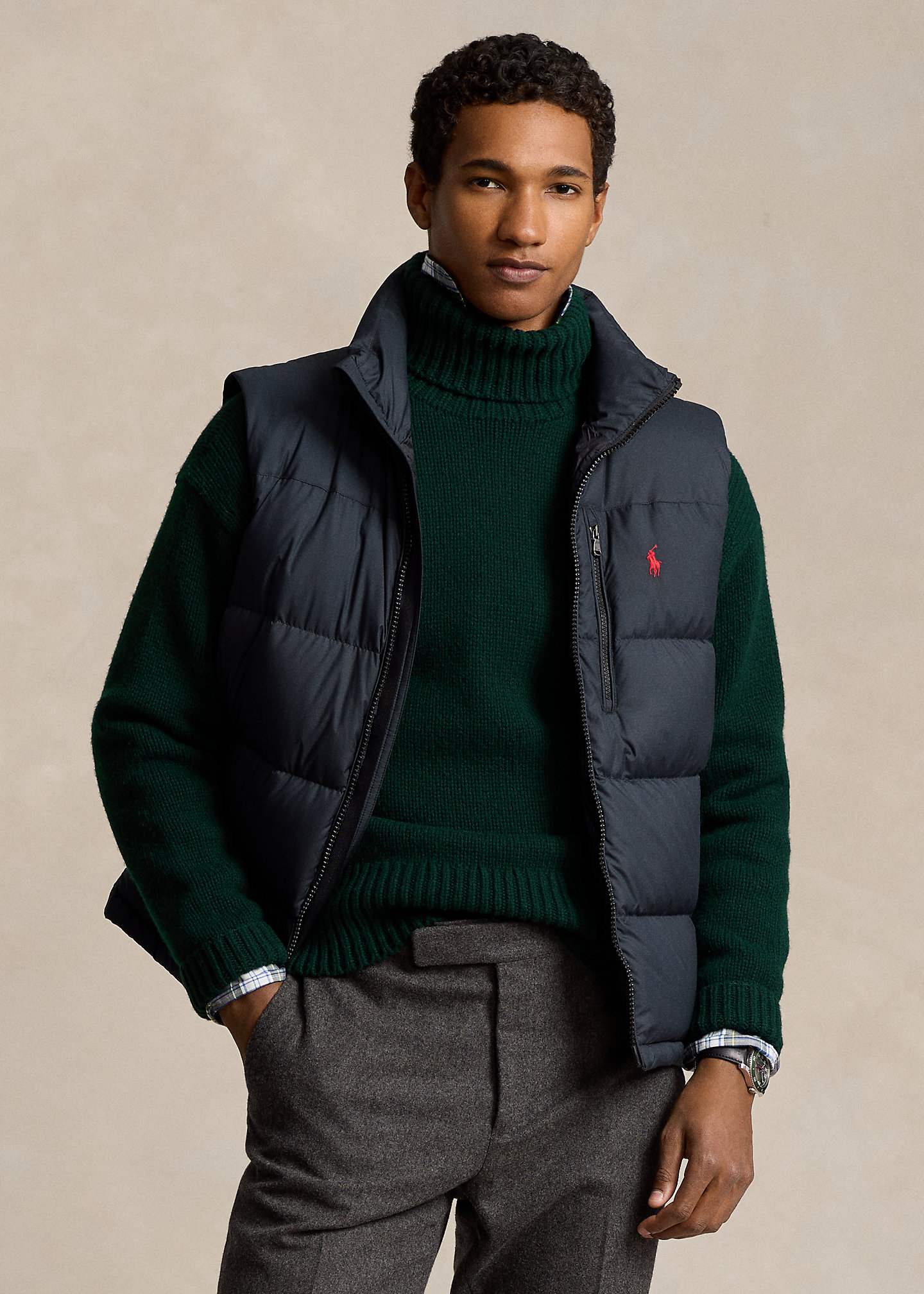 - Mockneck. Two-way full-zip front with a flap at the top that prevents chafing.